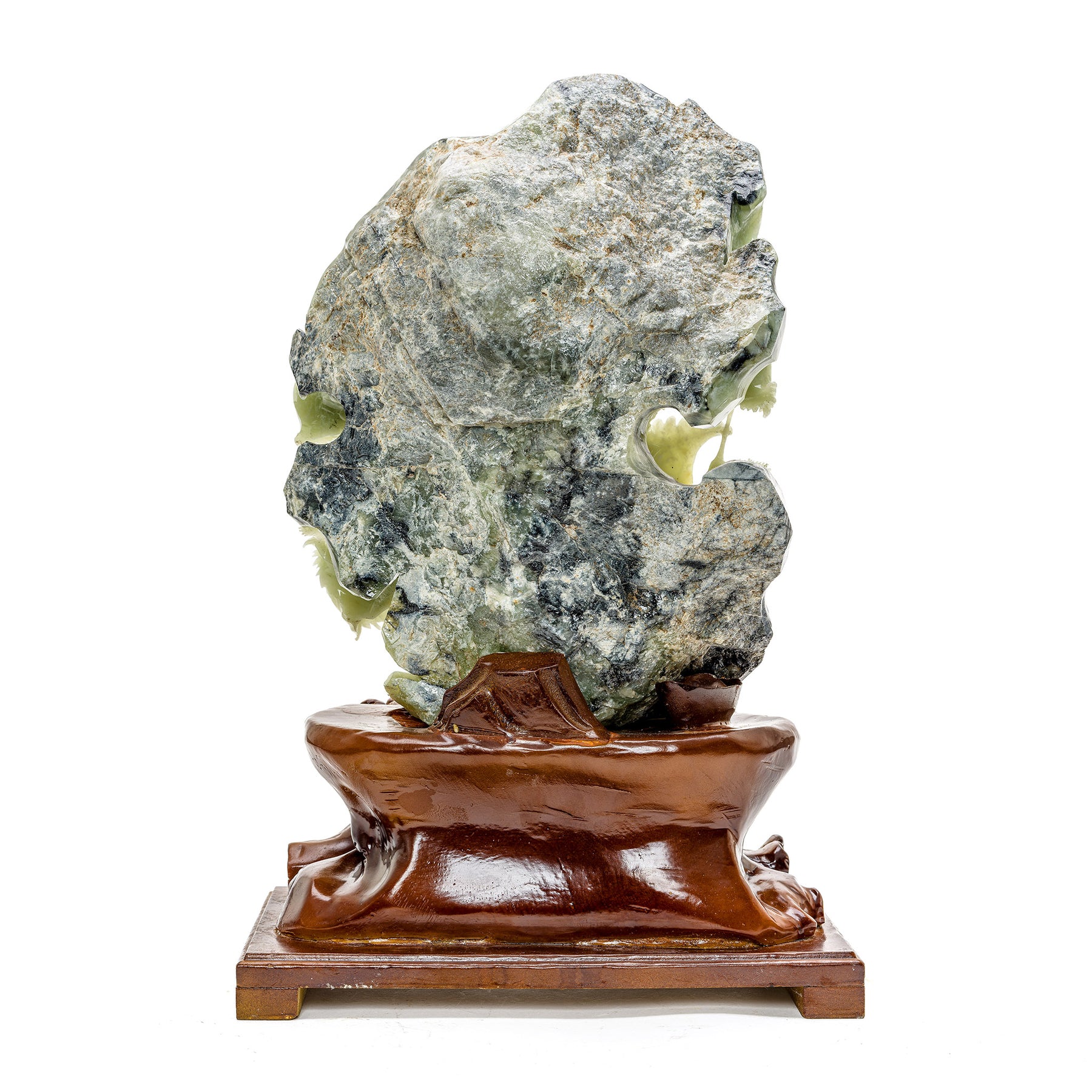 This masterpiece rests on a hand-carved wooden base, its rich tones complementing the cool, translucent hues of the agate.