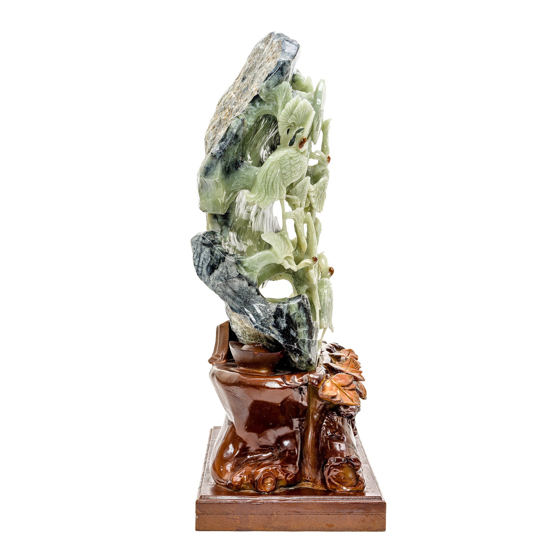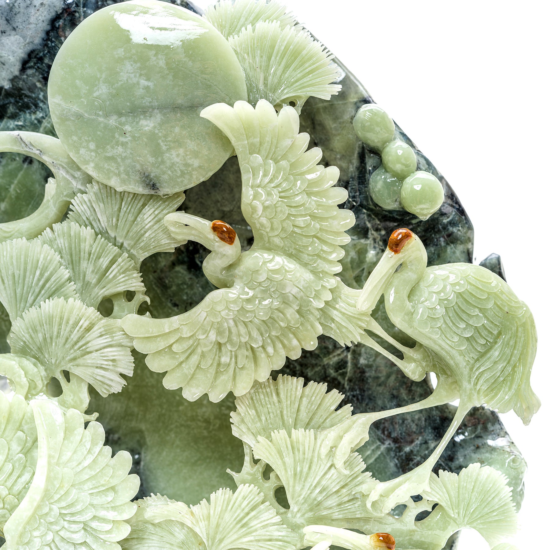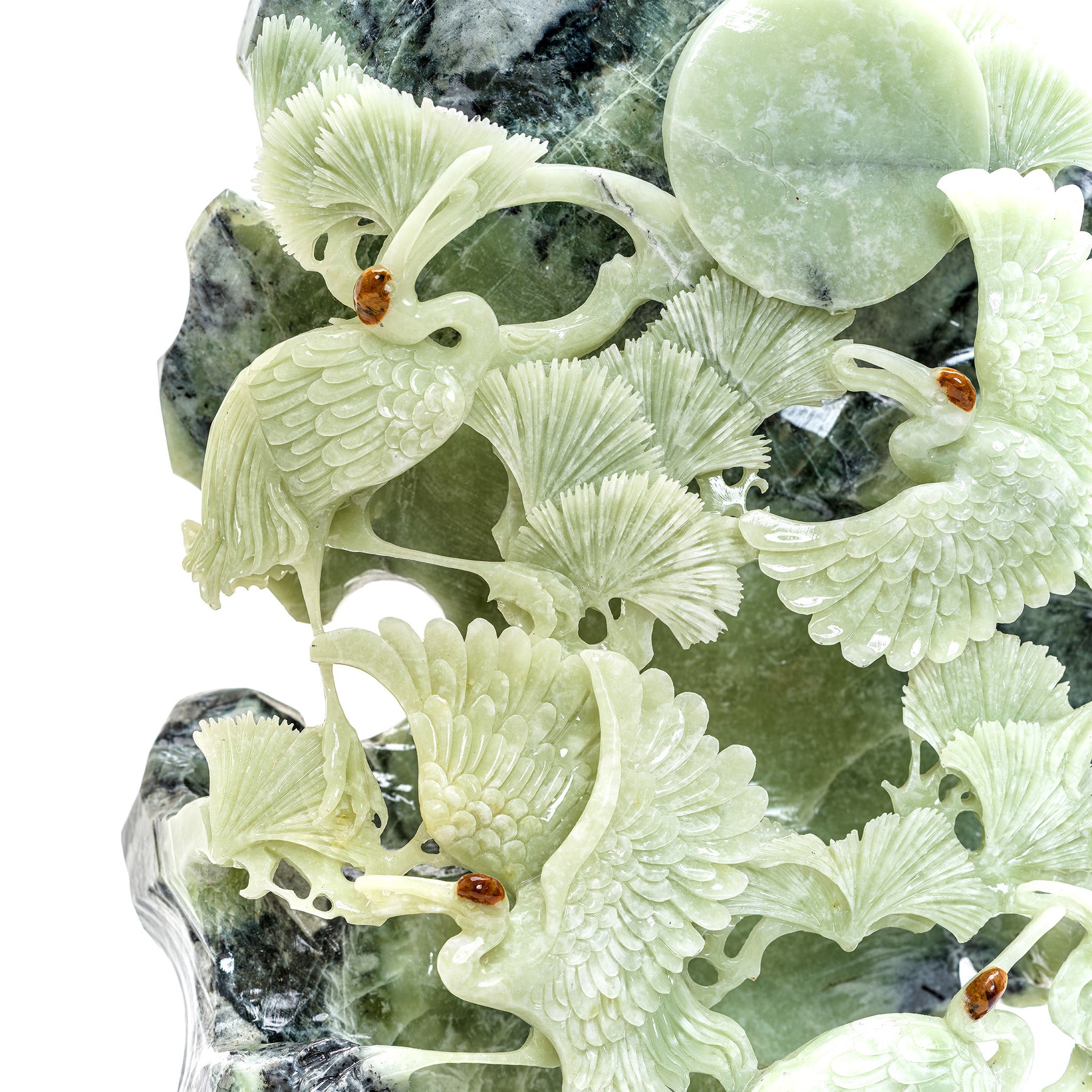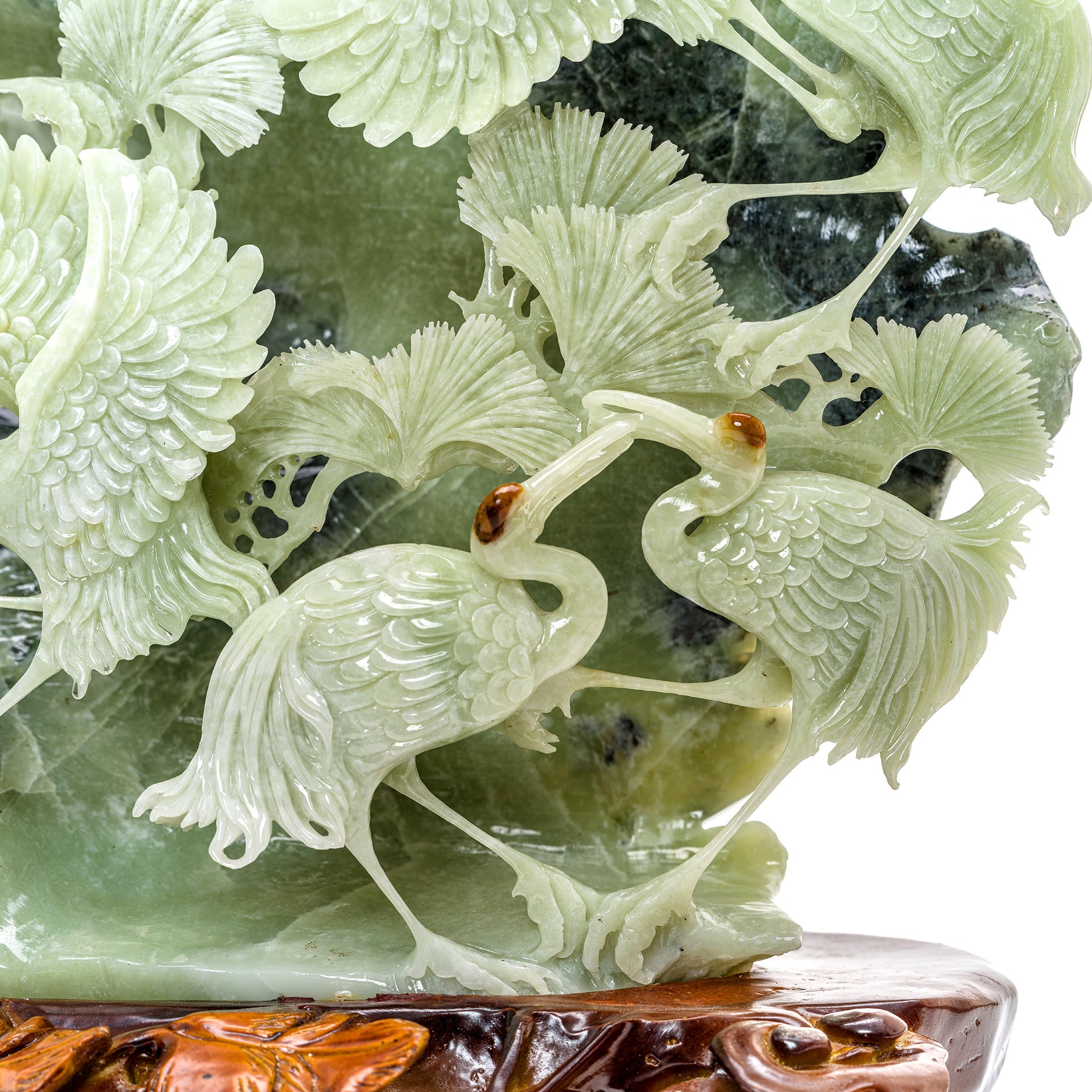The intricate carving brings forth the textured rocky ledge, contrasting beautifully with the cranes’ soft, flowing forms, creating a sculpture that feels alive with movement and grace.