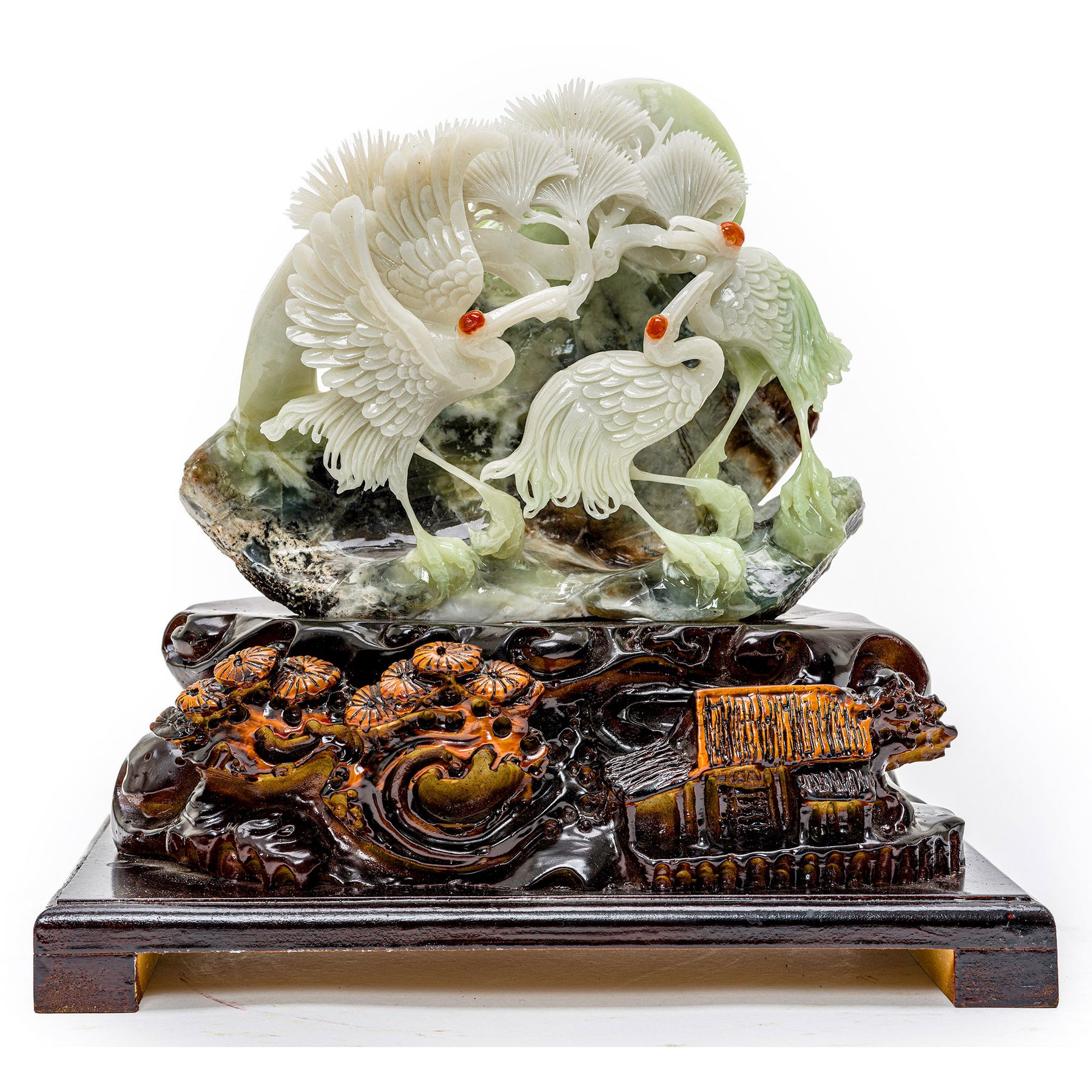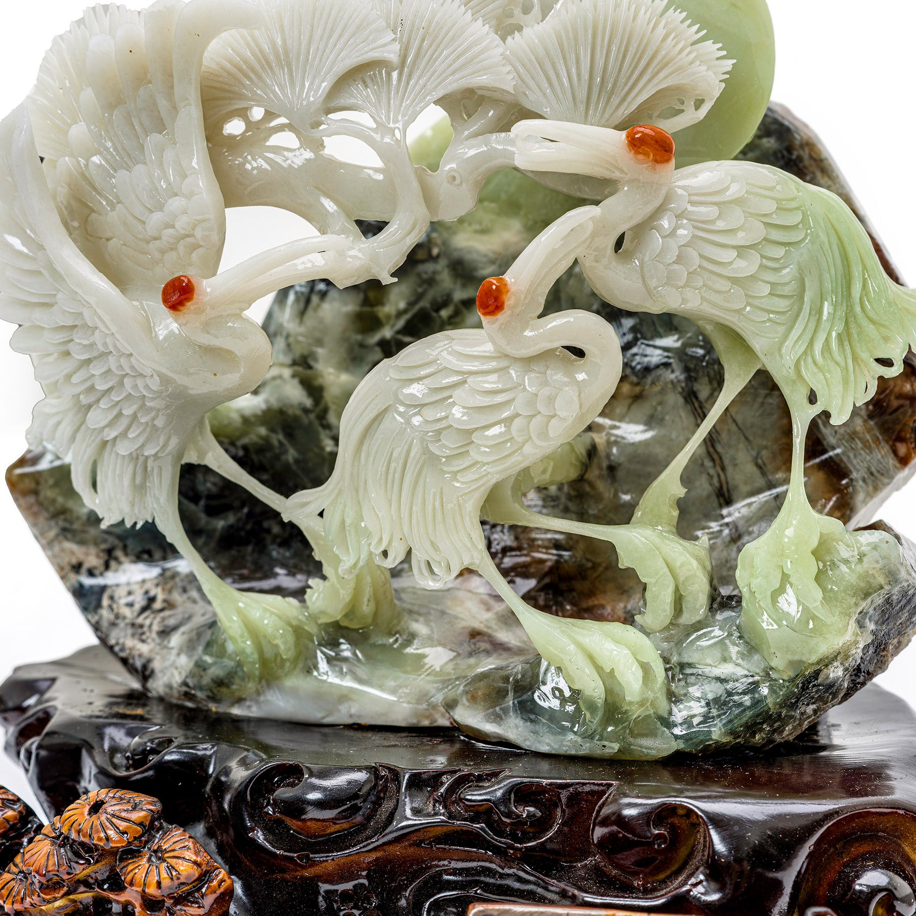 Set upon a finely crafted wooden base, the sculpture is positioned to reflect the natural habitat of cranes, adding authenticity and visual interest. The base itself is a work of art, with detailed carvings that complement the scene above.