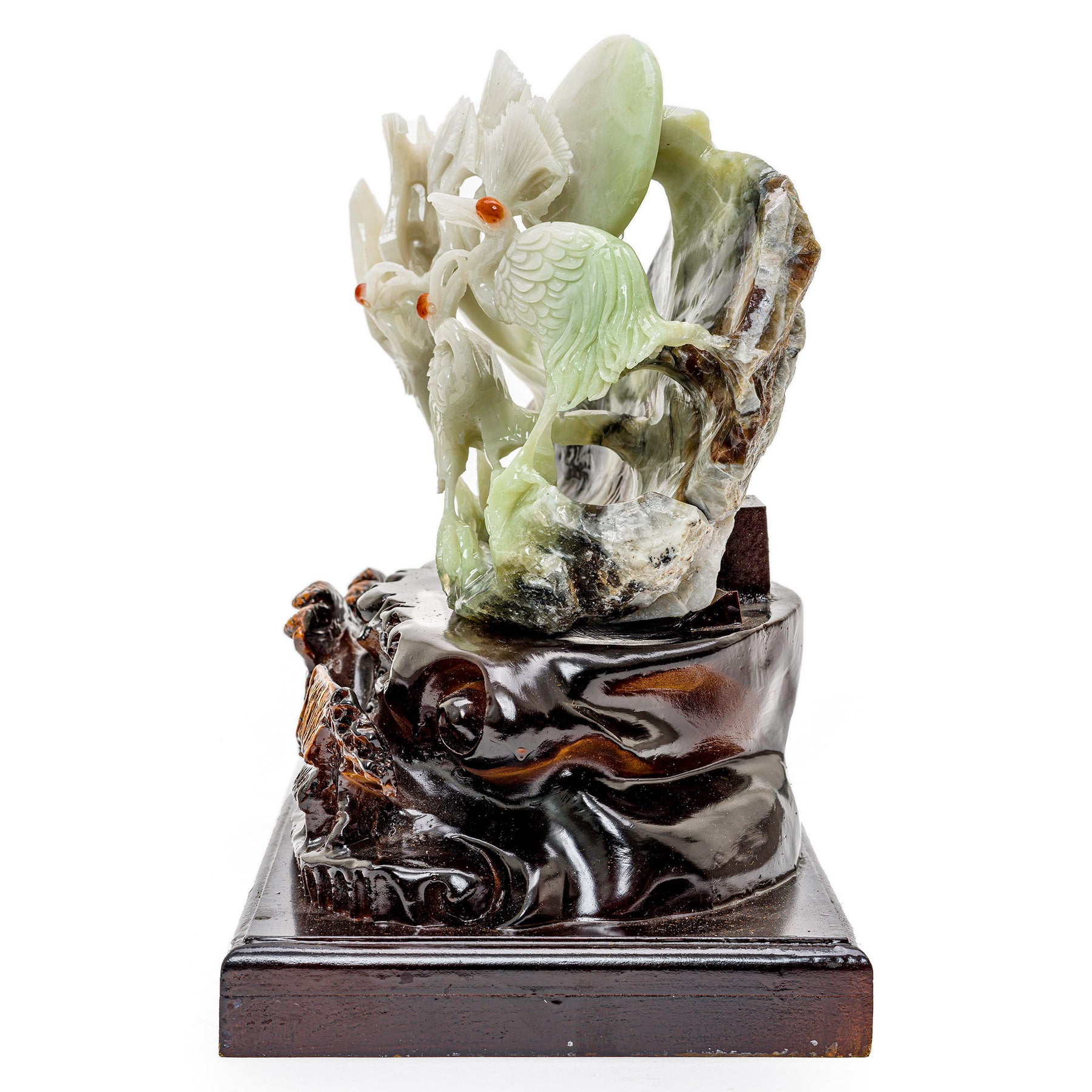 Hand-carved agate sculpture of three cranes on a rock ledge.