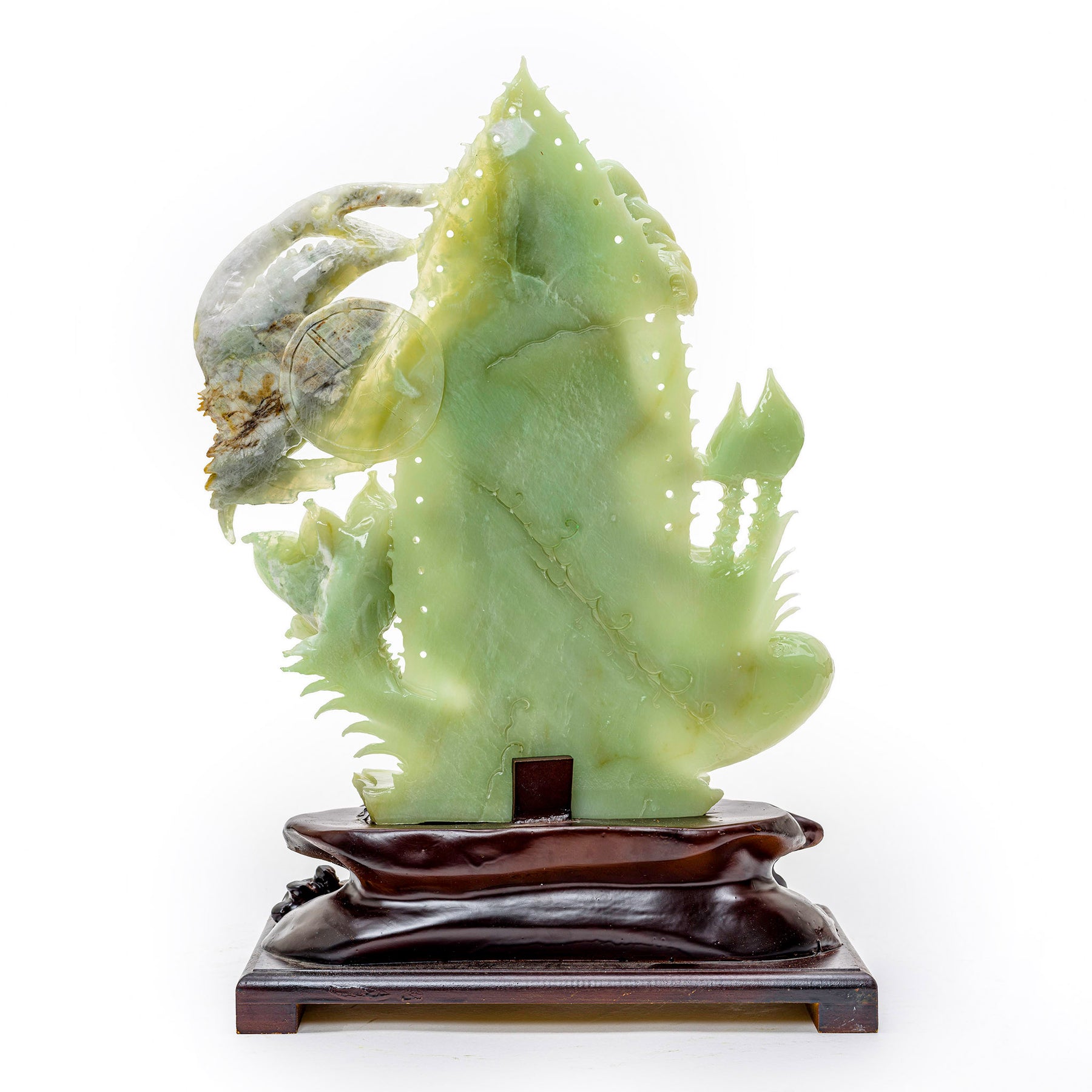 Set upon a wooden base, the sculpture is elevated to a piece of art that harmoniously unites the elements of wood and stone, nature and divinity. The woodwork complements the agate, grounding the ethereal nature of the Bodhisattva figure.