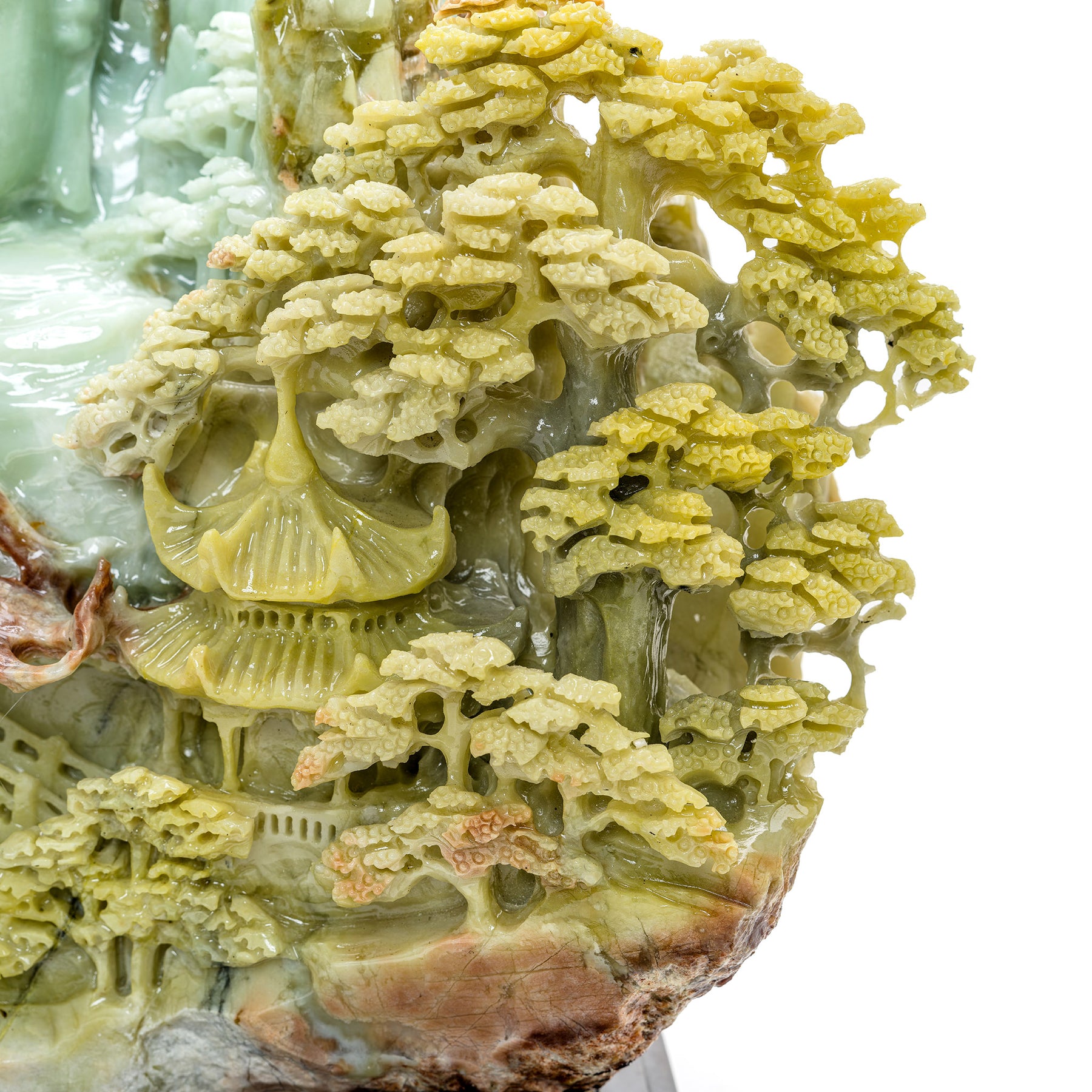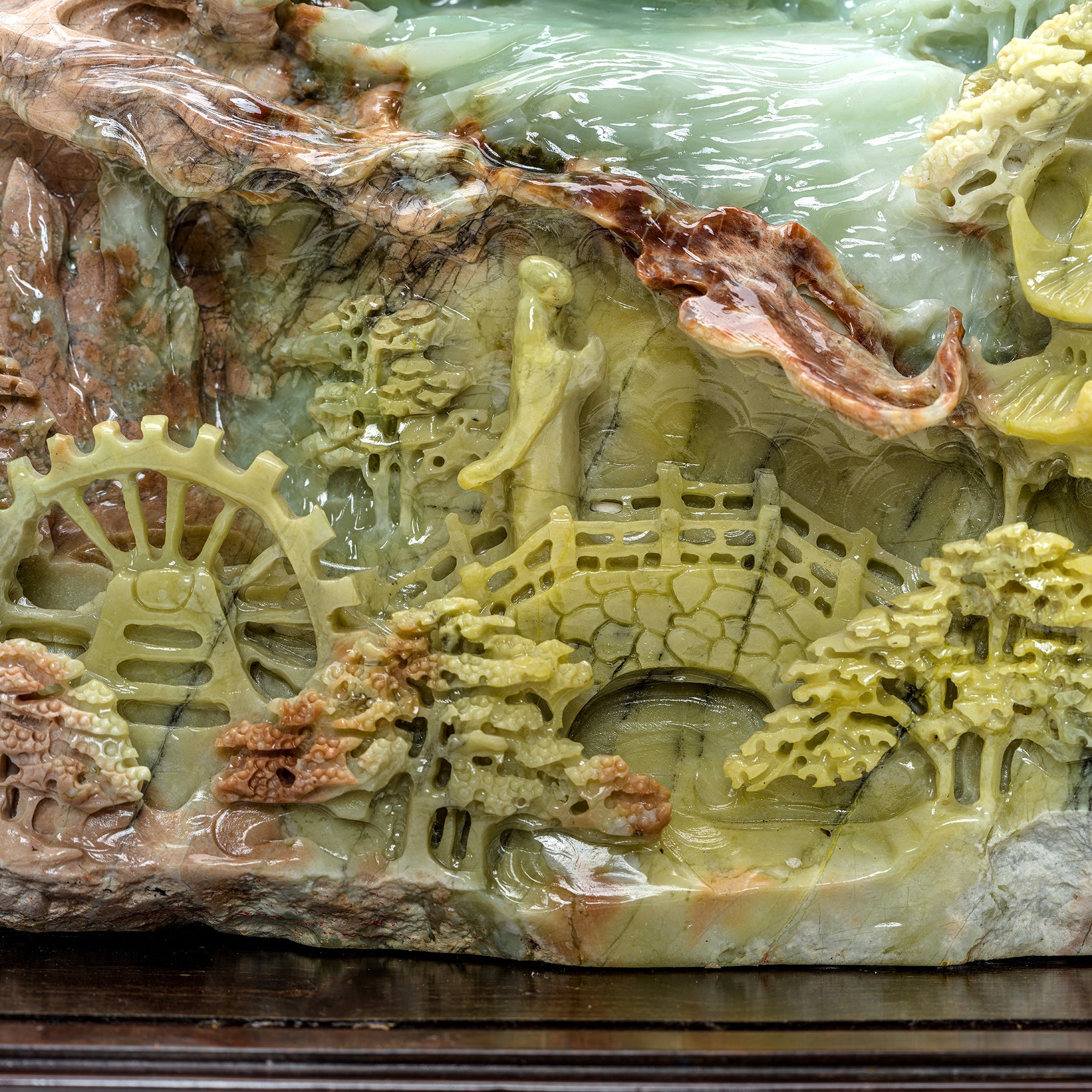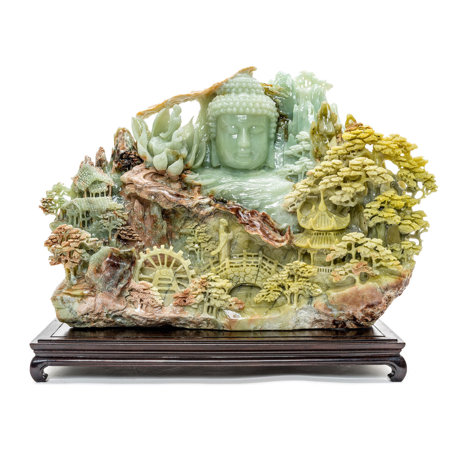 Detailed carving of Kwan Yin and mountain village in agate