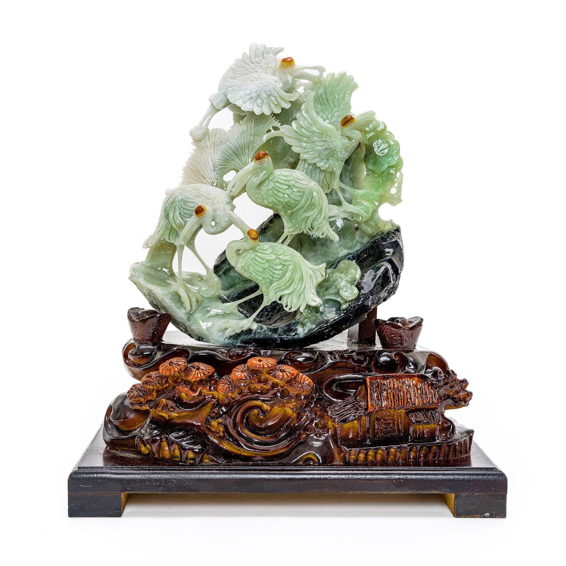 Each crane is carved with extraordinary attention to detail, their feathers rendered with fine, lifelike strokes in the agate. The varied green hues of the stone bring to life the lush hillside setting, giving the sculpture a vibrant yet soothing palette.