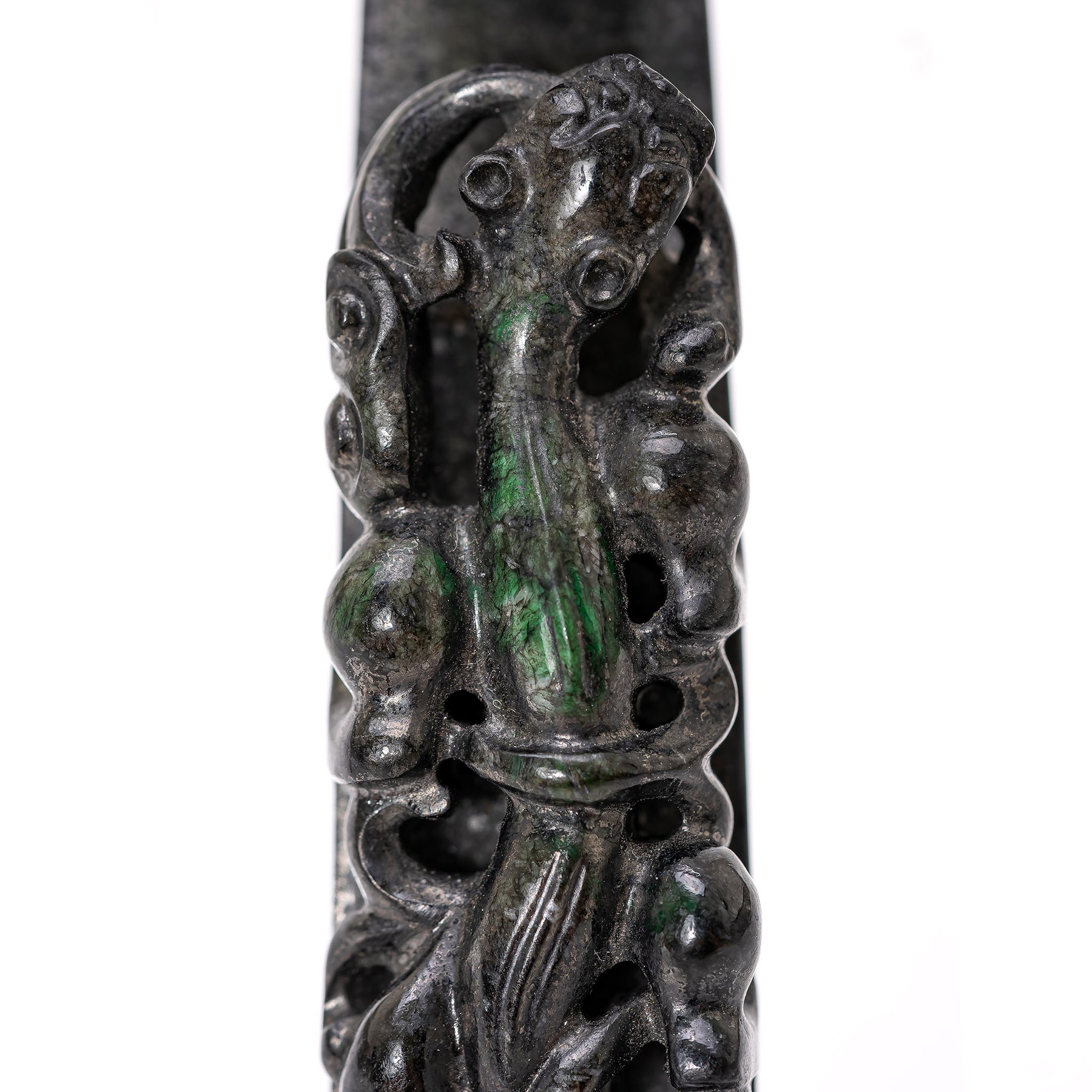 Discover the captivating allure of our Jade Belt Buckle, meticulously crafted during the 18th and 19th centuries. This remarkable accessory encapsulates the essence of ancient Chinese artistry, showcasing a fusion of grey and black jade adorned with subtle green suffusions. The dragon head terminal serves as a symbol of strength and prosperity, making it a must-have item for collectors, fashion enthusiasts, and those who appreciate the beauty of tradition.