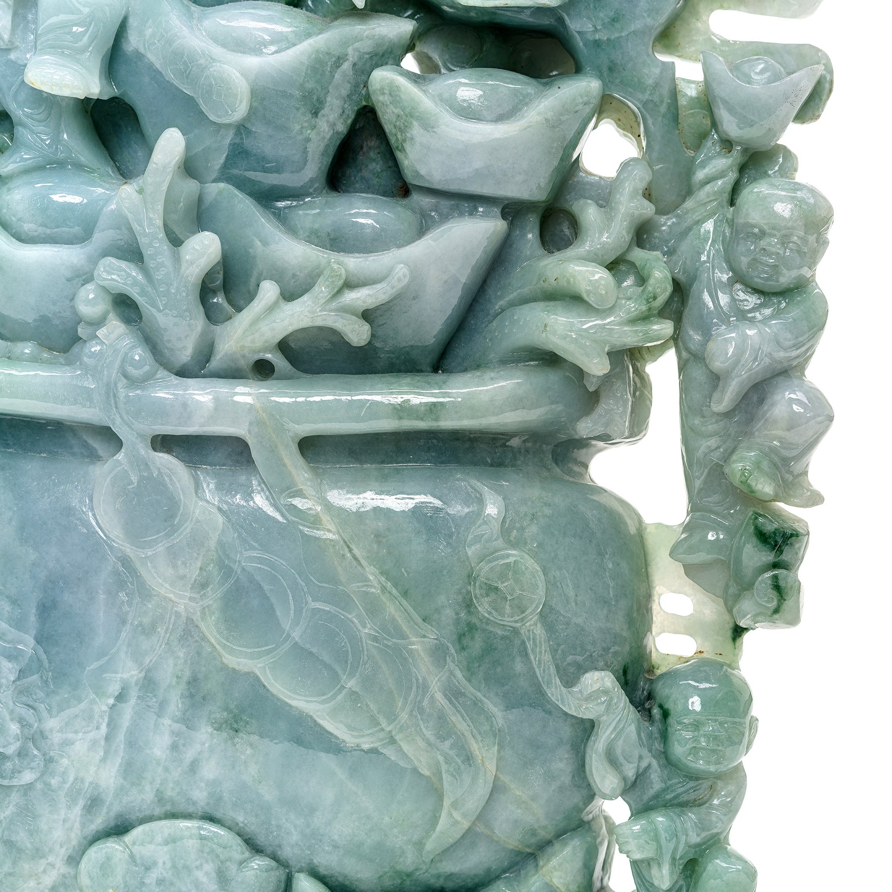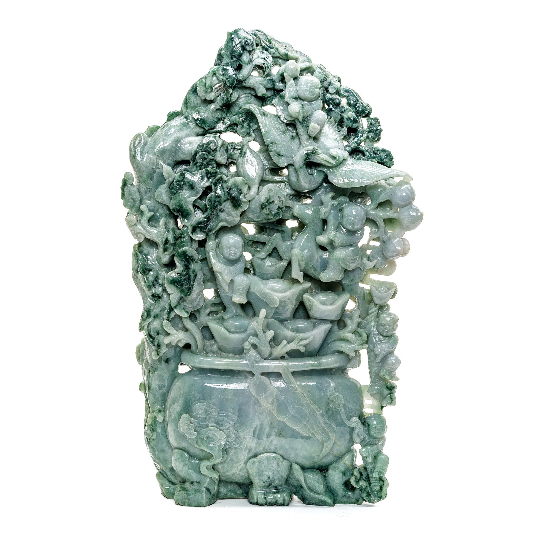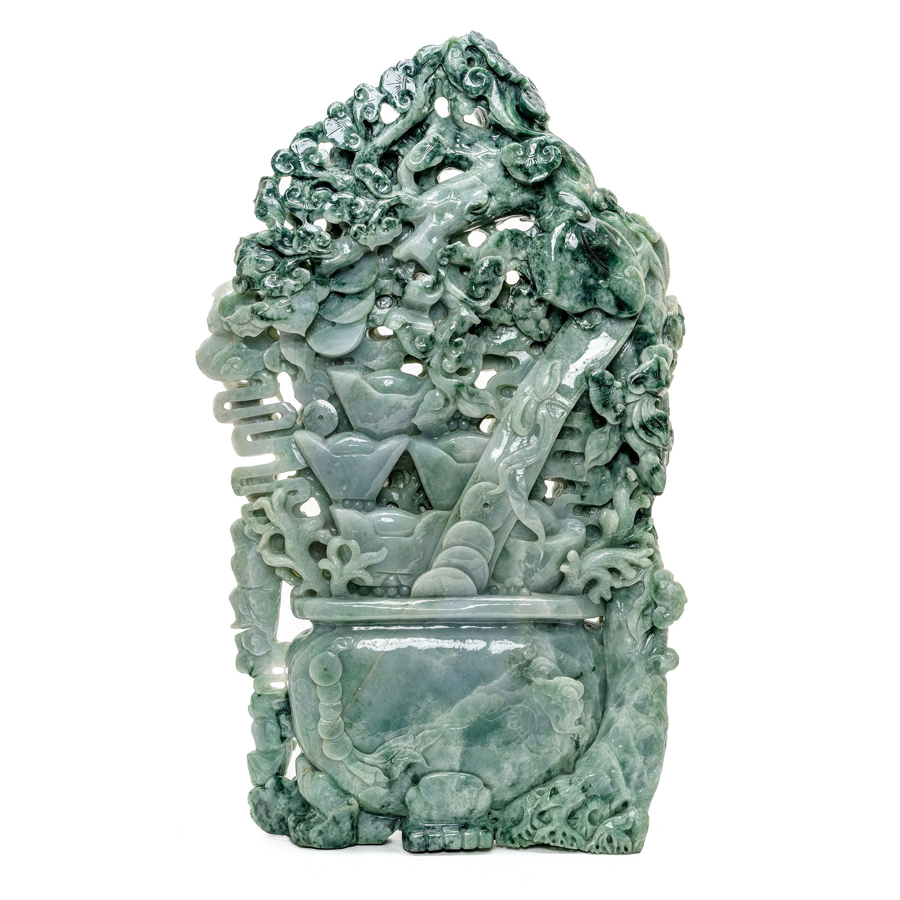 Heirloom-quality jade sculpture with Chinese prosperity symbols.
