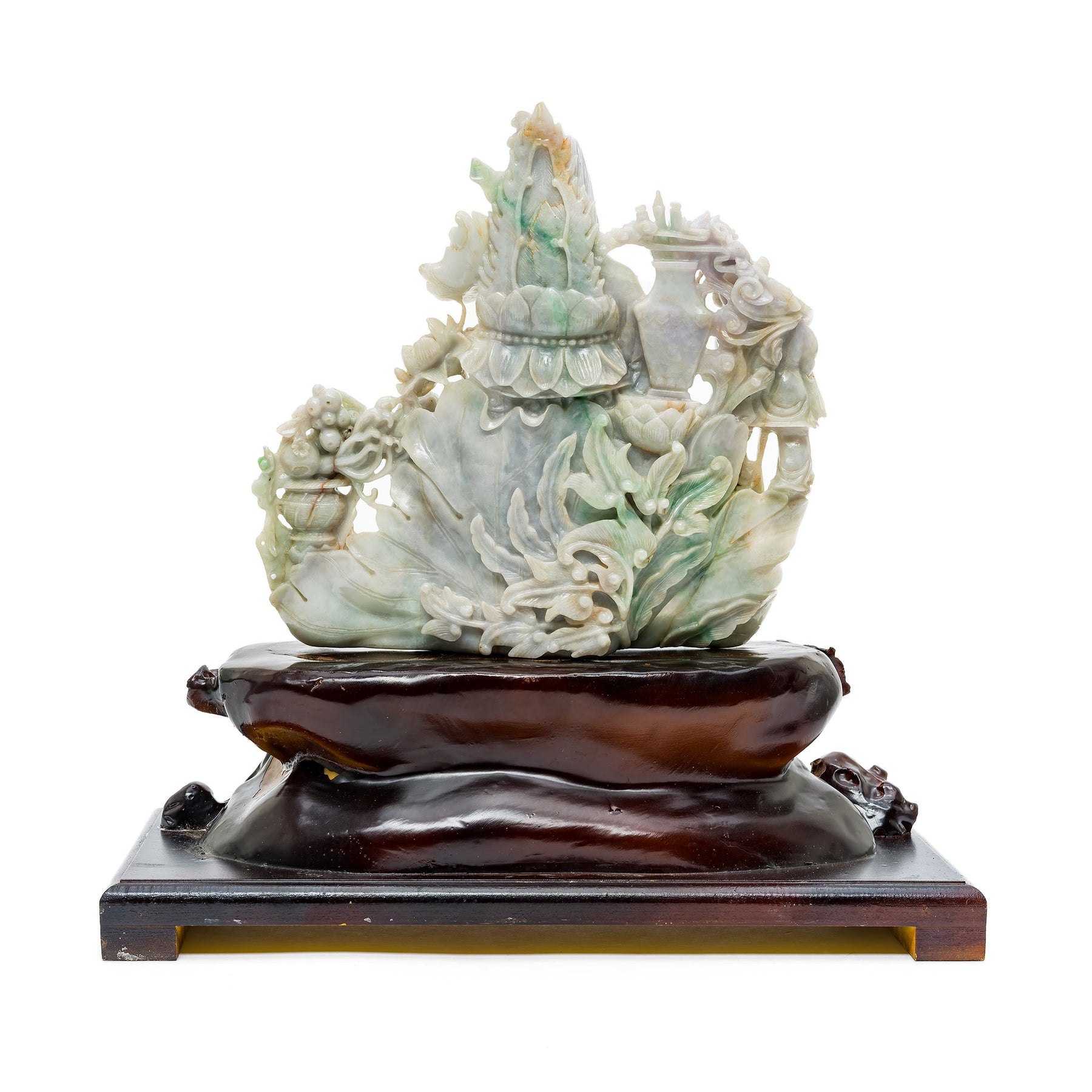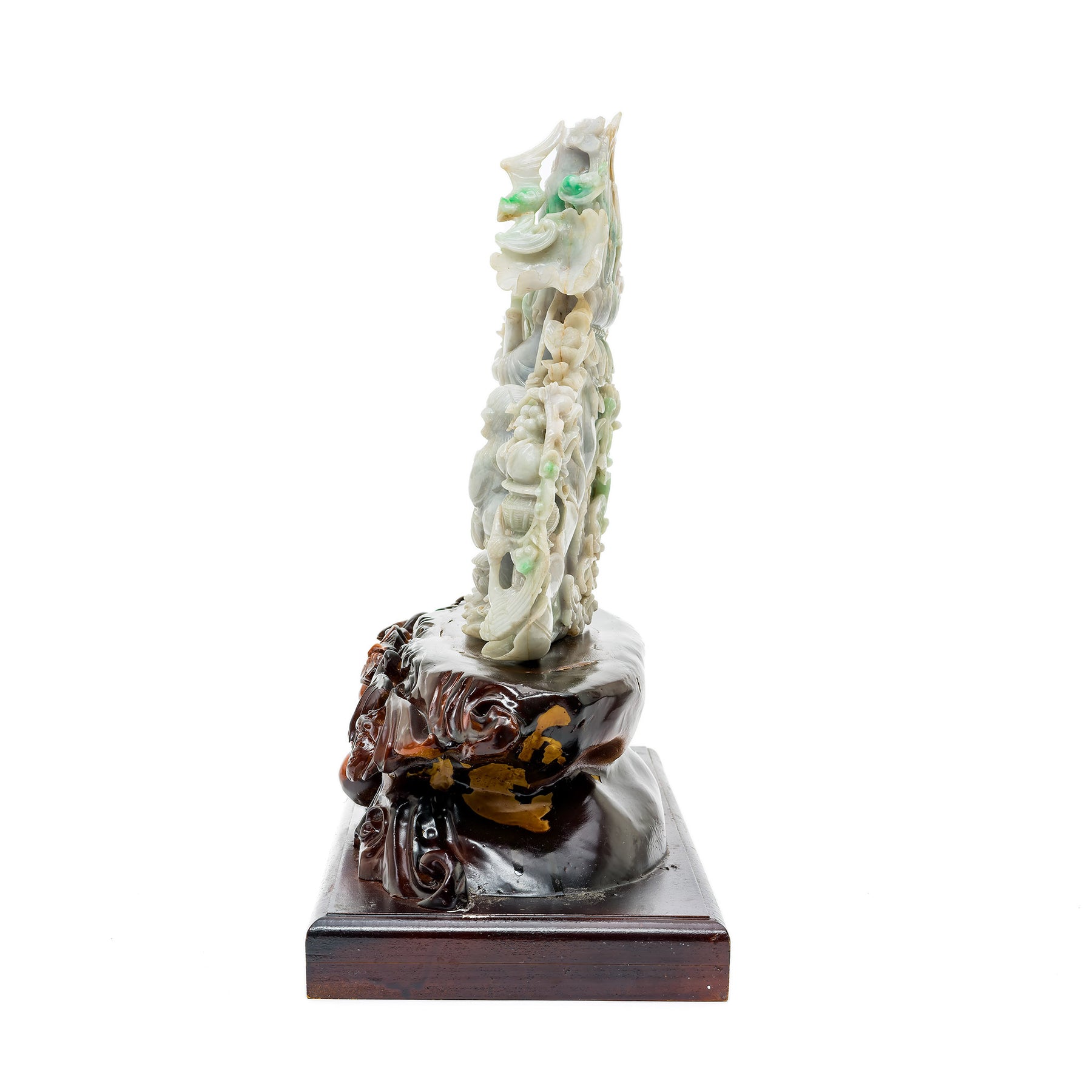This jade masterpiece is displayed on a decorative wooden stand with carved fruit motifs and flowing edges, offering both visual grounding and symbolic richness. The contrast between dark polished wood and glowing jade enhances the sculpture’s presence as a spiritual centerpiece or collector’s focal point.