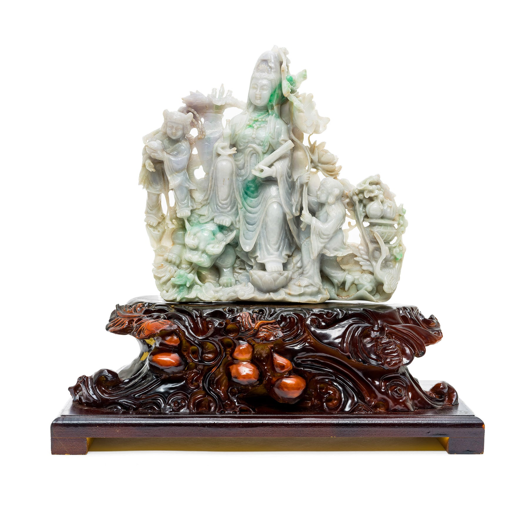 The Jade Quan Yin and Children sculpture is a serene and spiritually potent tribute to the revered Bodhisattva of Compassion. Measuring 15 inches high and carved from natural jade in soft celadon, ivory, and lavender hues, this piece radiates peace, maternal love, and divine grace. Seated in a lotus position and surrounded by playful children, Quan Yin offers a timeless message of healing, protection, and abundance.