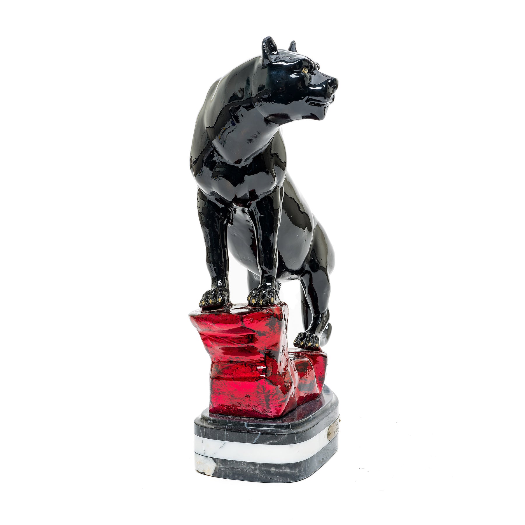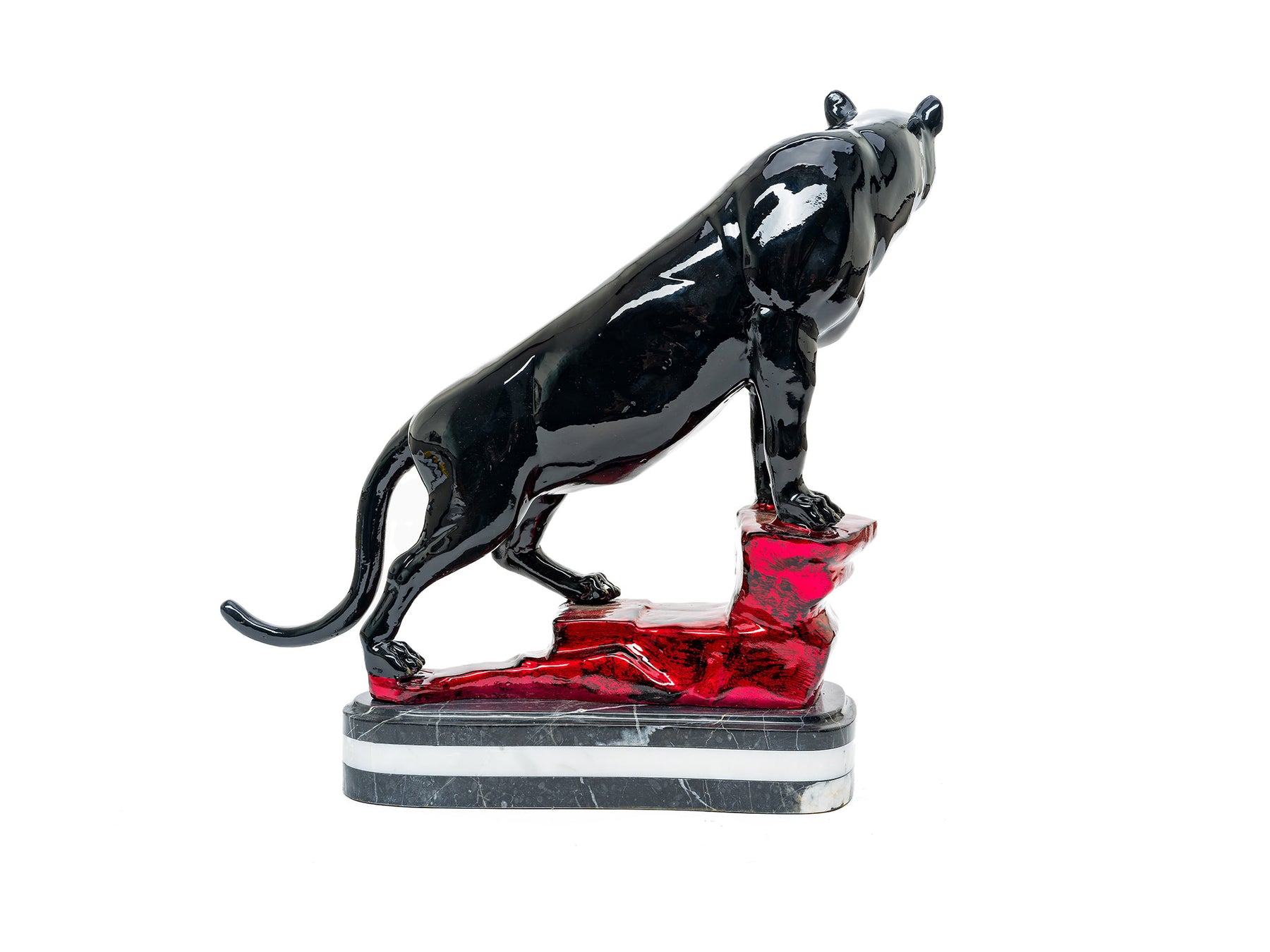 The deep black patina enhances the panther’s powerful stance, while the rich red rocky ledge creates a striking contrast. The clear coat finish not only accentuates the details but also protects the sculpture, preserving its brilliance for years to come.