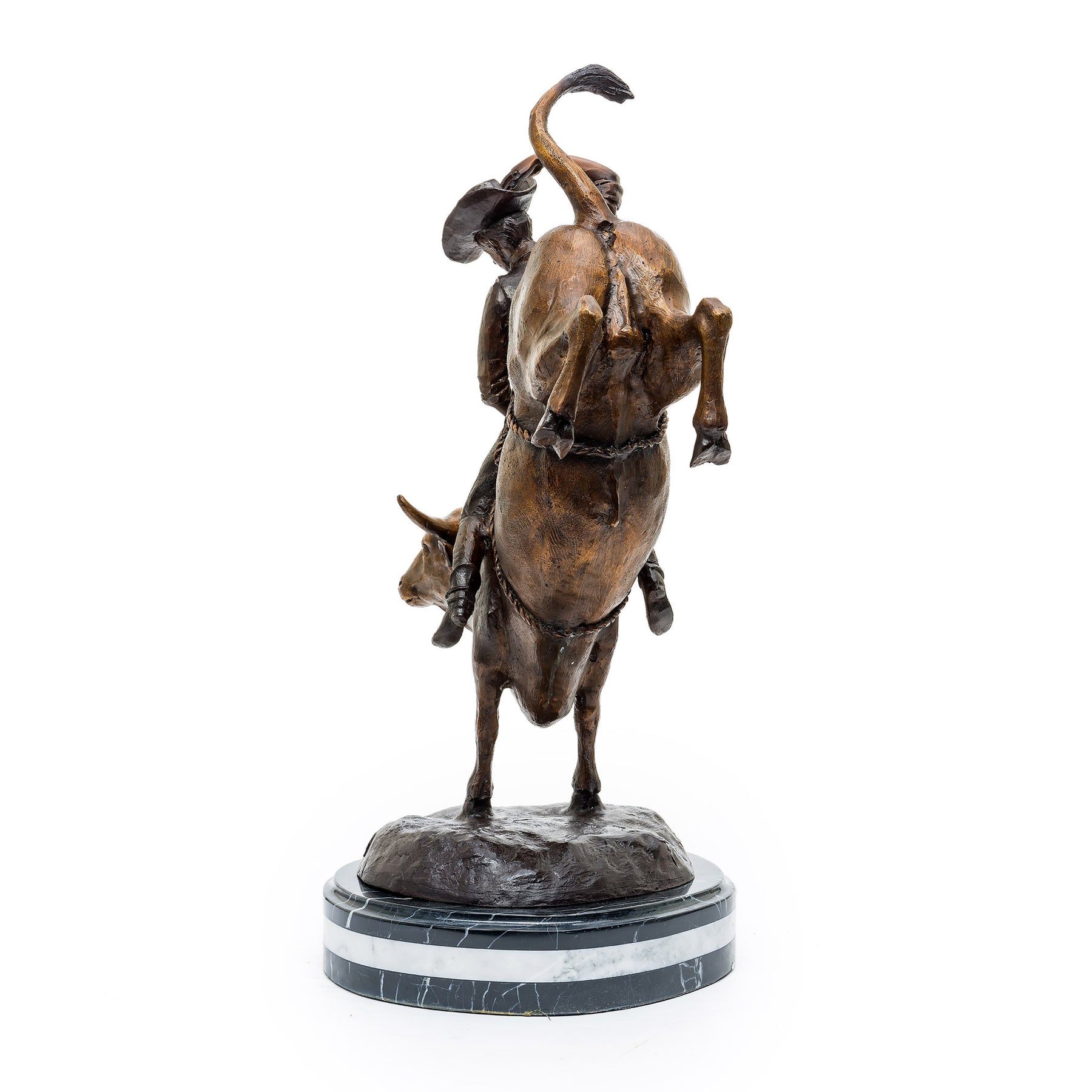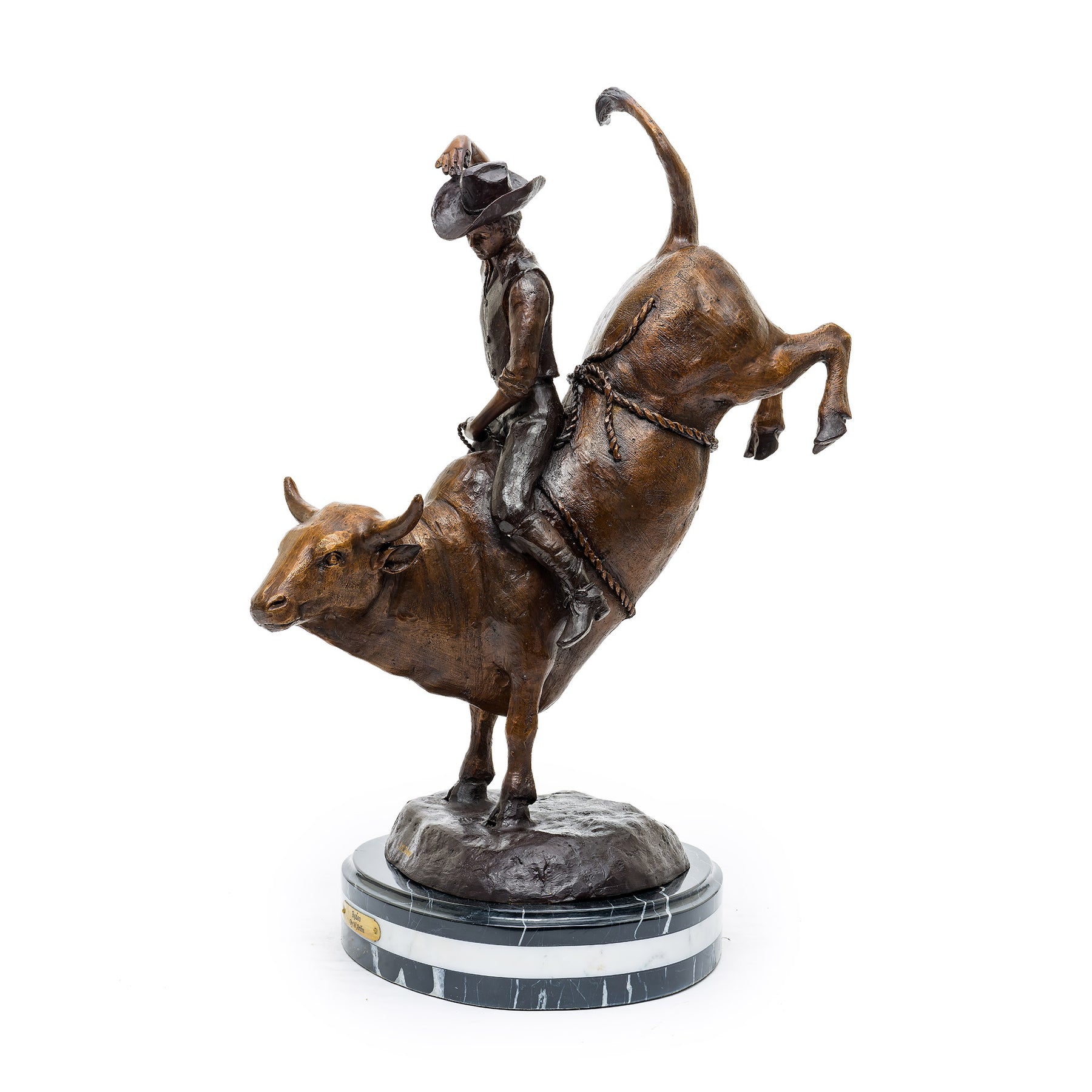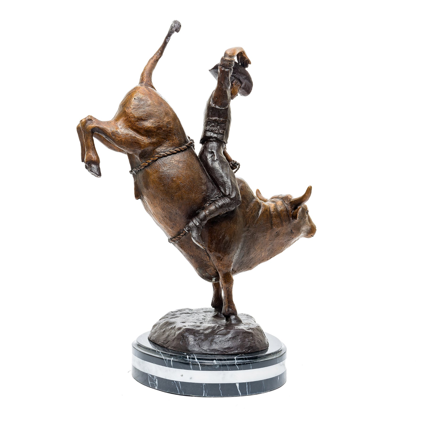 Western art sculpture featuring a cowboy on a bucking bull in bronze