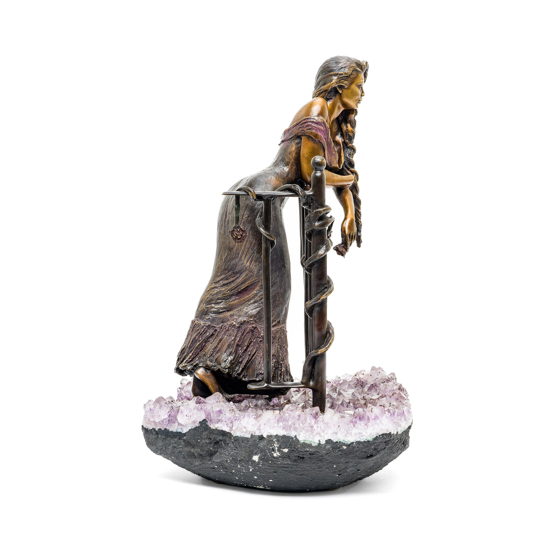 The sculpture stands atop a radiant amethyst crystal base—raw, earthy, and spiritual. This natural foundation connects the bronze figure to the earth, enhancing the work’s emotional depth and energetic presence. With its union of metal and mineral, Judith becomes a bridge between the physical and the ethereal.