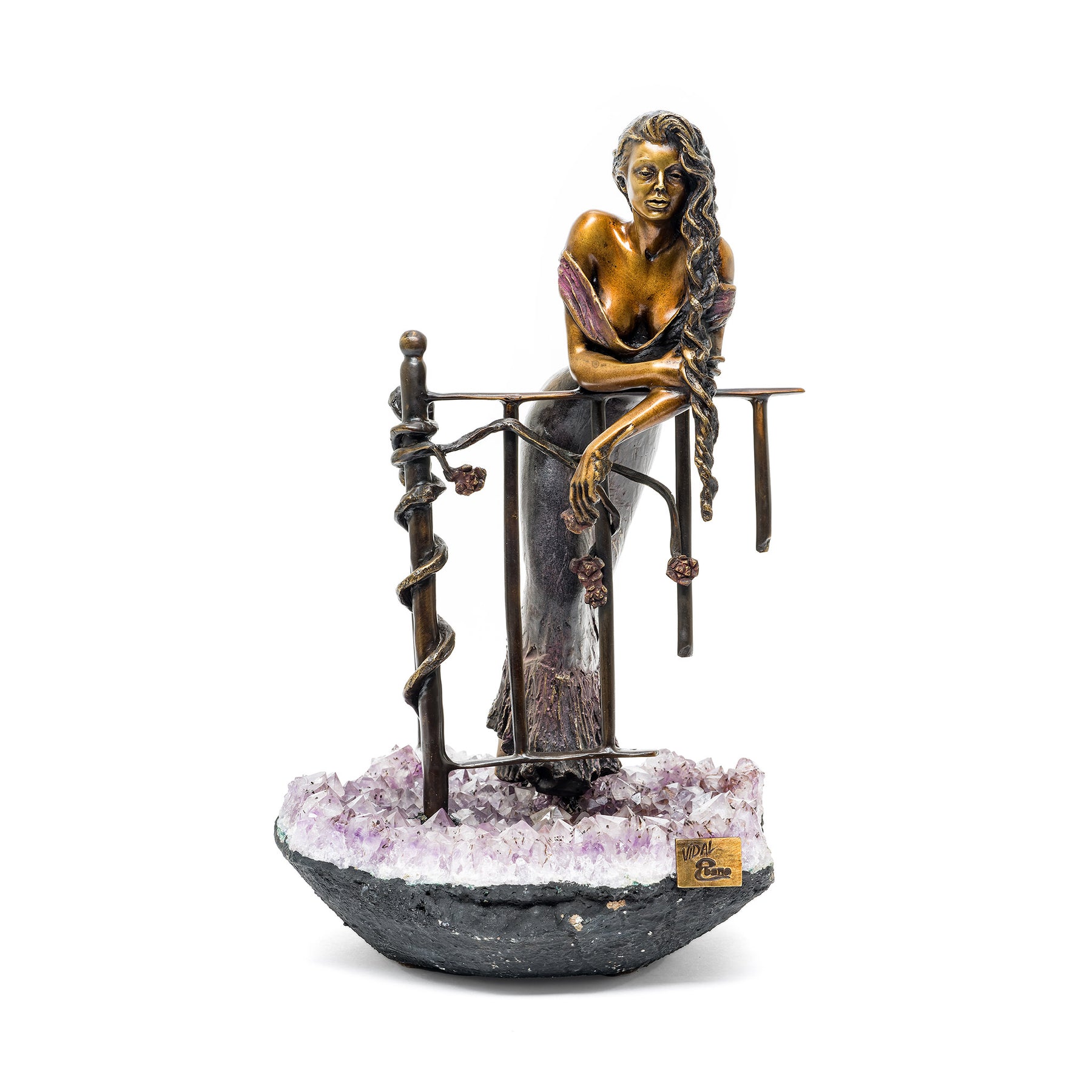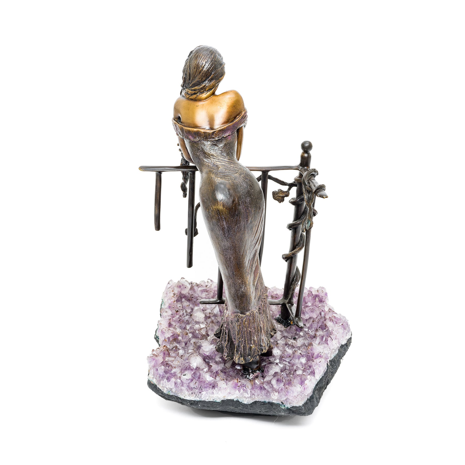 Judith is a limited edition bronze sculpture by Spanish artist Vidal, depicting a contemplative female figure leaning on a balcony railing. The piece is mounted on a raw amethyst base and symbolizes introspection, grace, and emotional depth.