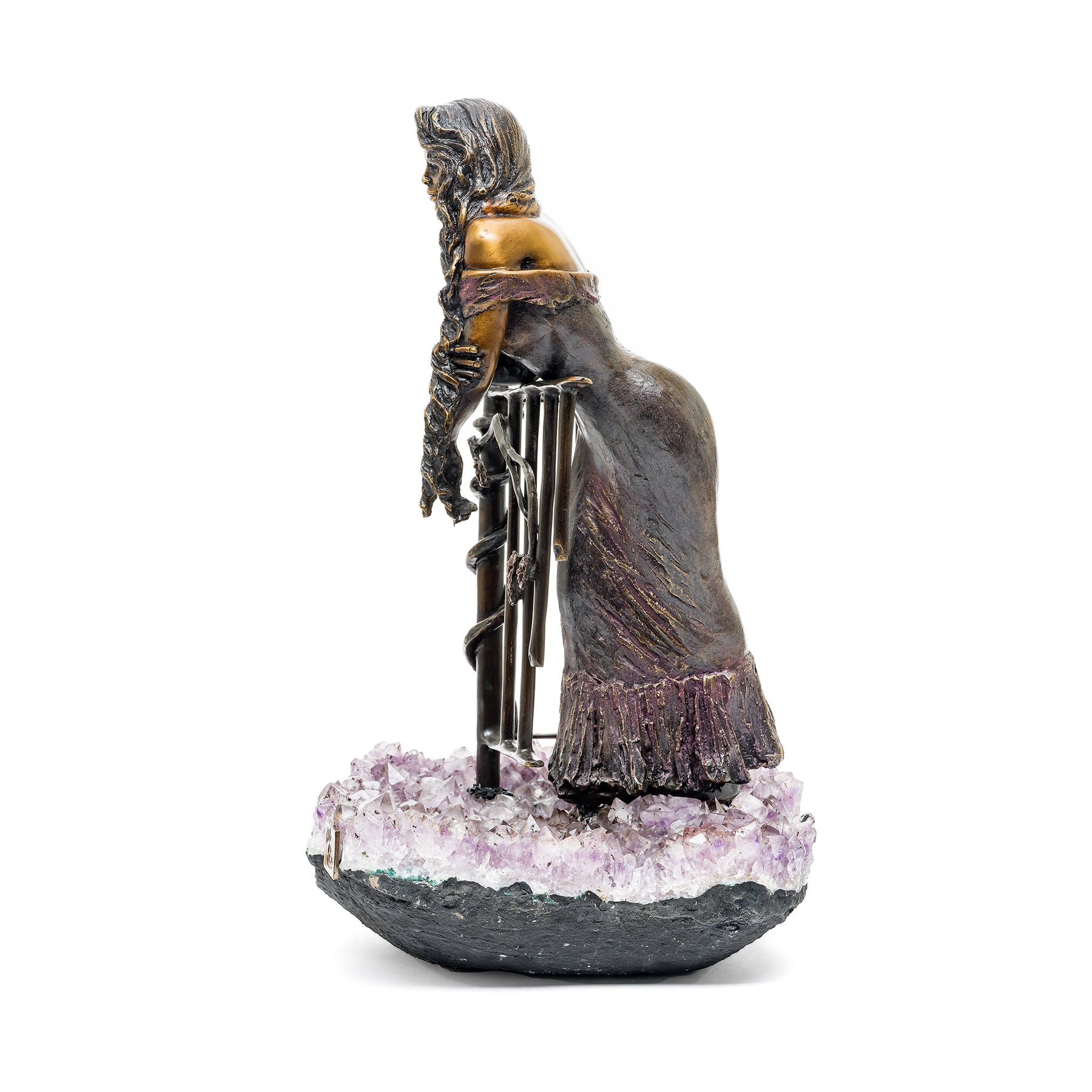 The sculpture is cast in solid bronze and mounted on a naturally formed amethyst crystal base. The raw crystal contrasts with the smooth bronze, creating an organic and elegant visual balance.