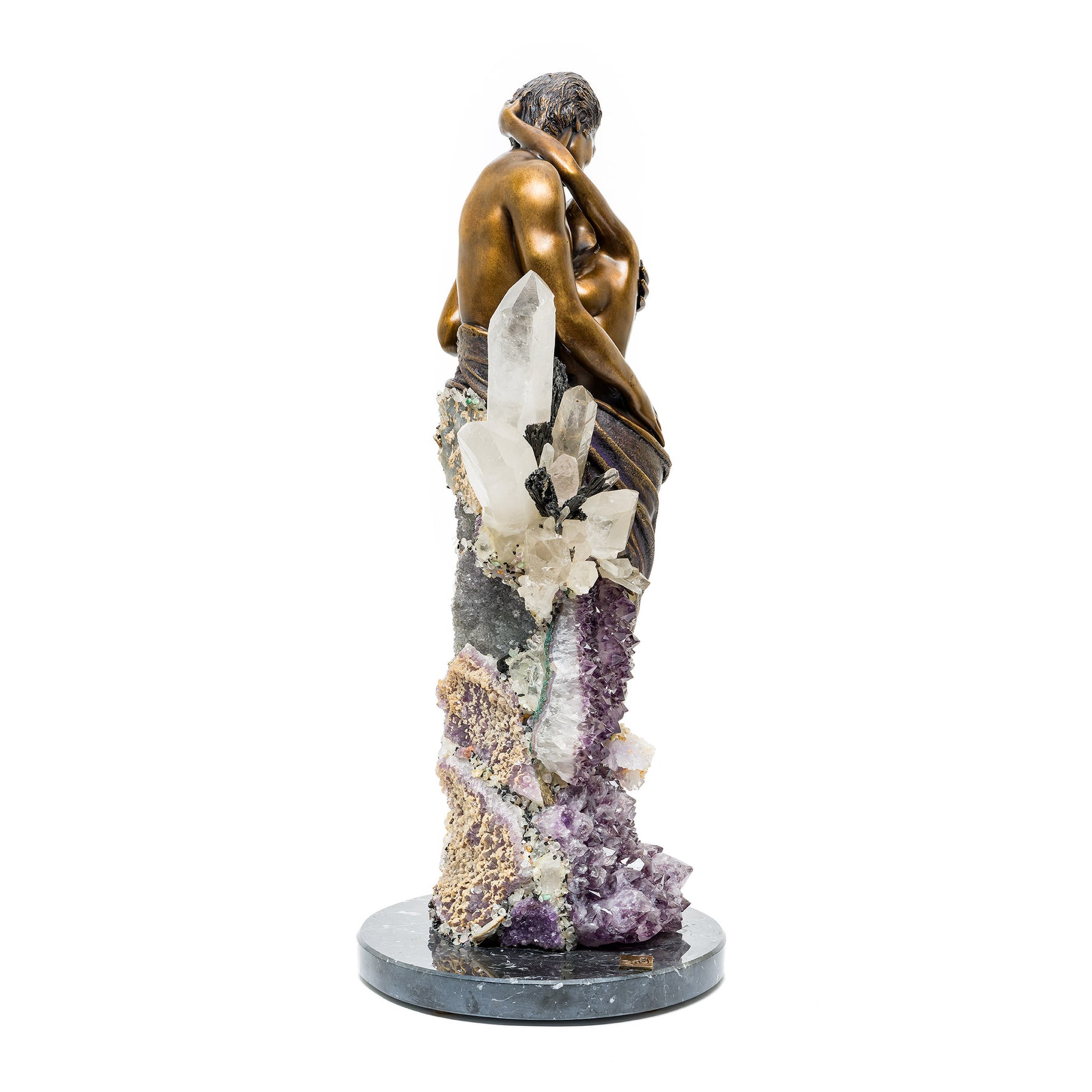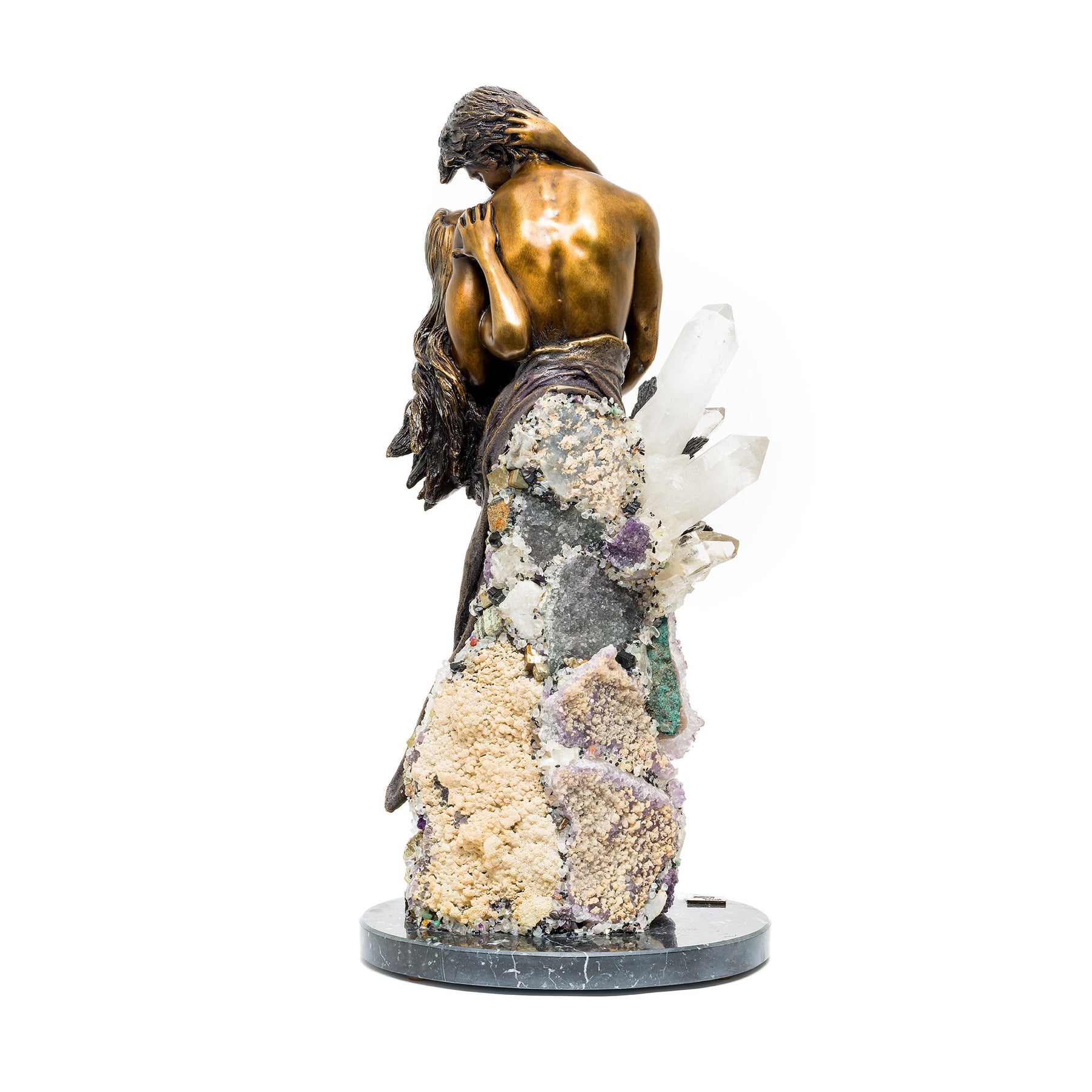 Lovers Intimacy by Vidal is a captivating bronze sculpture that immortalizes the sacred power of love in both physical form and energetic presence. This limited edition piece depicts two lovers entwined in a deeply emotive embrace—fluid, passionate, and infinitely tender. Crafted by master sculptor Vidal in Spain, the figures are elevated by a radiant foundation of natural amethyst, rock crystal, and pyrite, set atop a sleek black marble base.