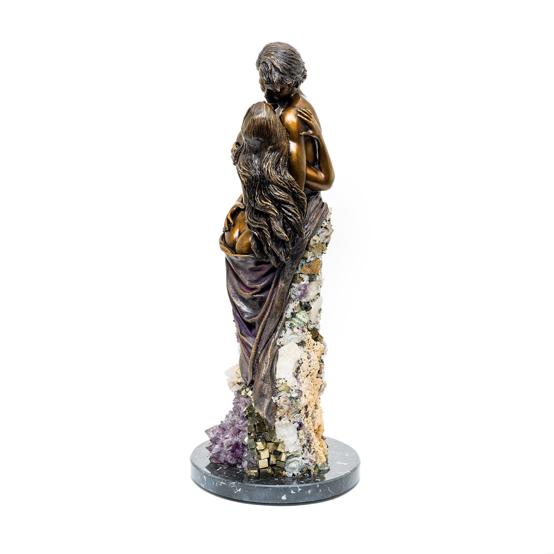 It is a limited edition bronze sculpture by Spanish artist Vidal, featuring an entwined couple atop a natural amethyst, quartz, and pyrite base. The piece symbolizes romantic unity, trust, and emotional depth.