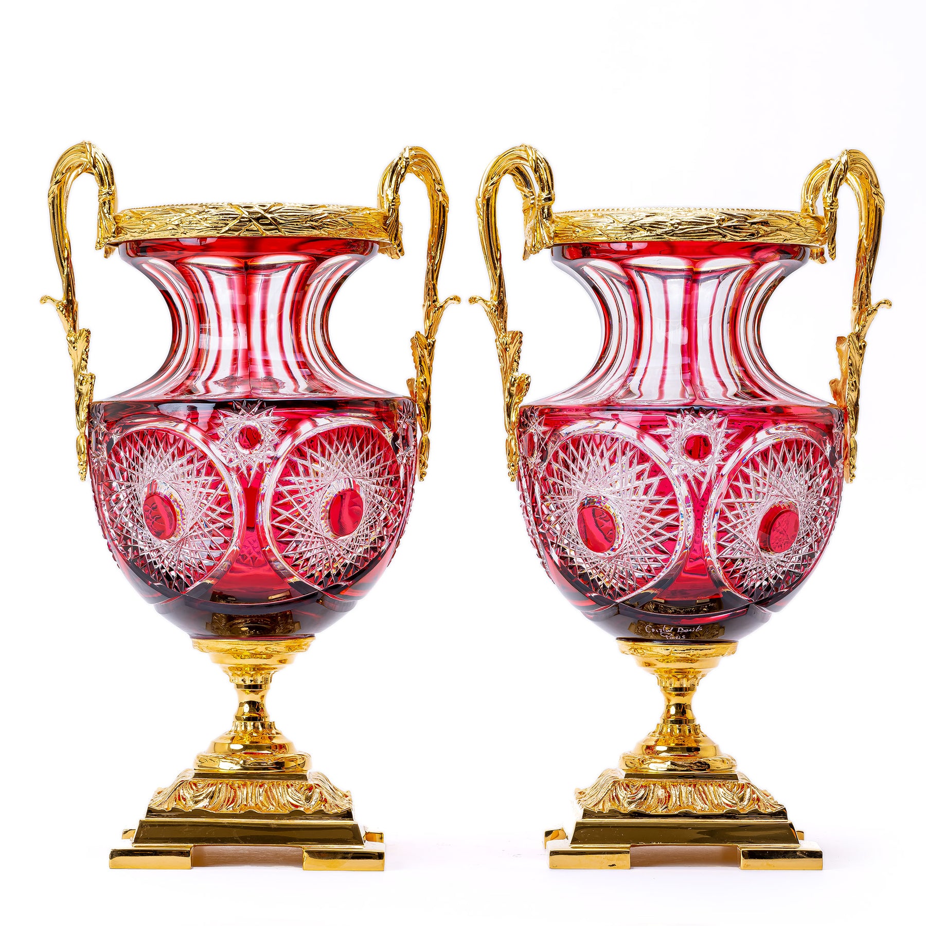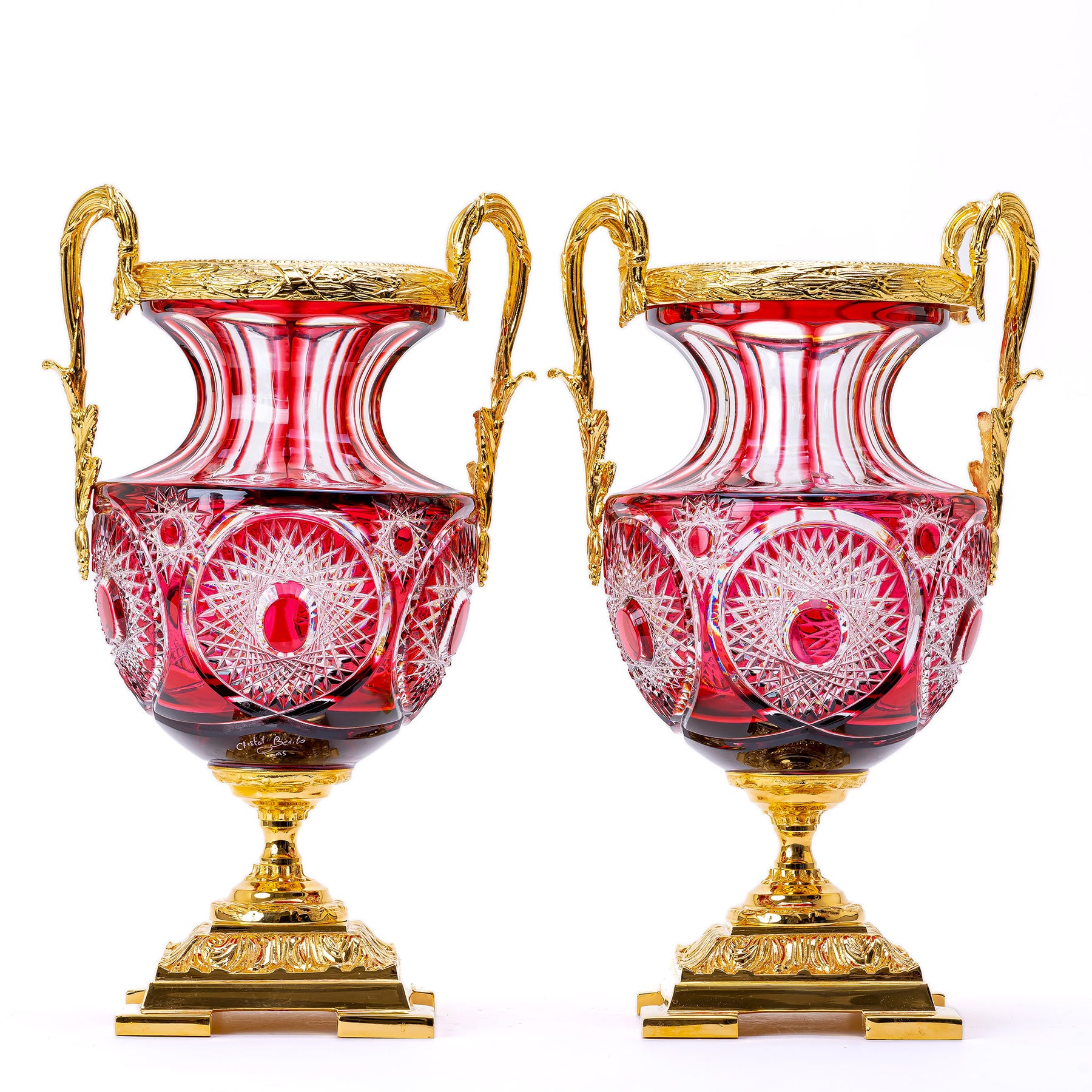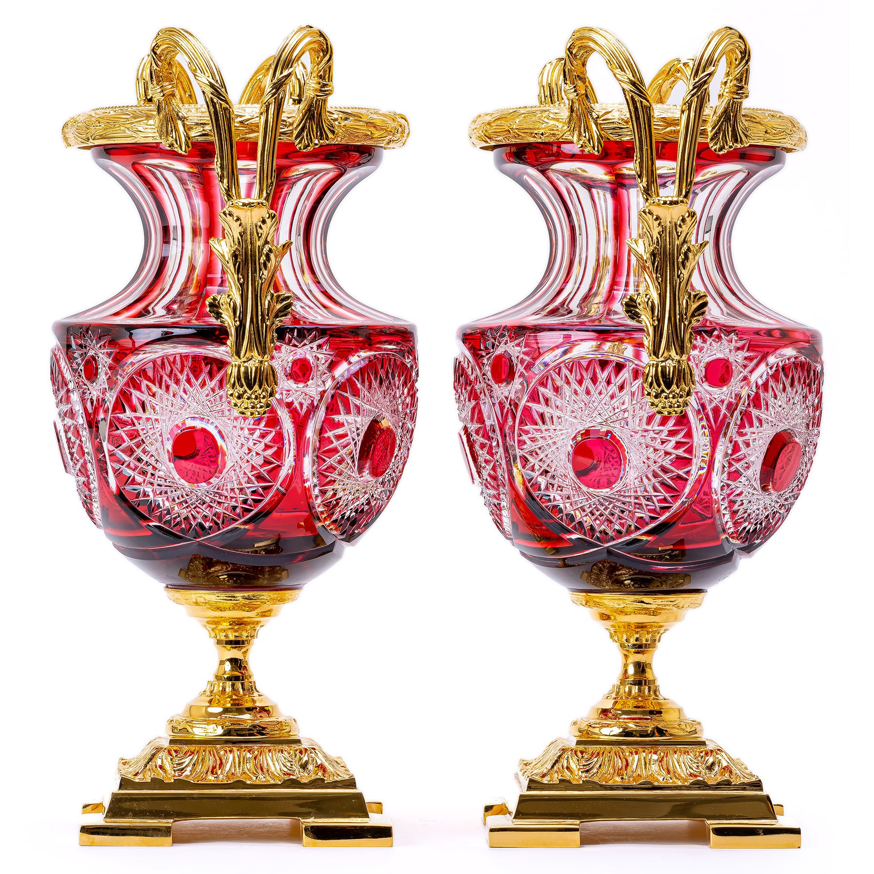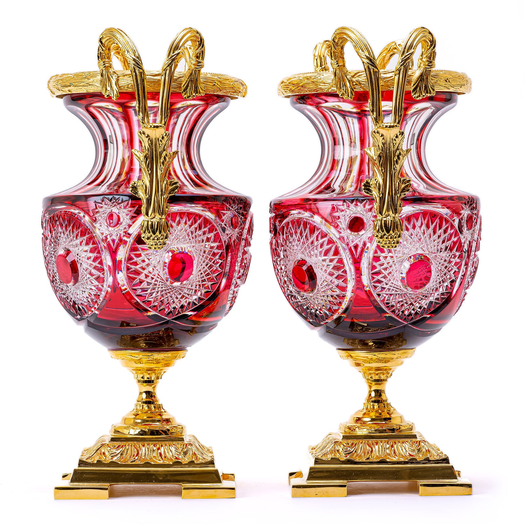 Pair of Red Crystals with unique 32 cut star faucet design, 24% lead, red crystal with heavy doré bronze mounts & accents.