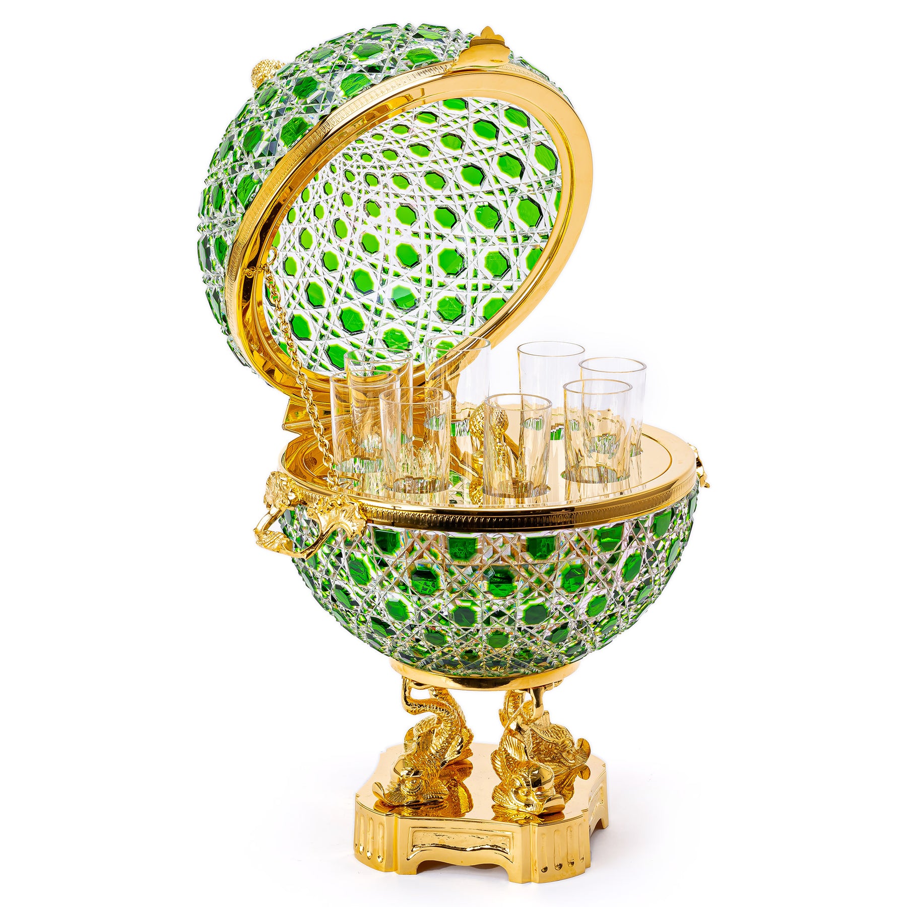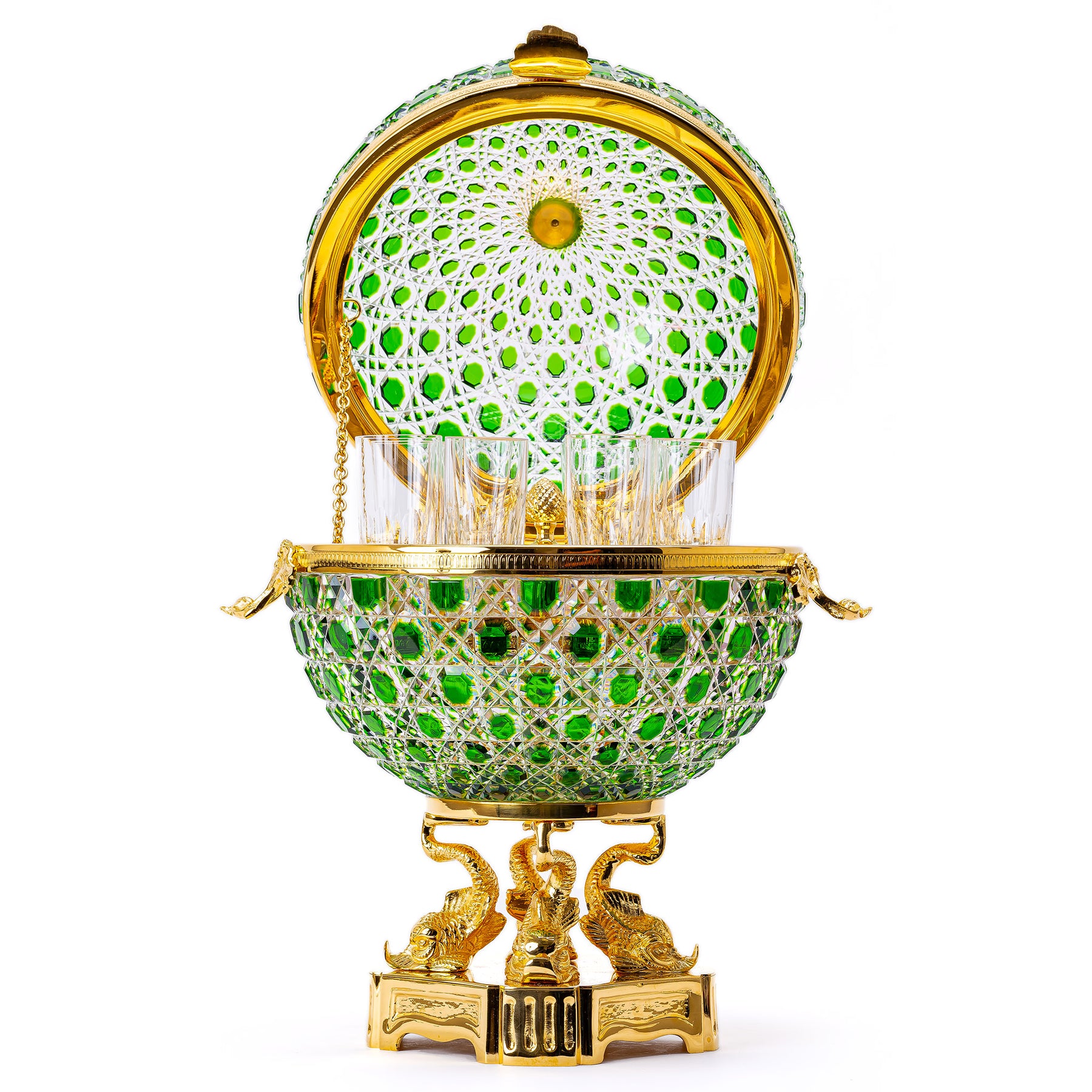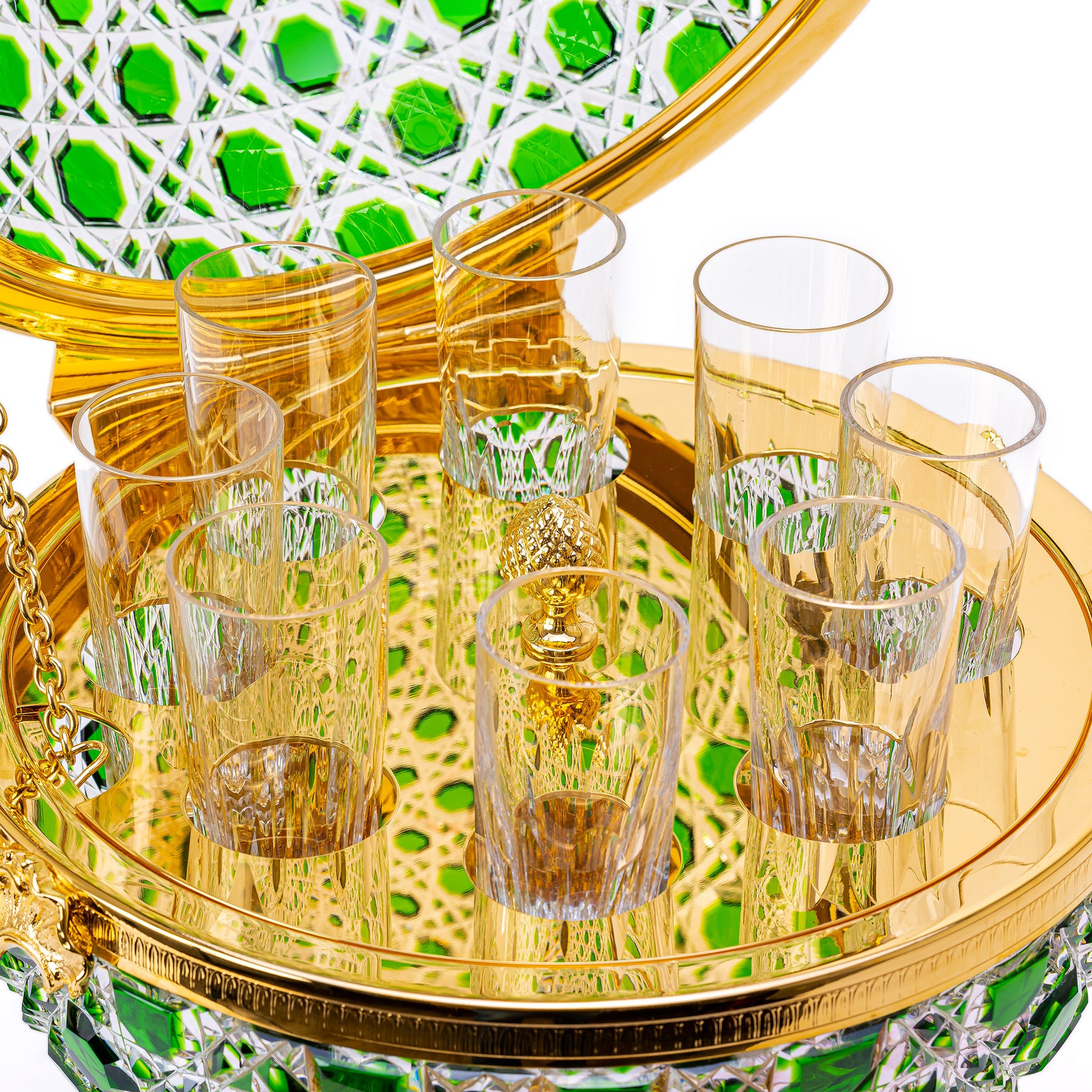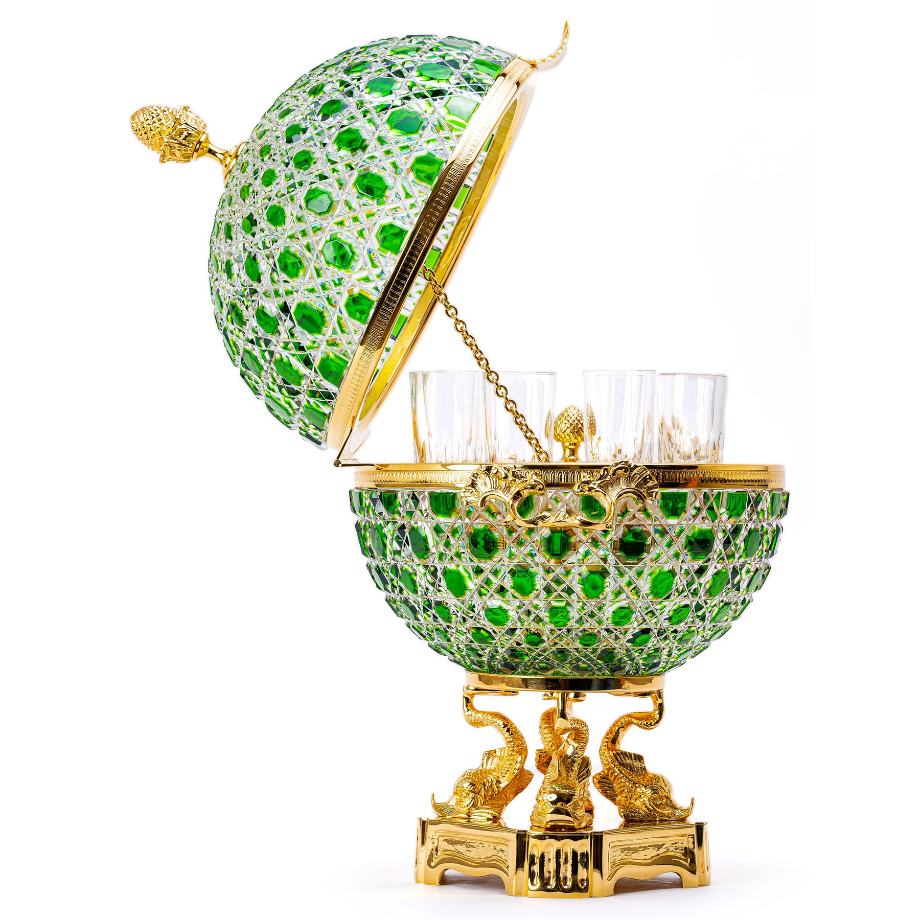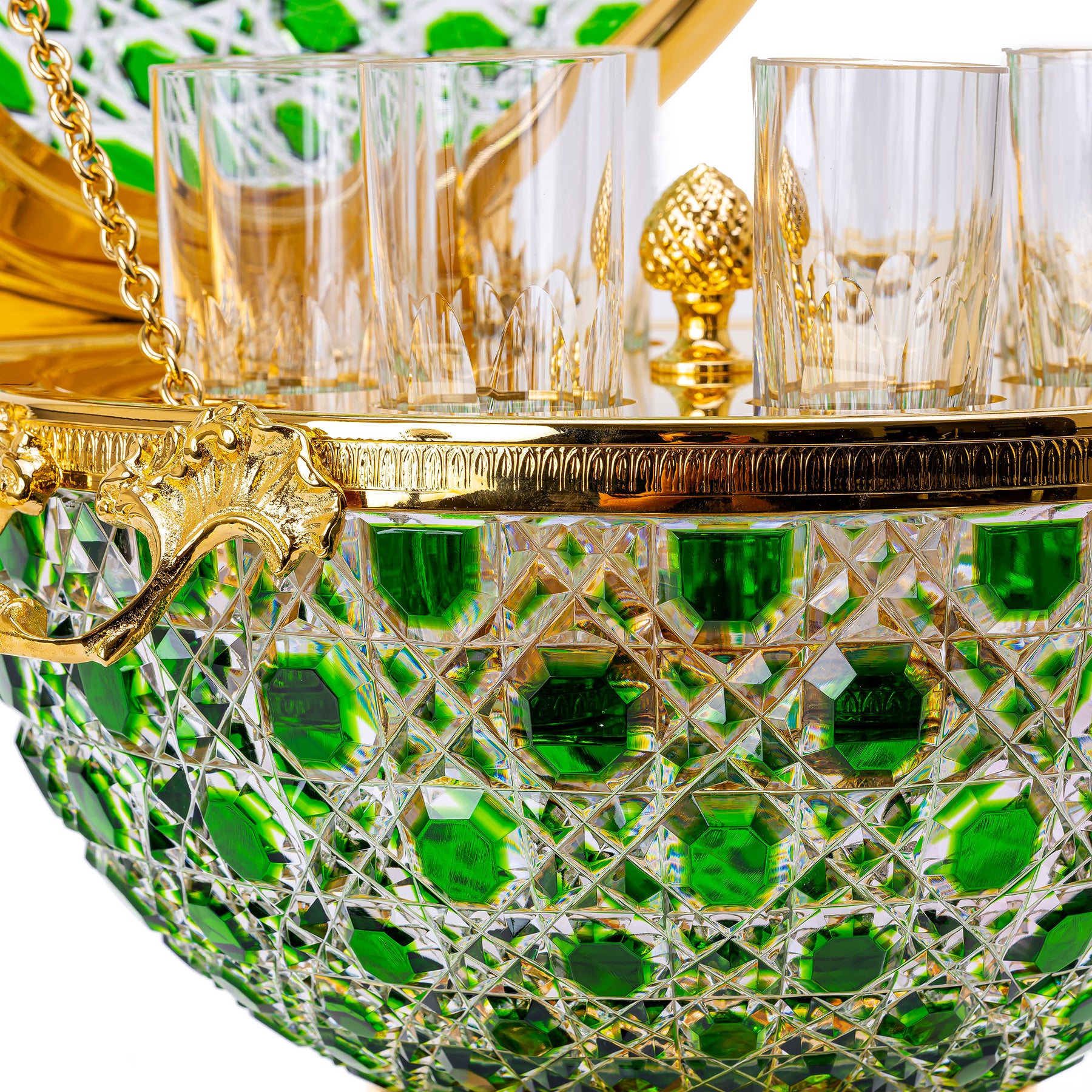 The Green Crystal Vodka Server is made from 24% lead crystal, ensuring a brilliant sparkle and clarity. The striking green hue is complemented by heavy doré bronze mounts and accents, which add a touch of opulence and sophistication to this luxurious server. The 32-cut star faucet design showcases the artisan's attention to detail and dedication to creating a truly remarkable piece.