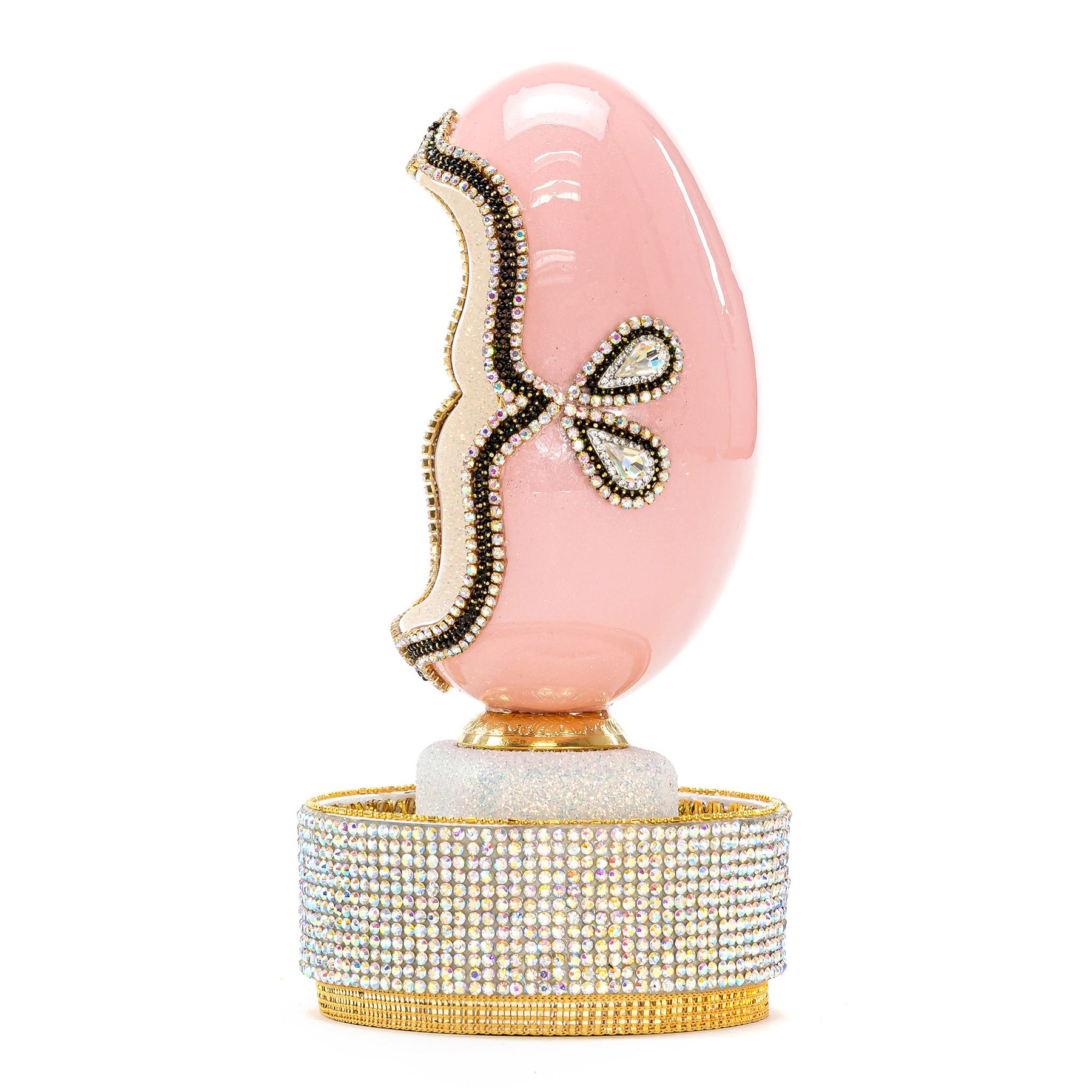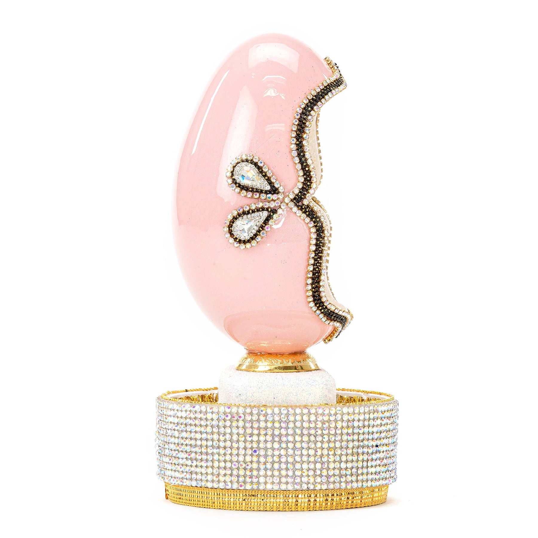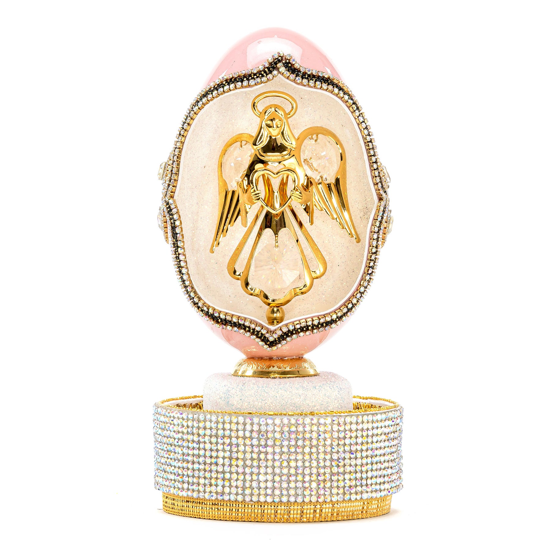 This beautiful goose egg is perched on a delicate crystal stand. The angelic figure inside the egg is delicately detailed and the whole piece is finished in a radiant pink hue. The egg is musical and plays a soft tune when wound. A perfect addition to any art collection, this exquisite piece is sure to be a cherished heirloom.