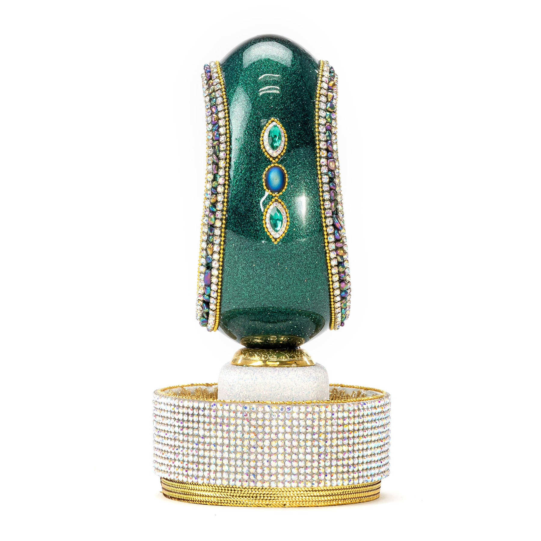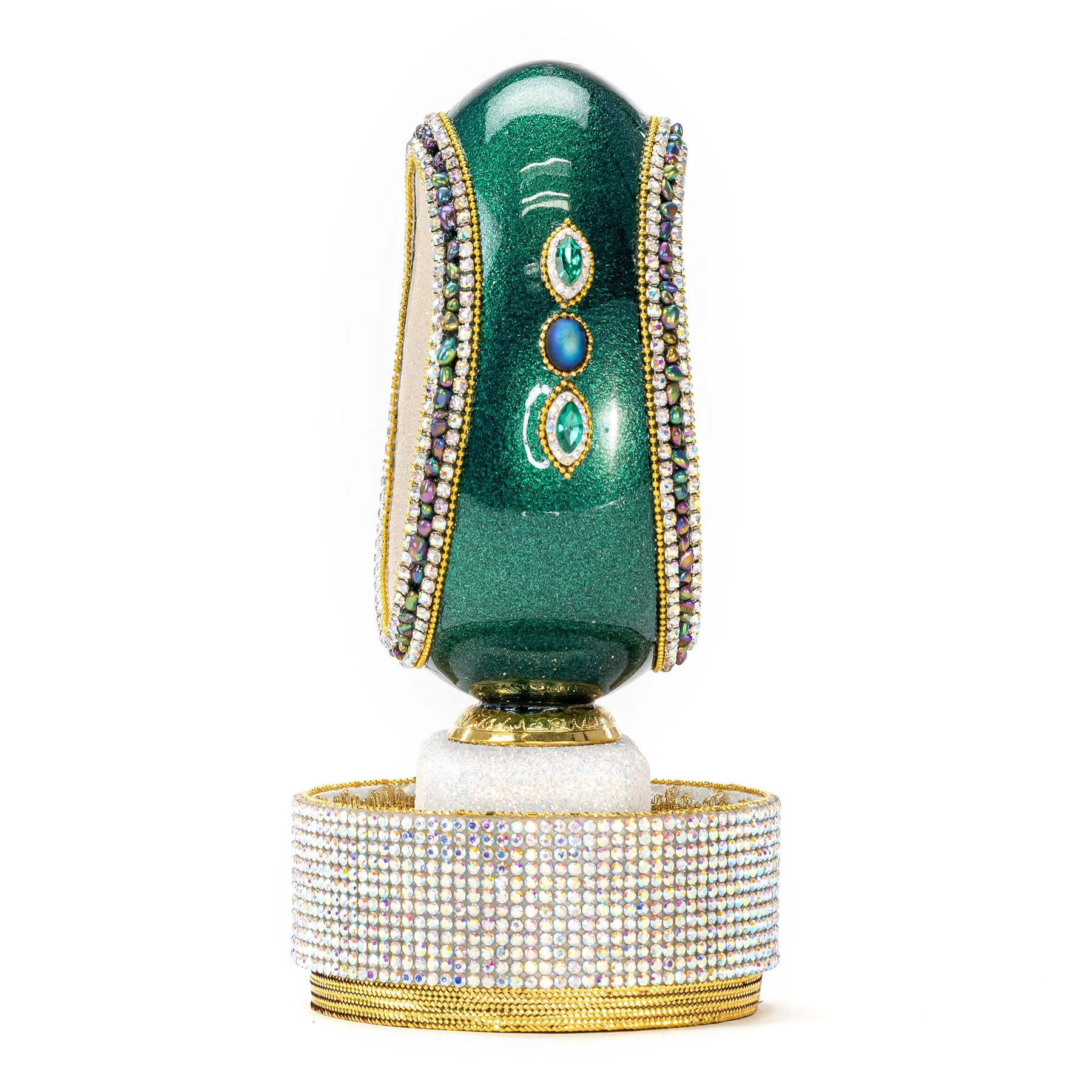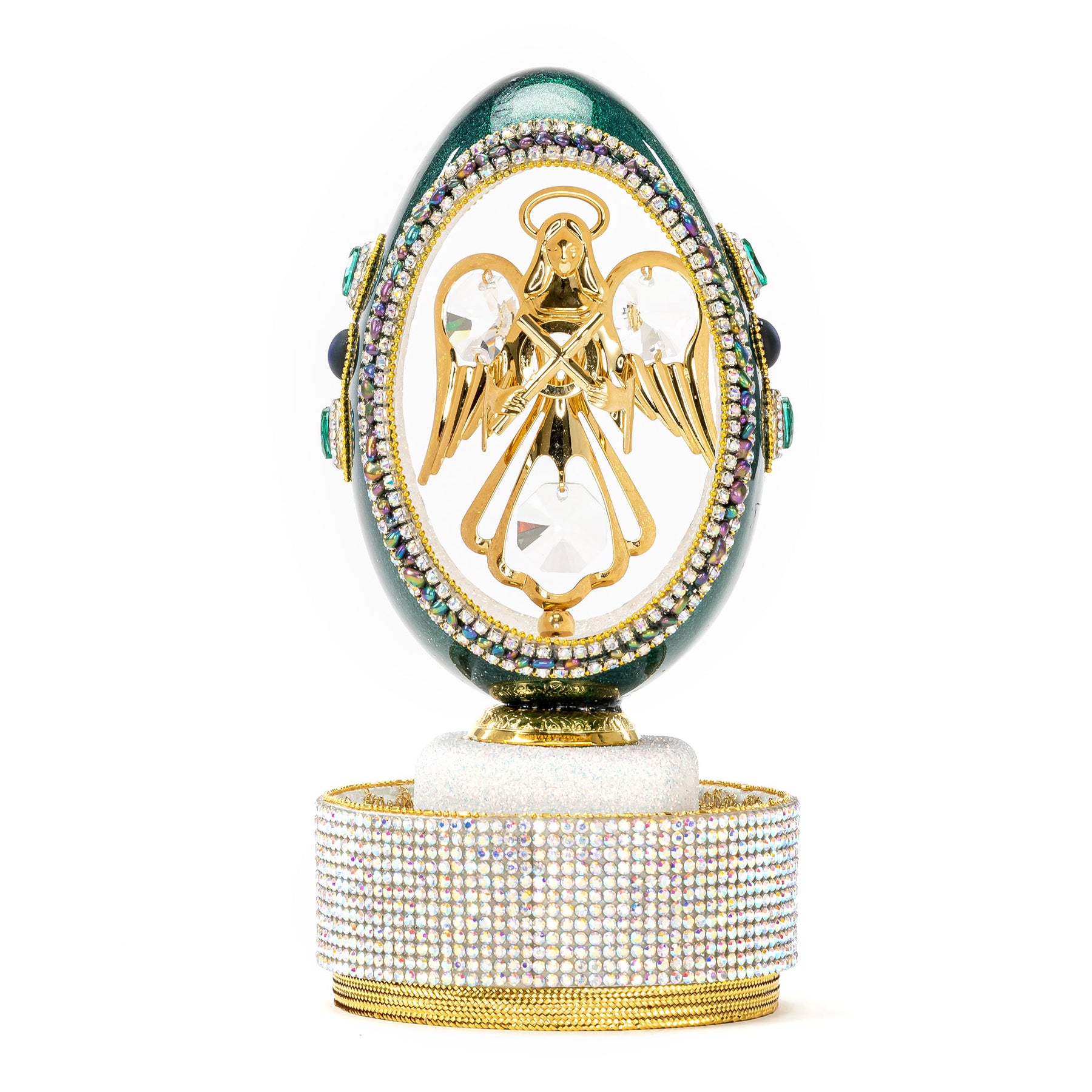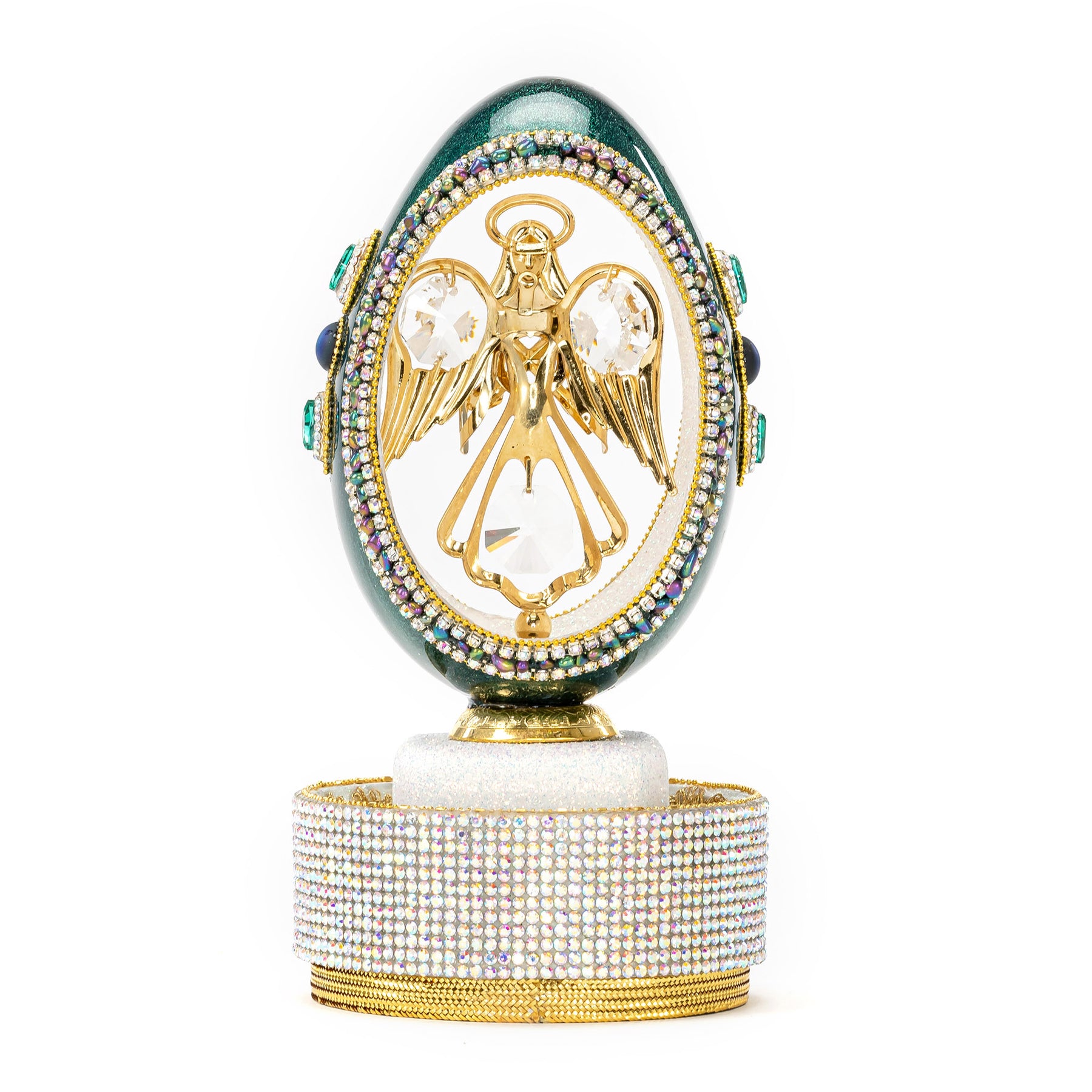 This exquisitely crafted green goose egg is perched atop a sparkling crystal stand. The angelic figure gracing the inside of the egg is sure to bring a touch of elegance to any setting. The egg is also musical, playing a soft tune that is sure to set the mood. This is a beautiful addition to any art collection.