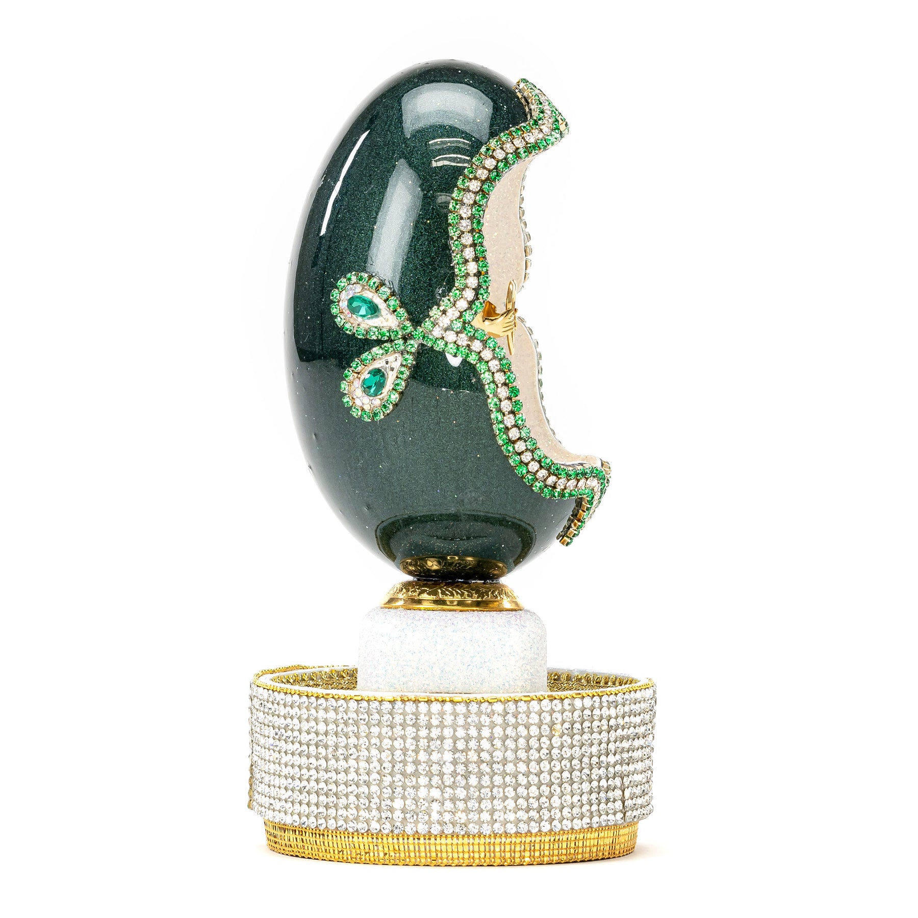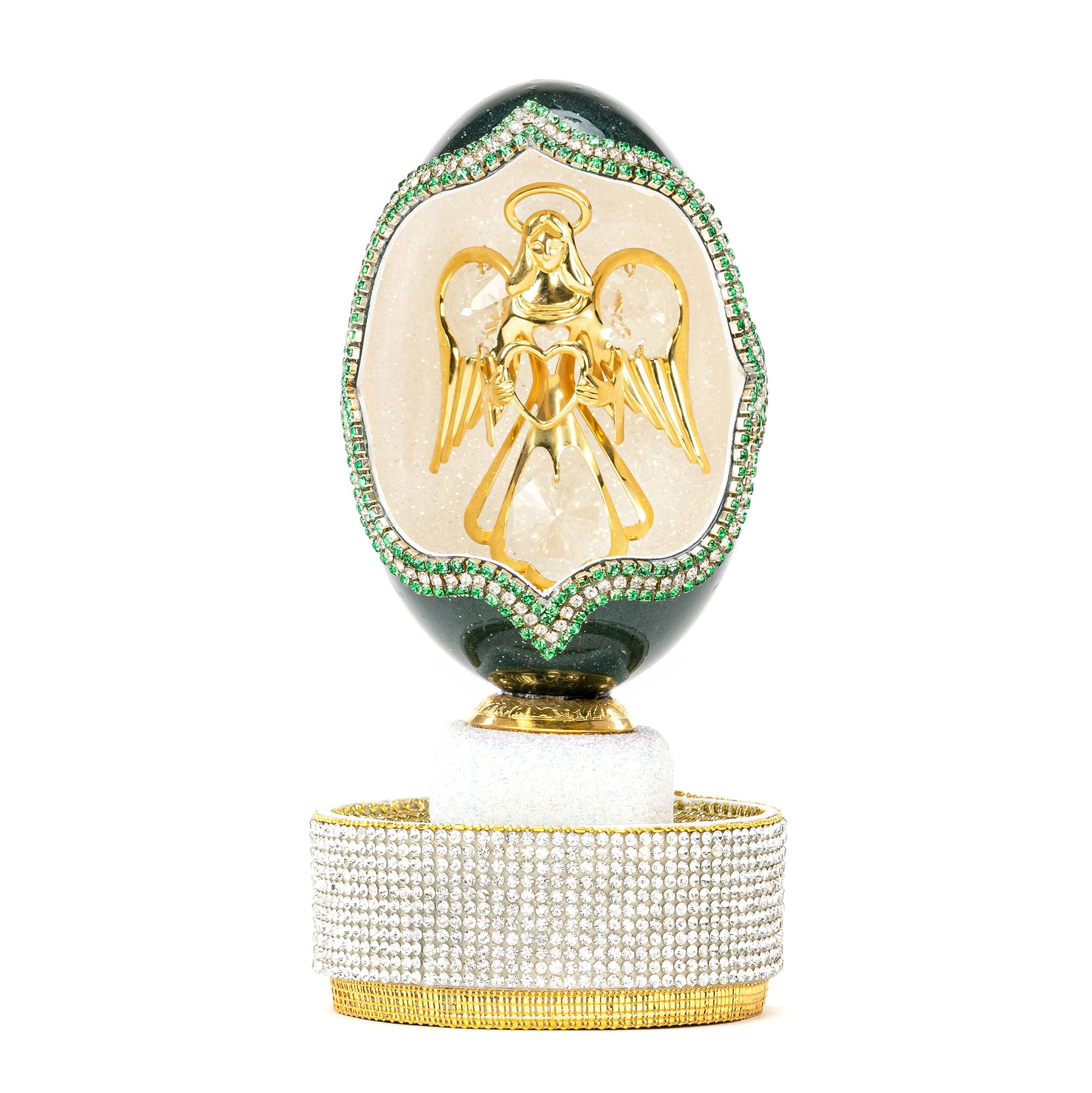This exquisite goose egg is mounted on a delicate crystal stand. The angelic figure gracing the inside of the egg is sure to inspire feelings of peace and serenity. The egg is also musical, playing a gentle tune that will soothe the soul. Whether displayed in your home or office, this beautiful piece is sure to add a touch of elegance to any space.