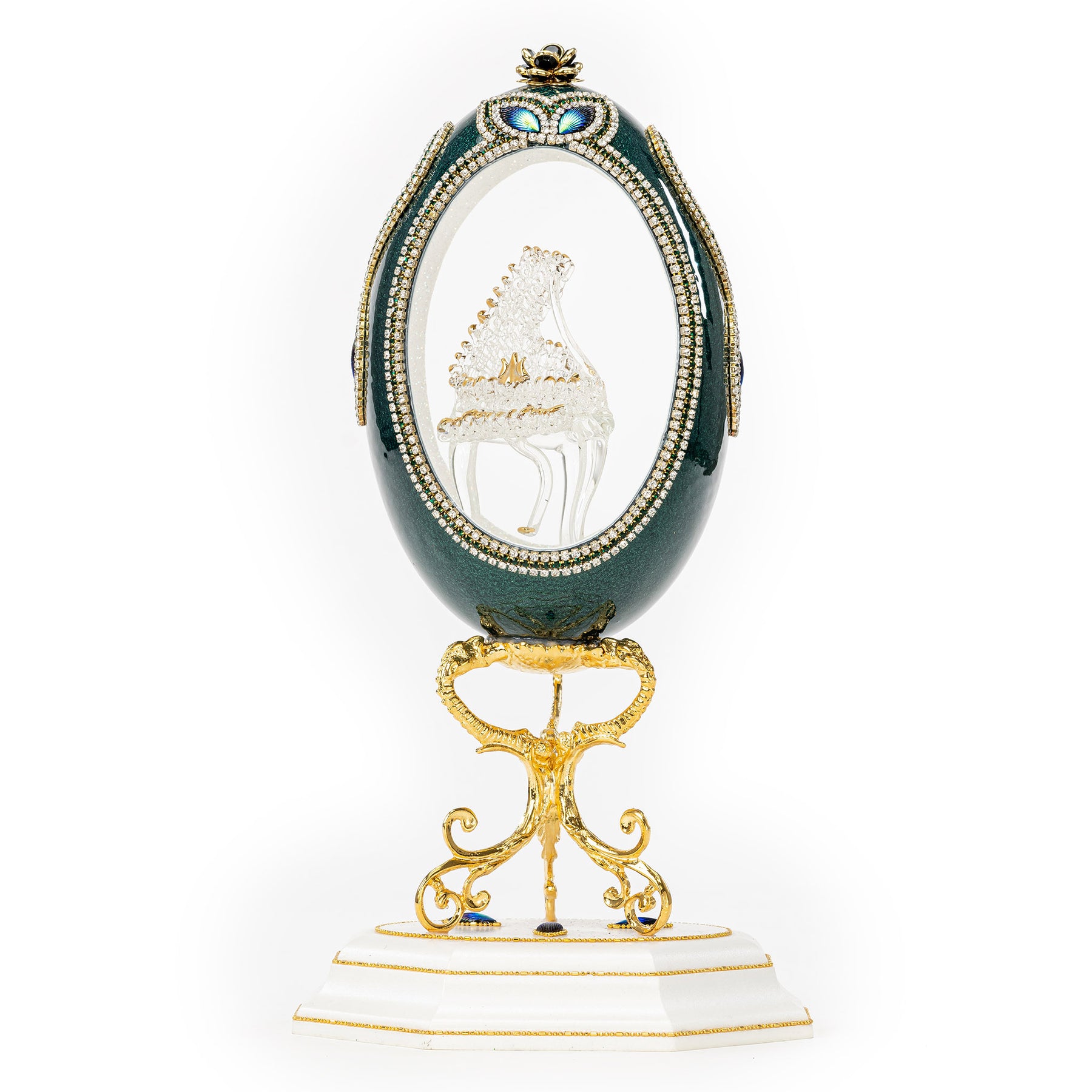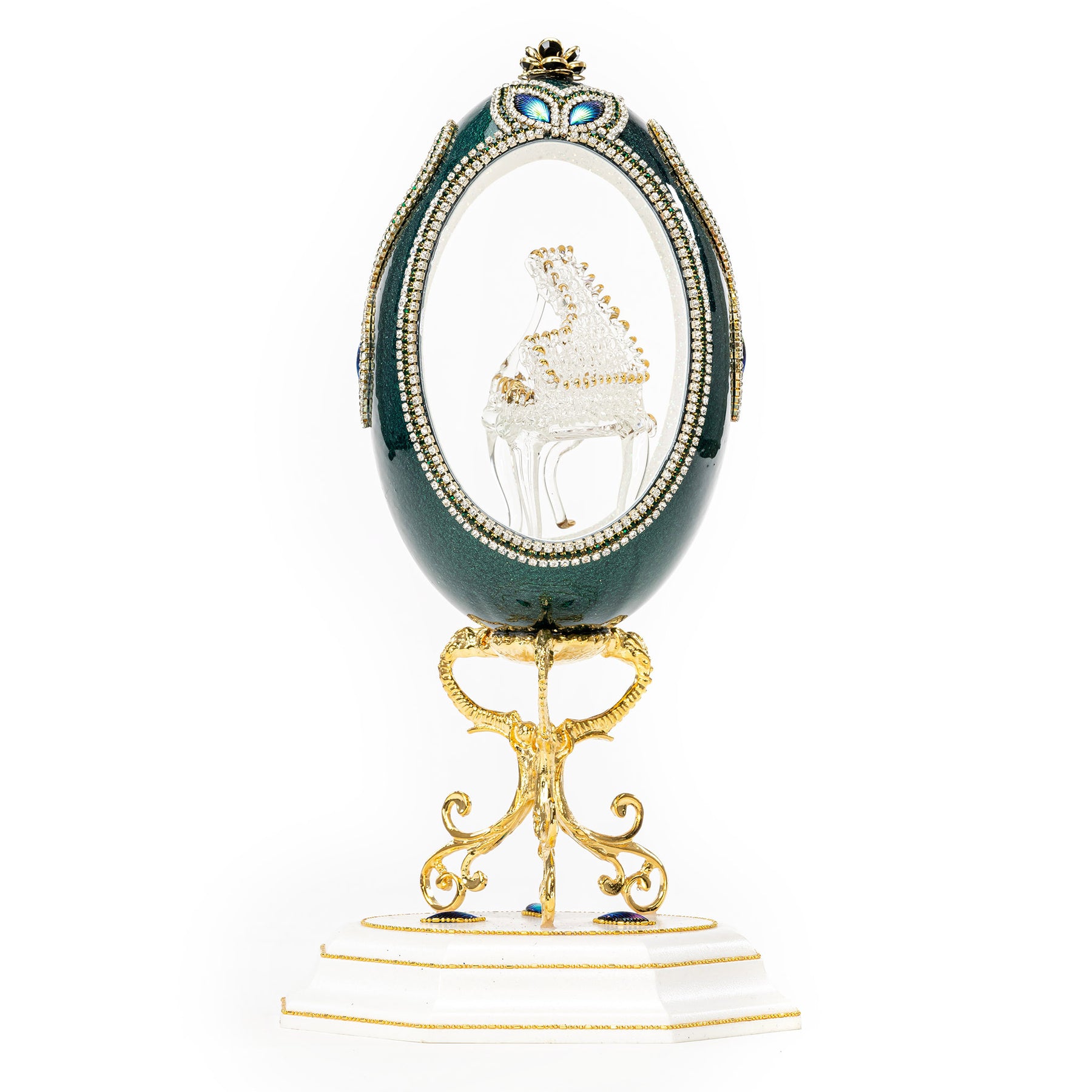 This magnificent, one-of-a-kind egg is handcrafted from a real egg. The dark green color of the egg accentuates the intricate glass piano in the middle.  This piece is sure to amaze and impress. It comes mounted on its own stand, making it easy to display. Whether you're looking for a unique addition to your collection or a show-stopping conversation piece, this egg is sure to impress.