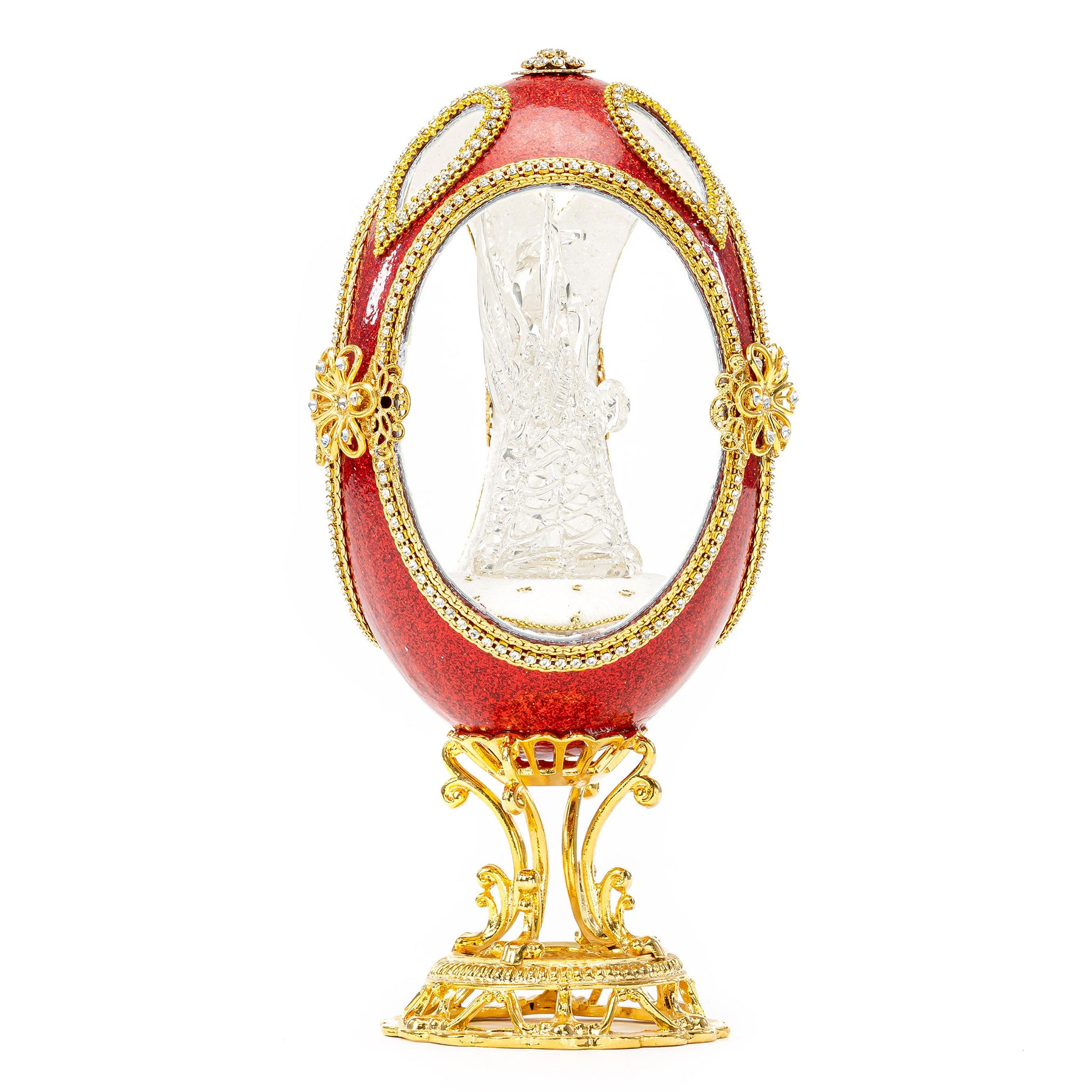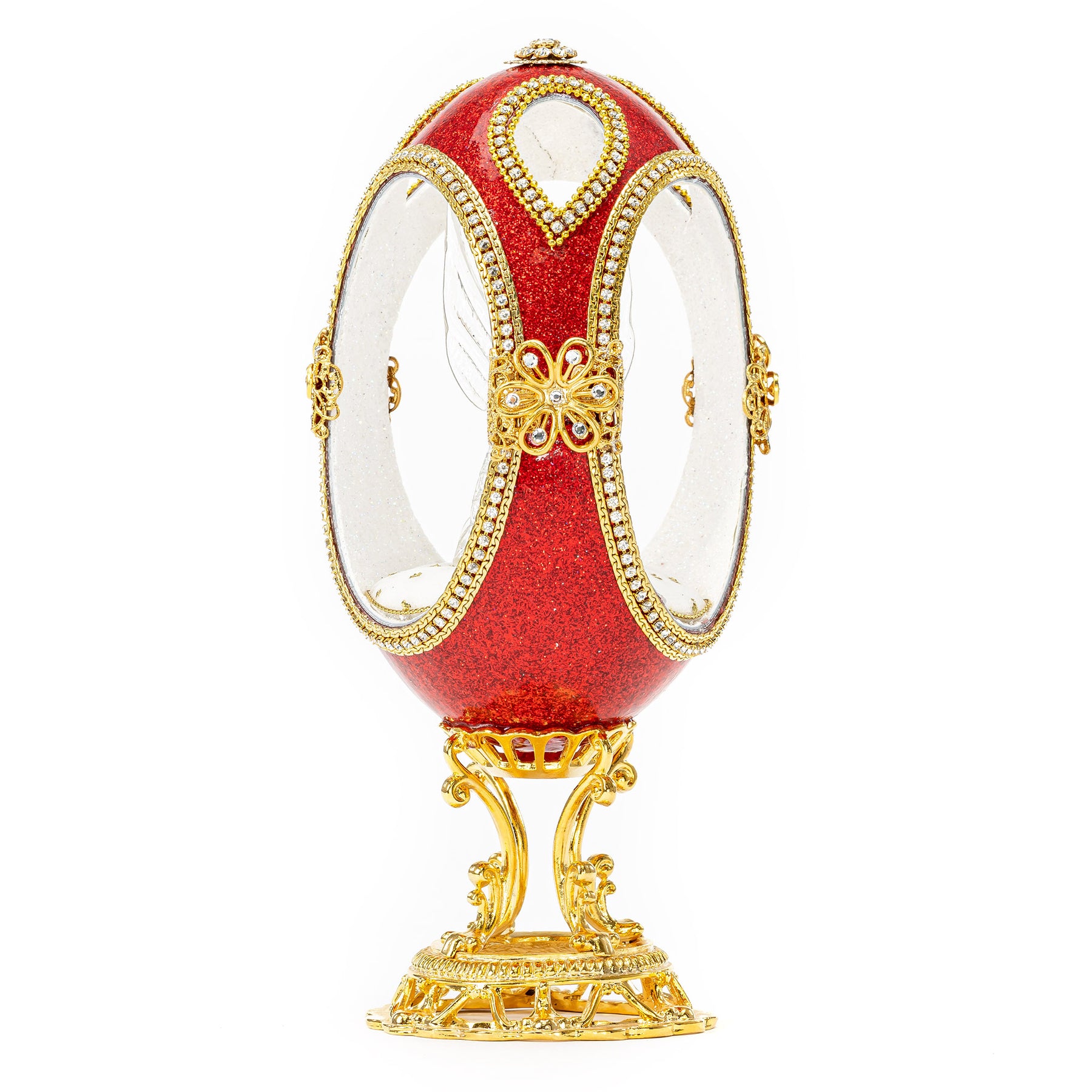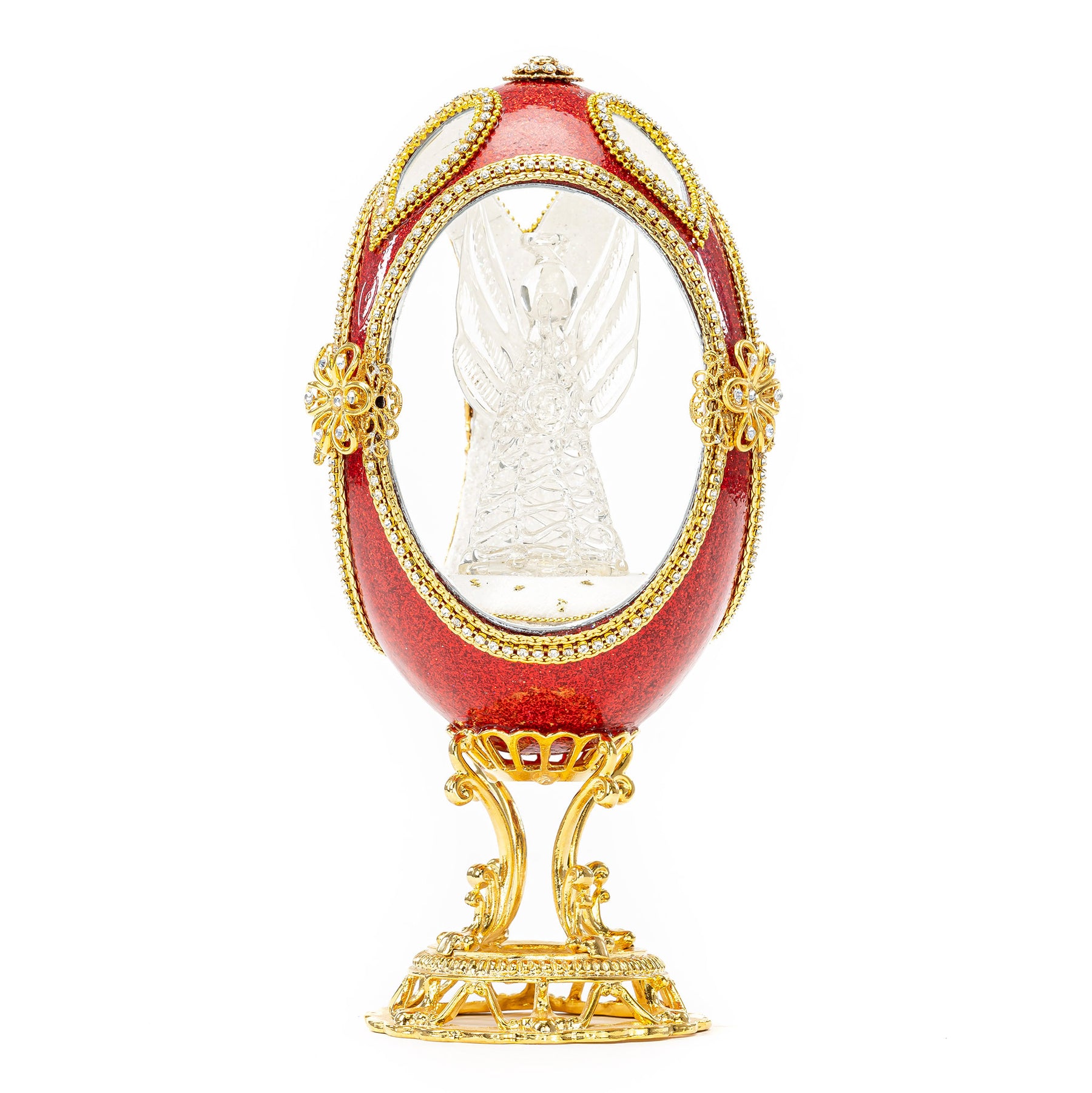 The beautiful red egg is crafted from an emu egg and features a stunning glass angel figurine. Expertly made, the angel figurine is exquisitely detailed with fine, translucent wings and a halo. The perfect addition to any art collection, this stunning egg makes a unique and eye-catching centerpiece.
