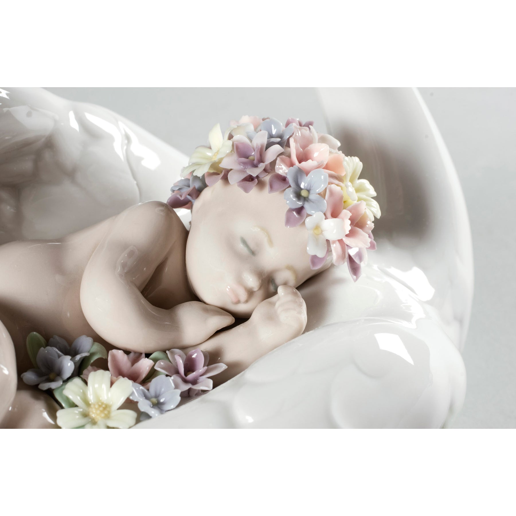 Glossy porcelain child figurine of a sleeping child on a white swan decorating his head and body with flowers of different colors.