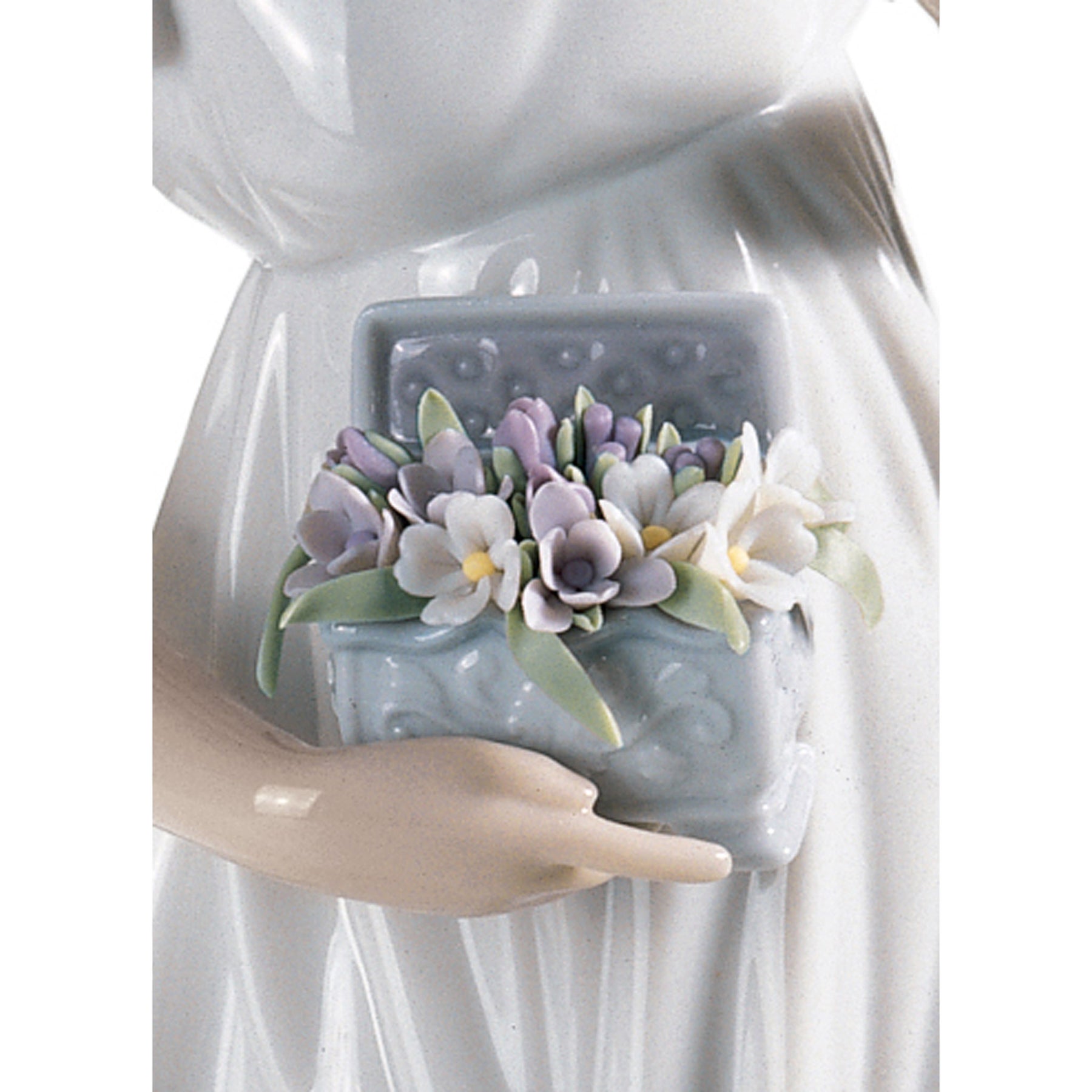 Glossy porcelain figurine of a woman in a long white dress with flower motifs in soft tones and a small box in her hand full of flowers.