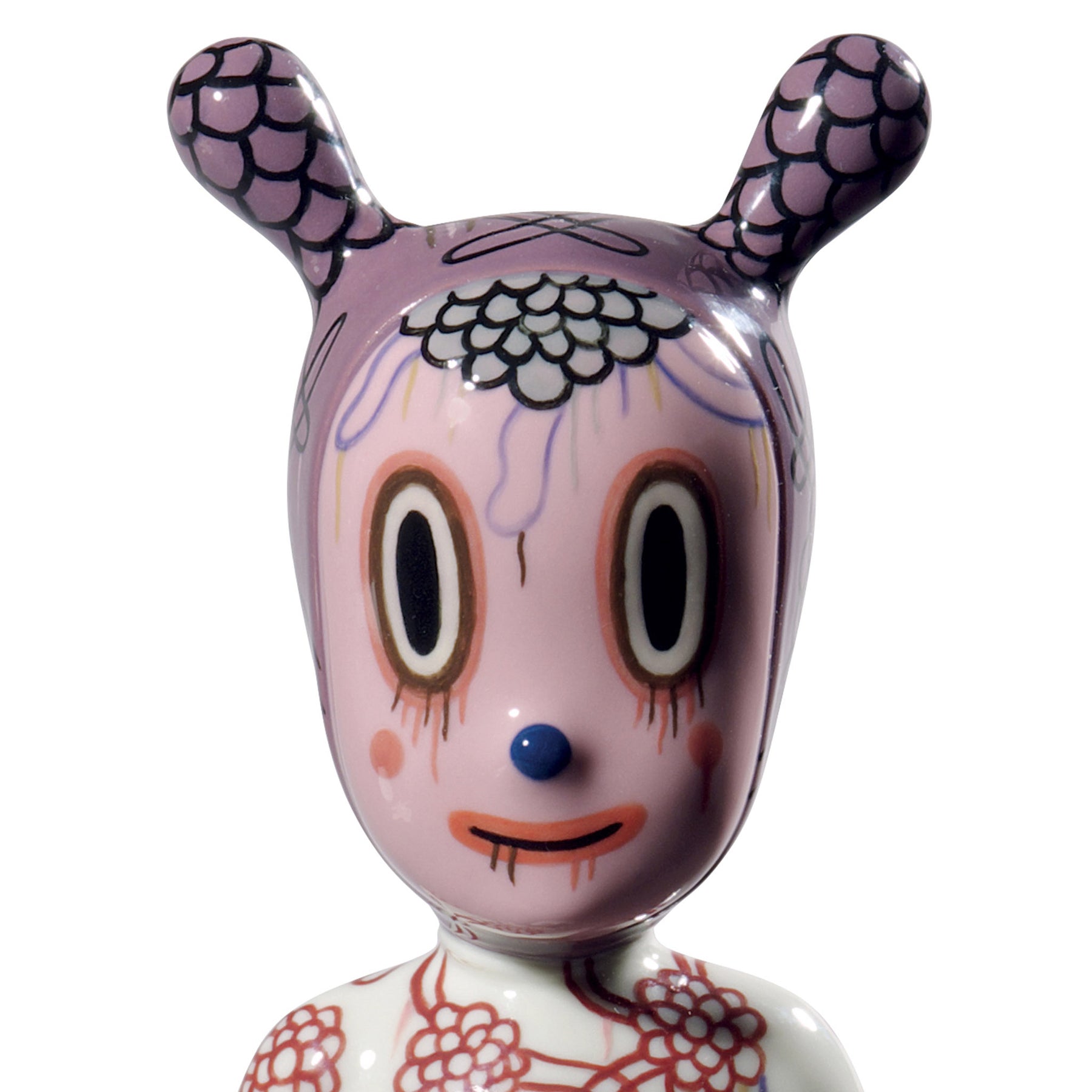 Glossy porcelain figurine in shades of pink, white and black created by Gary Baseman for the collection The Guest by Lladró Atelier with a white base attached to the piece.