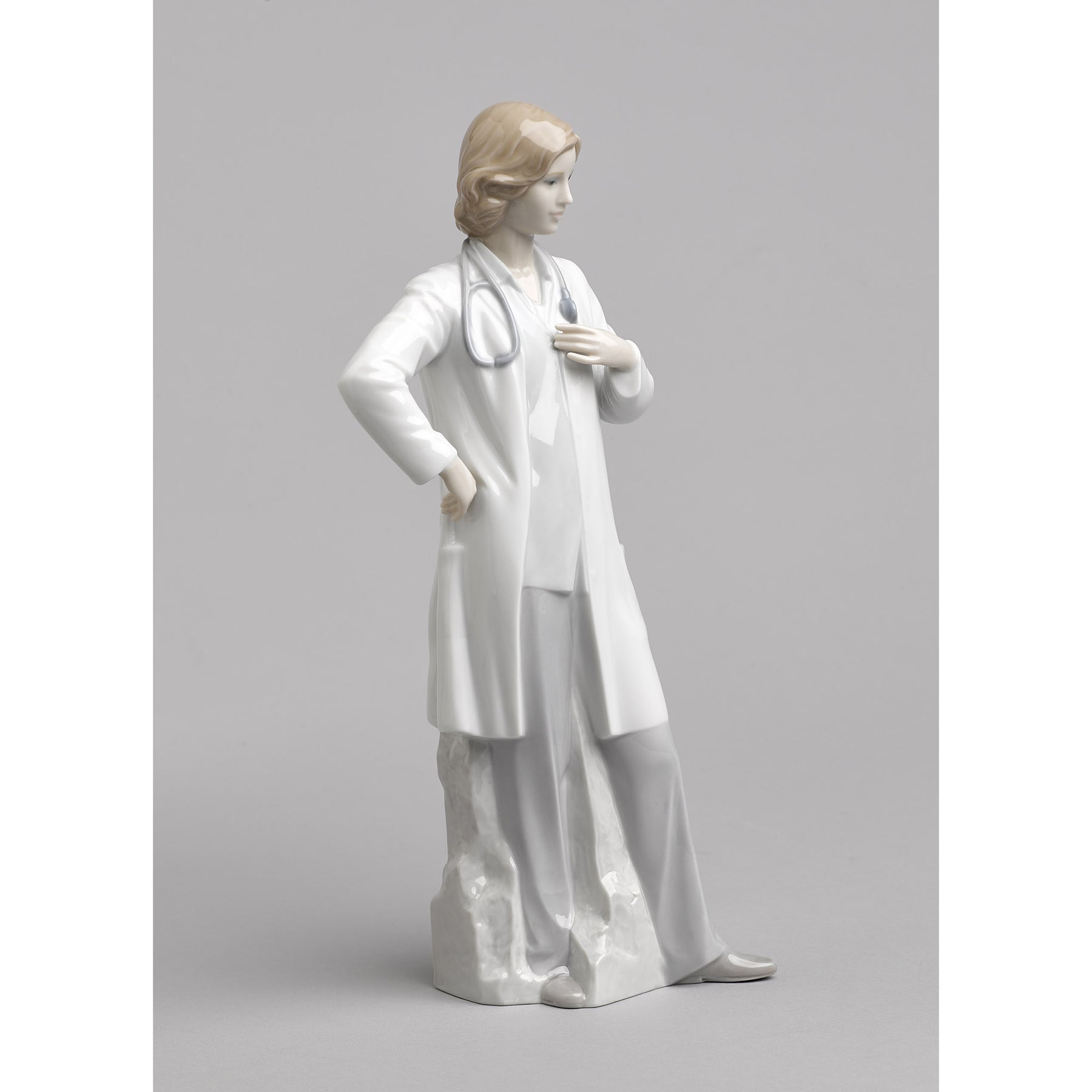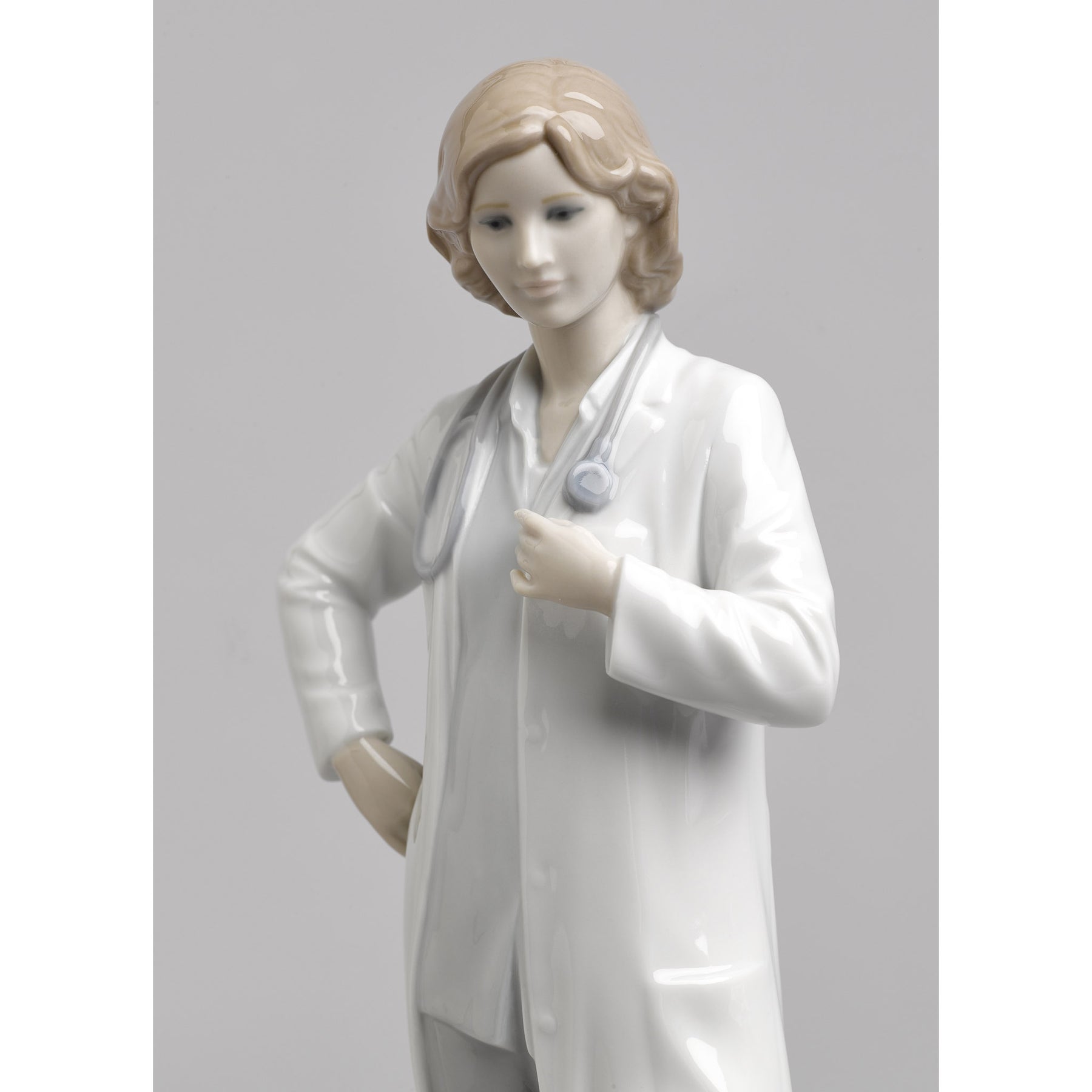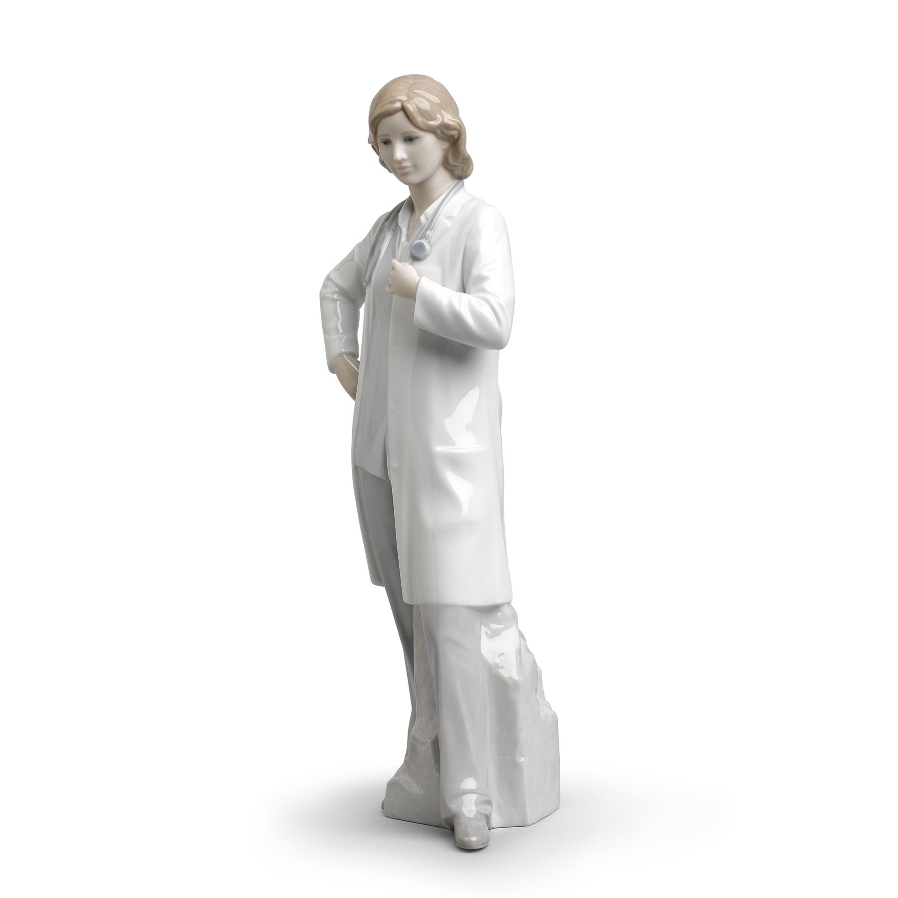 Glossy porcelain figurine of a doctor with a stethoscope around her neck and a white coat.