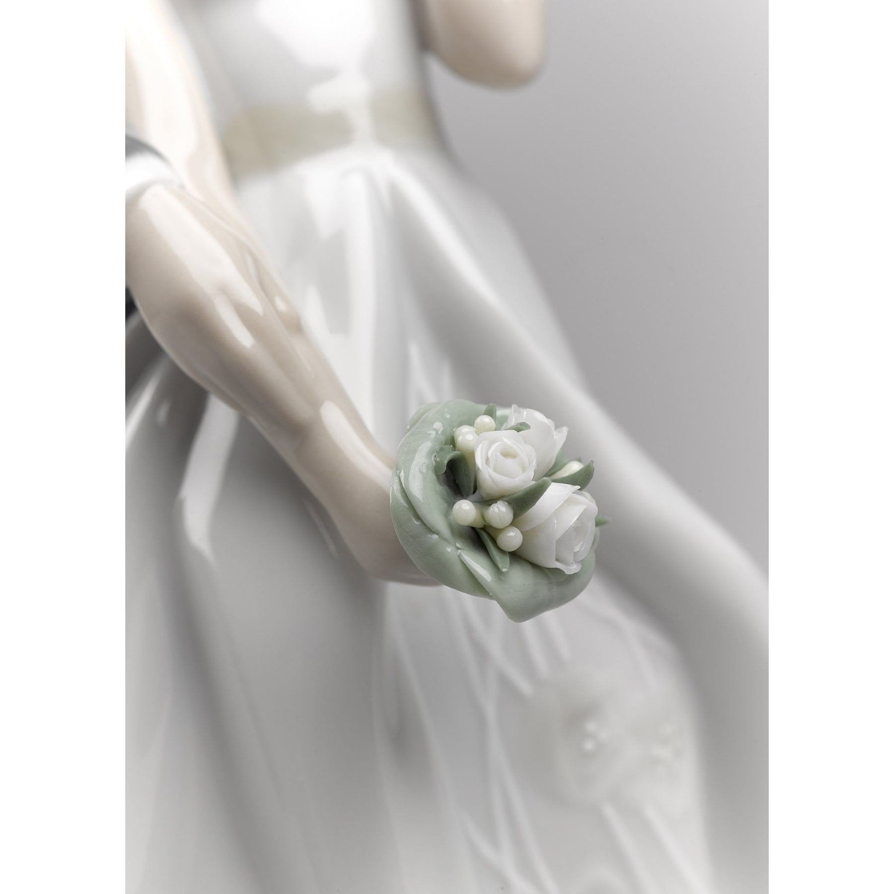 Figurine of an engaged couple in glossy porcelain, she has a bouquet of white flowers and he has a dark blue suit.