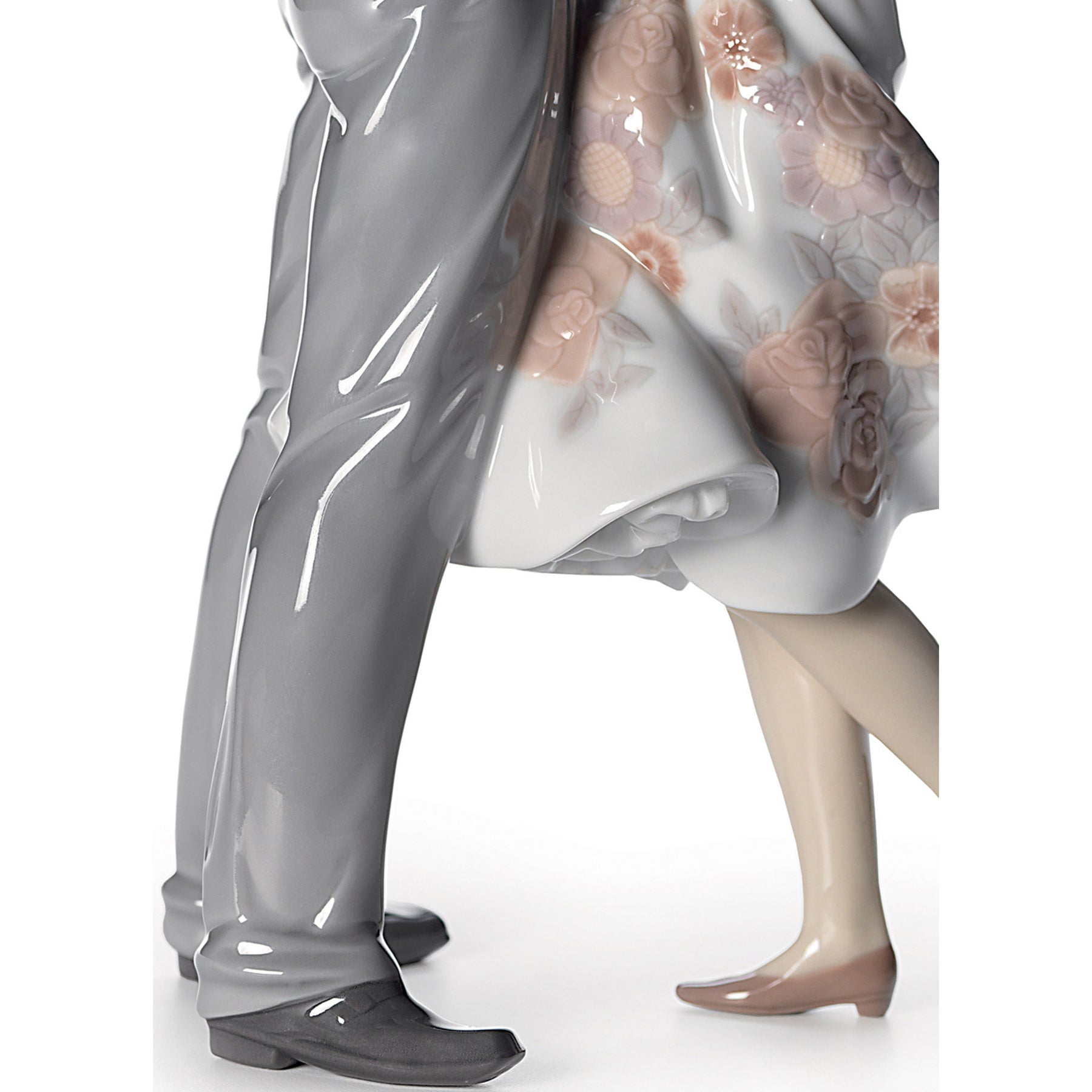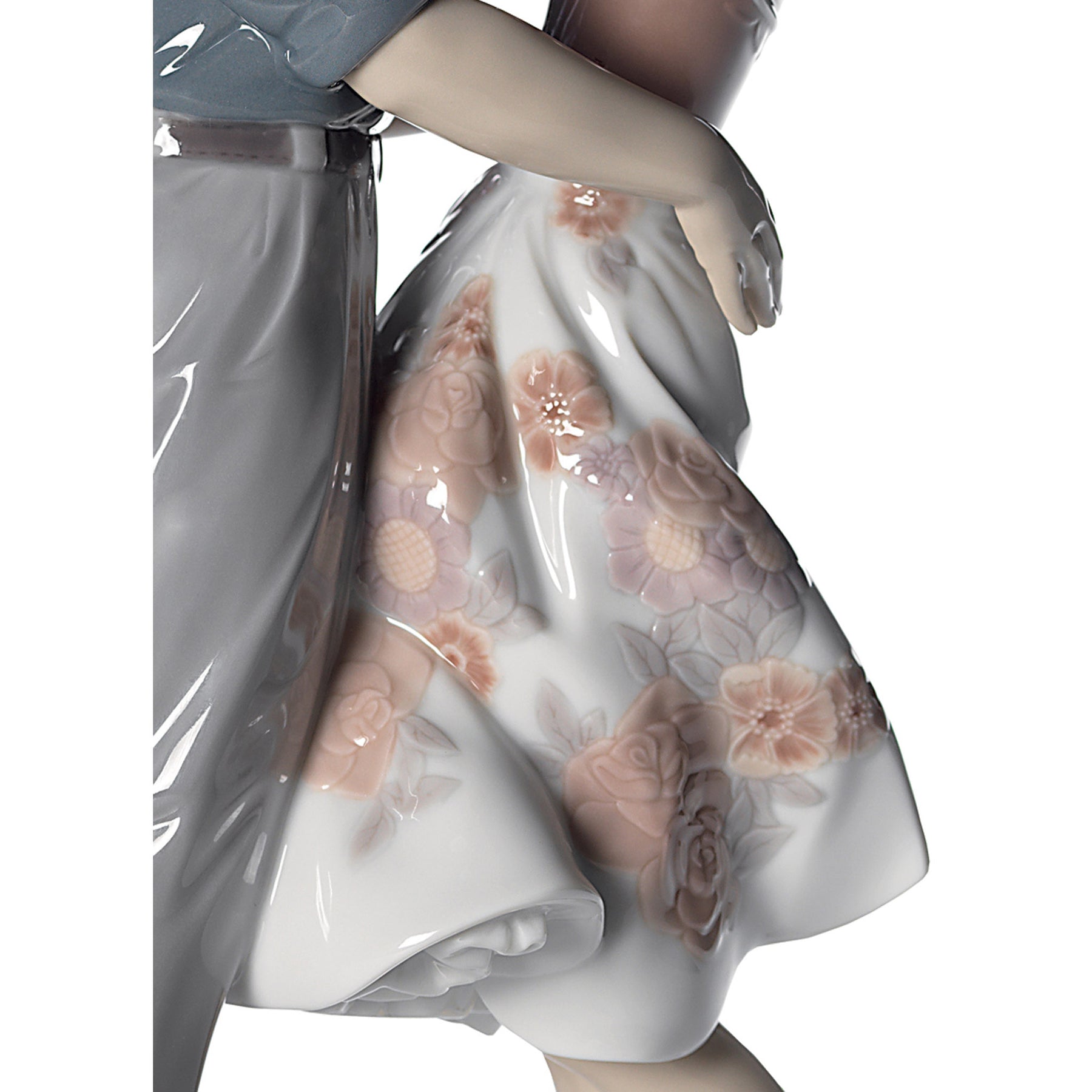 A glossy porcelain figurine of a young couple giving each other a hug in a modern outfit highlighting the floral decoration of the flying skirt.