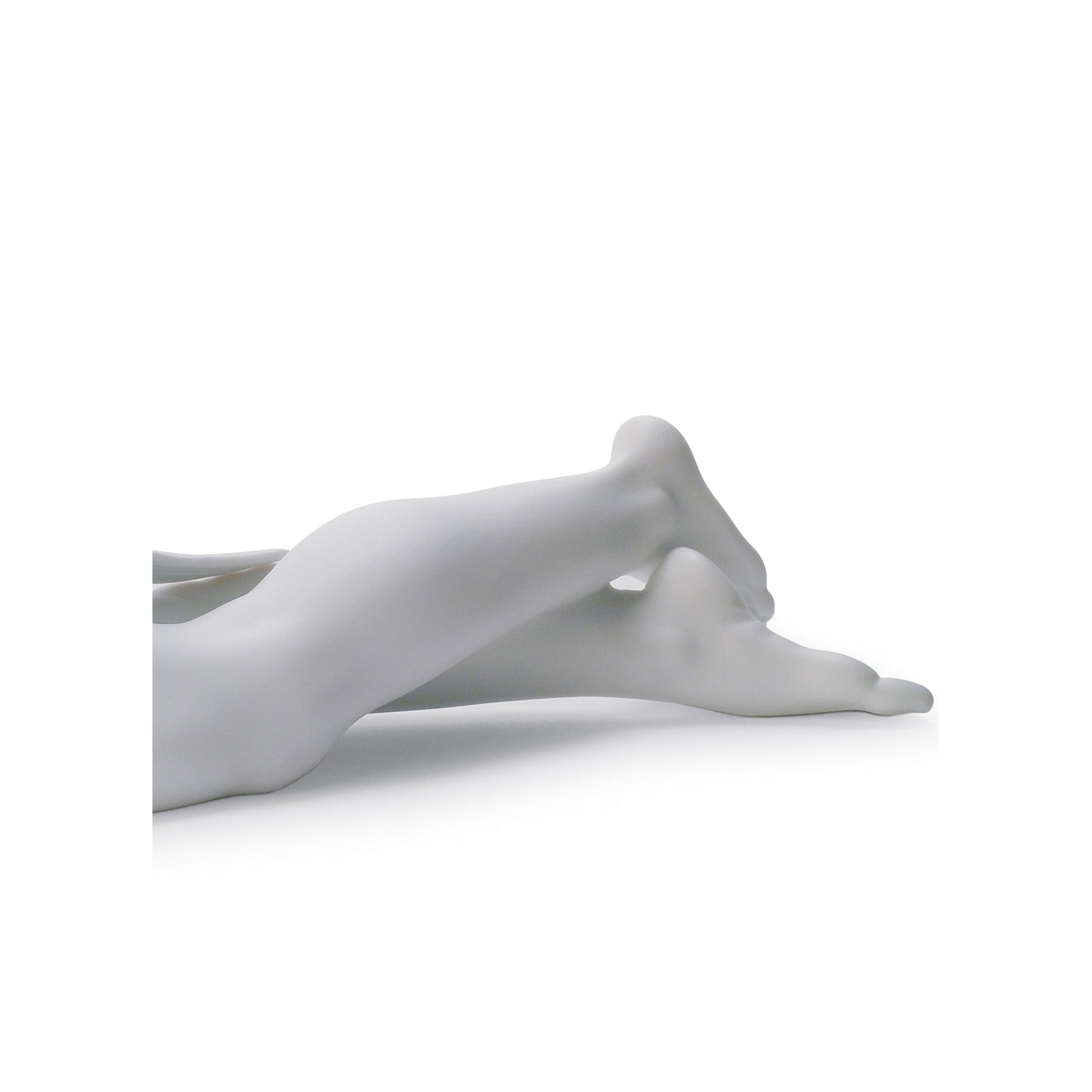 Porcelain angel figurine in the shape of a woman lying down with blue wings decorating her hair and arm with small flowers.