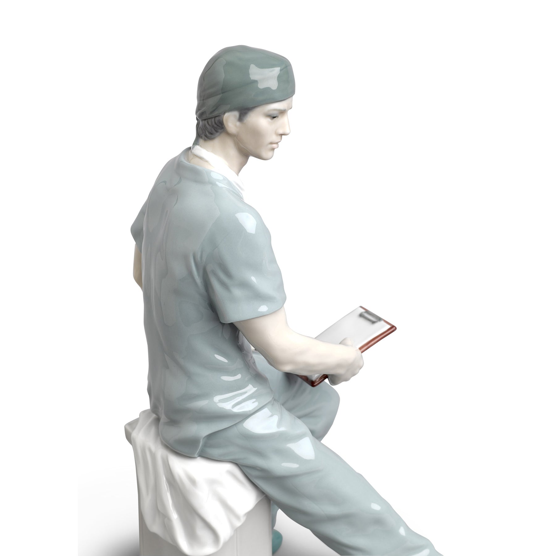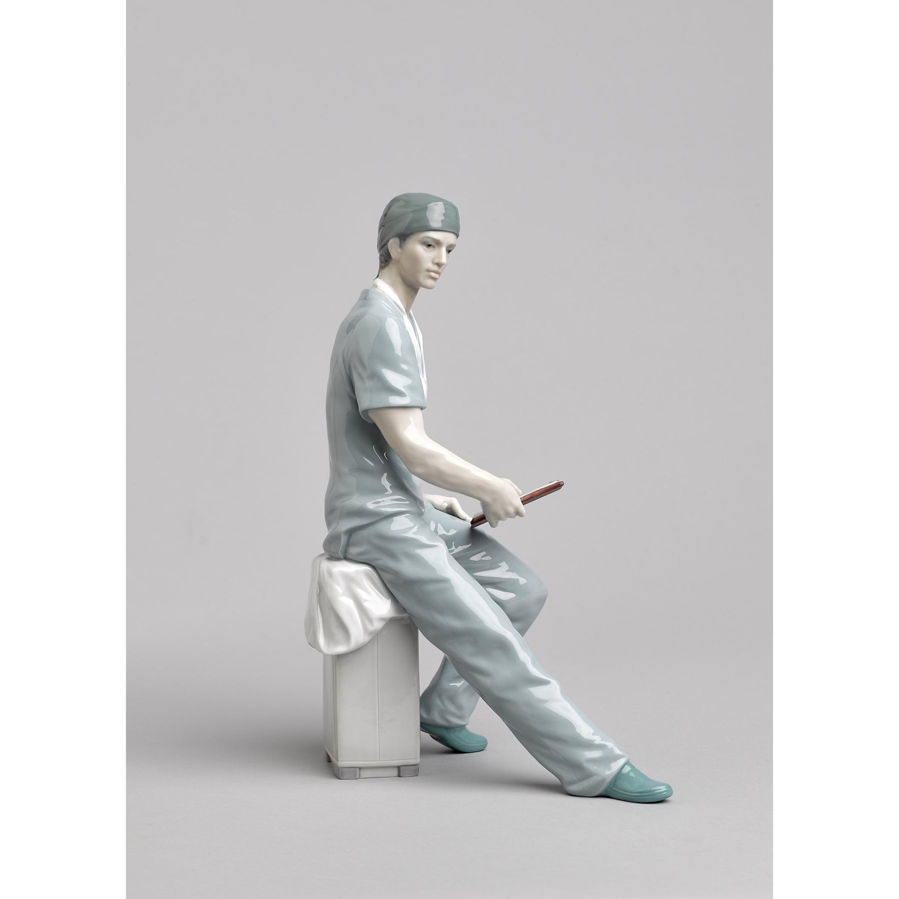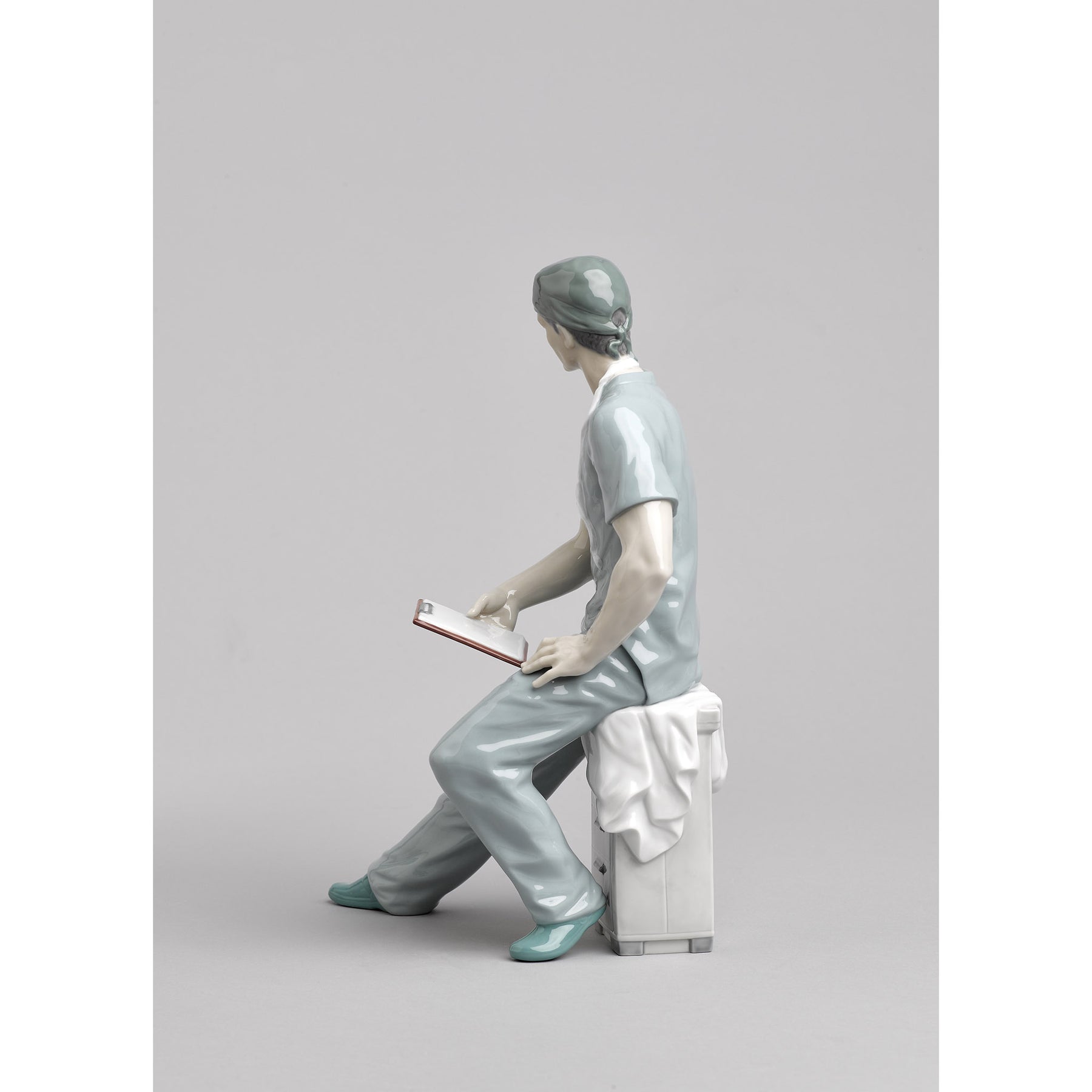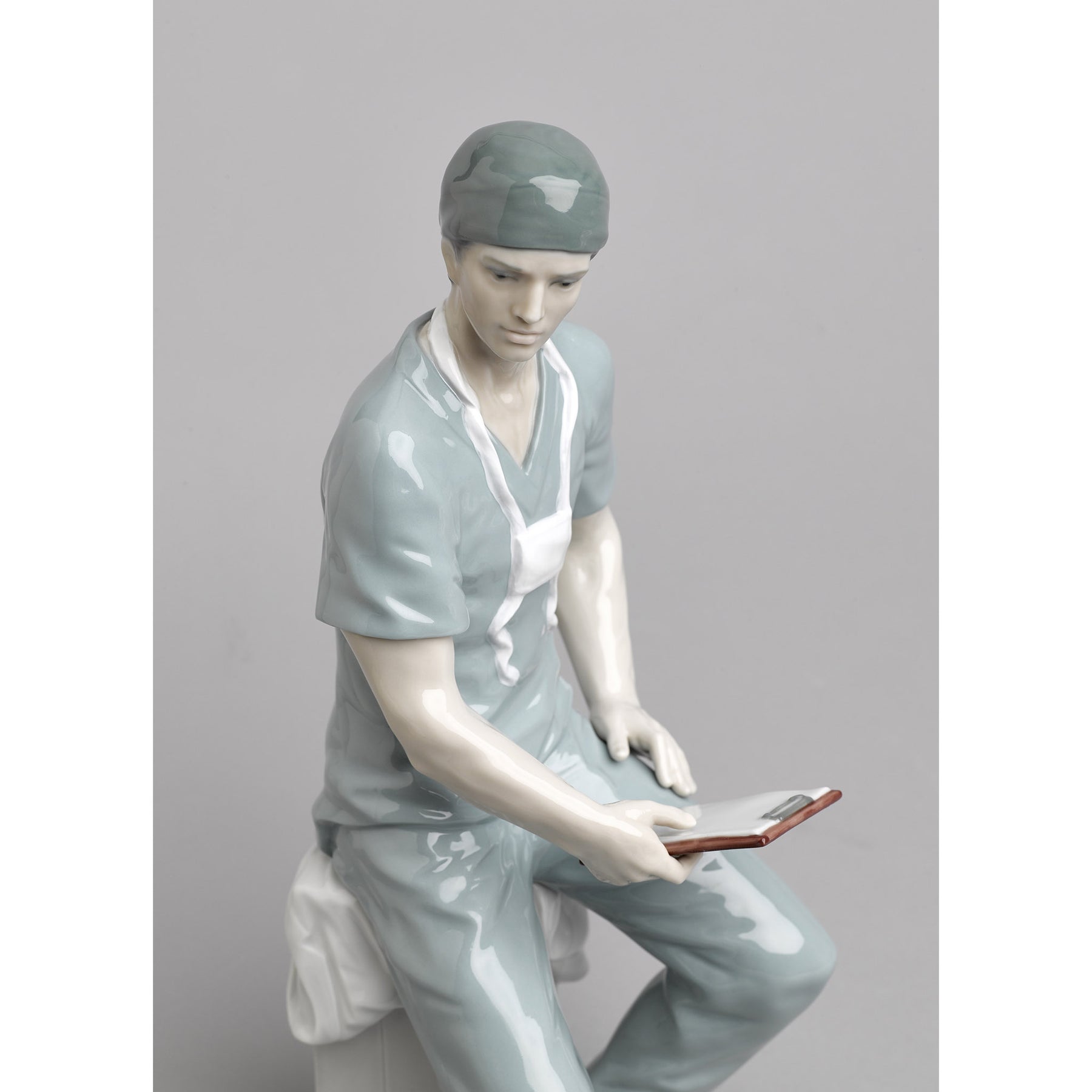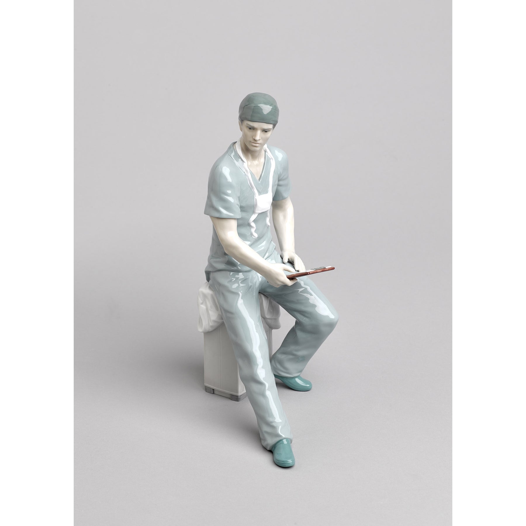 Glossy porcelain figurine of a surgeon with his green work clothes sitting on a white chest of drawers.