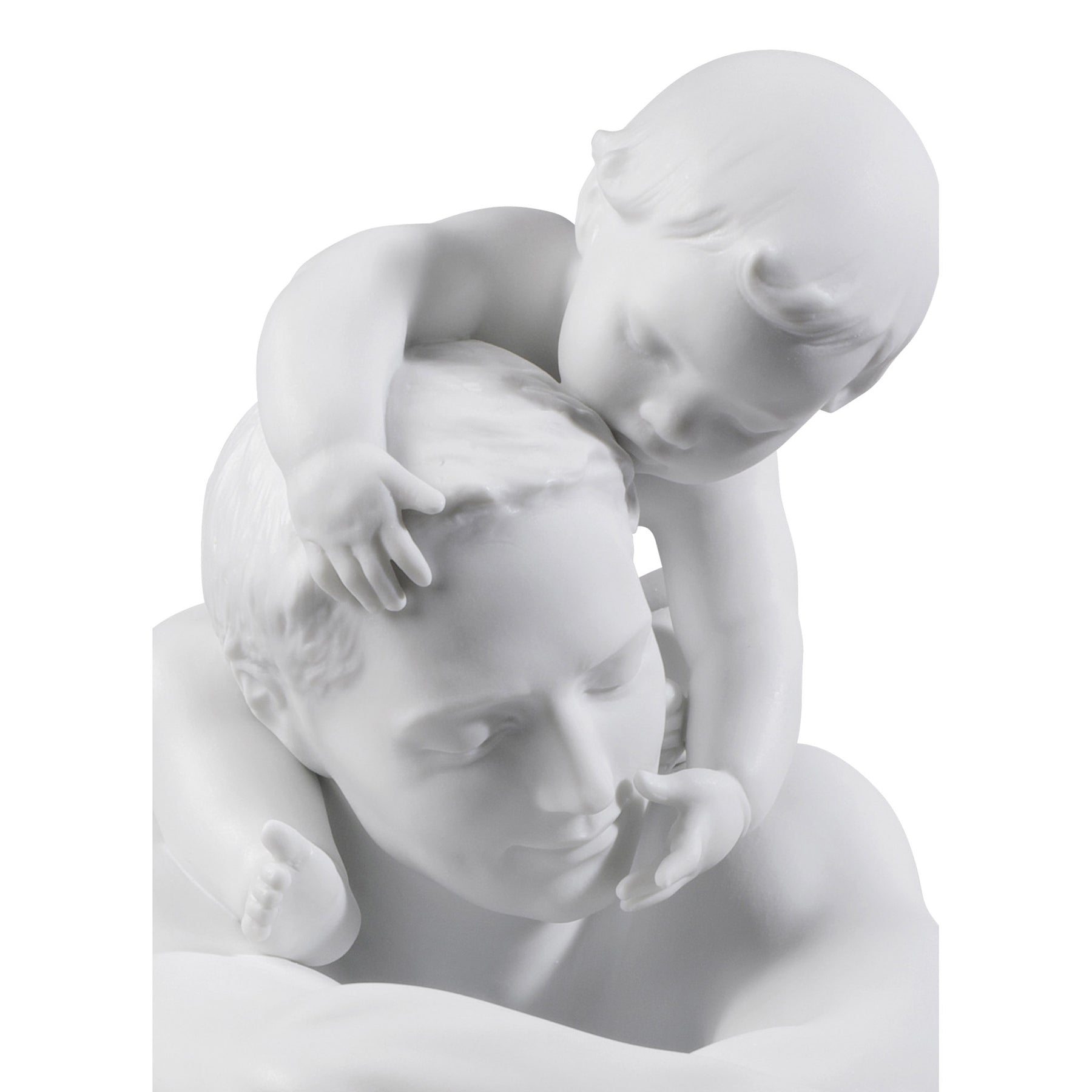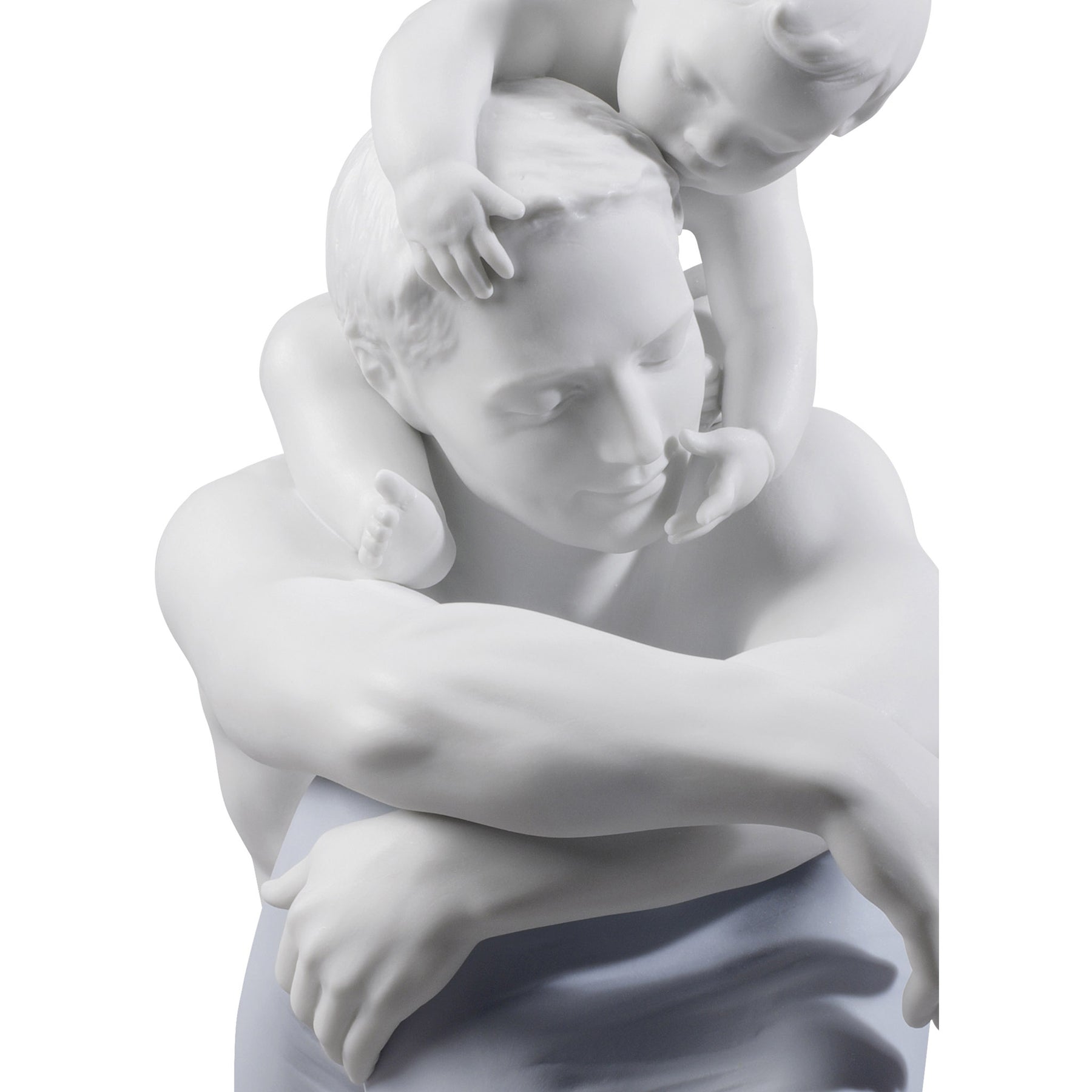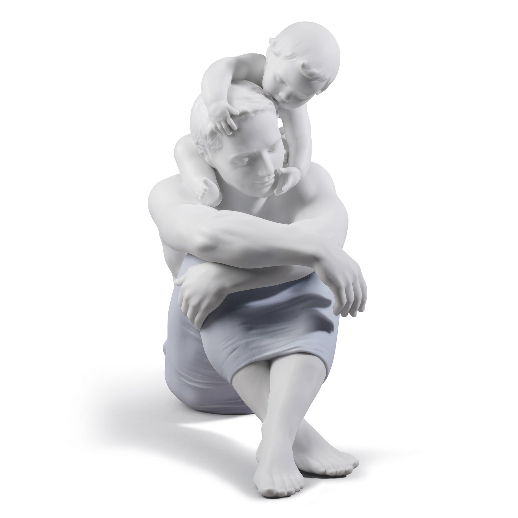 Matte white porcelain figurine of a father with his son on his shoulders decorated with soft colors.
