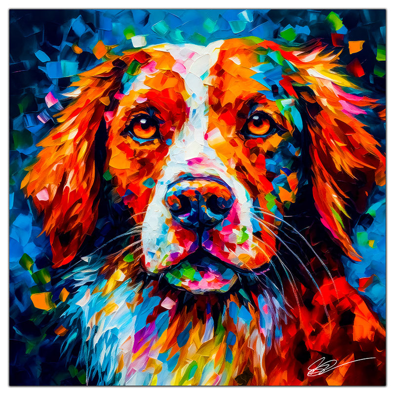 Brittany, a captivating and charming furry companion, comes to life in this exquisite palette knife painting style on stunning ChromaLuxe Metal Prints. Limited edition are artist-signed and numbered. This artwork beautifully captures the unique characteristics and personality of the Brittany, creating a lasting and modern artwork.