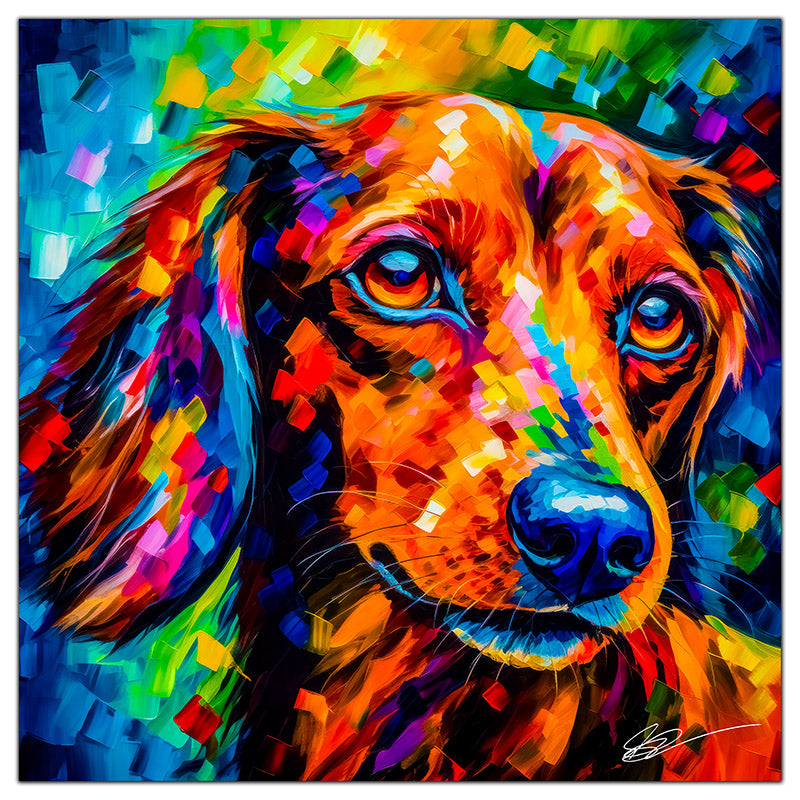 Dachshund, a captivating and charming furry companion, comes to life in this exquisite palette knife painting style on stunning ChromaLuxe Metal Prints. Limited edition are artist-signed and numbered. This artwork beautifully captures the unique characteristics and personality of the Dachshund, creating a lasting and modern artwork.