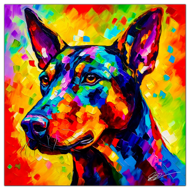 Colorful Dobermann portrait in modern art style, perfect for home decor.