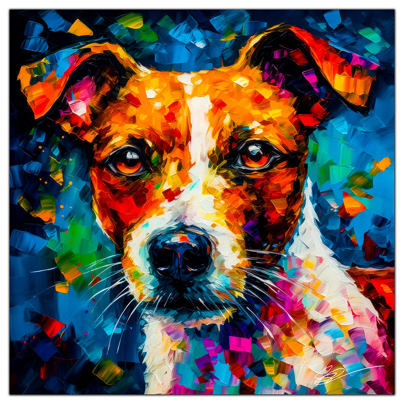 "Jack Russell 06" captures the fearless and energetic nature of this beloved breed through an expressive palette knife painting technique. The breed’s bright eyes, compact build, and playful stance are beautifully depicted, making this artwork a delightful addition to any collection.