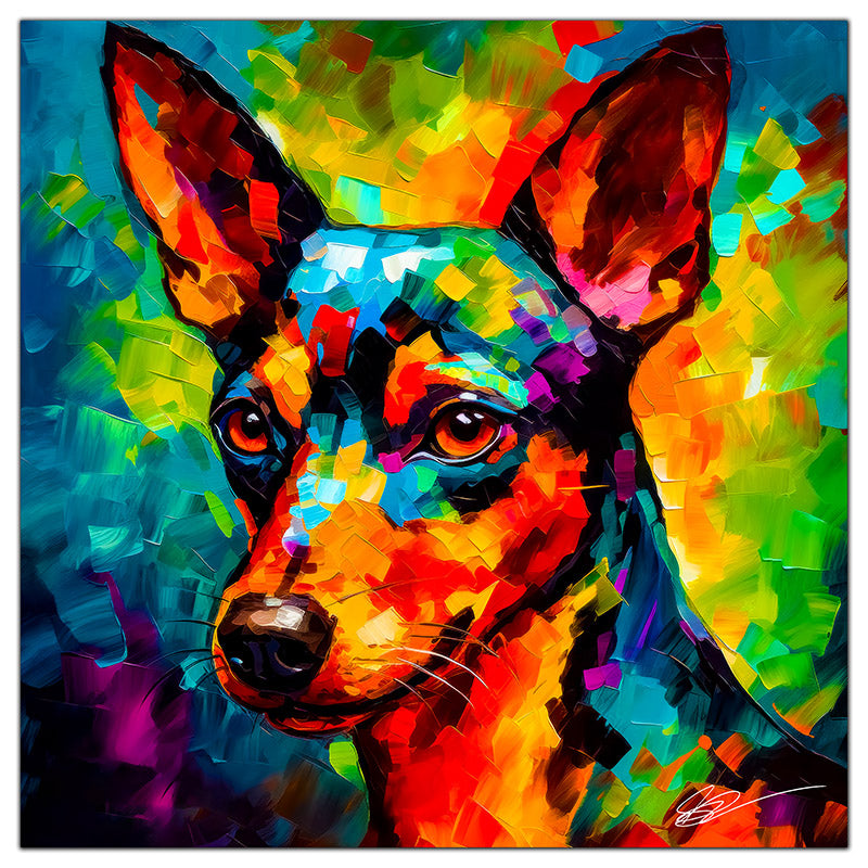"Miniature Pinscher 01" captures the bold and spirited nature of this beloved breed through a striking palette knife painting technique. The breed’s sleek body, upright ears, and expressive stance are masterfully depicted, making this artwork a perfect addition for any dog lover.