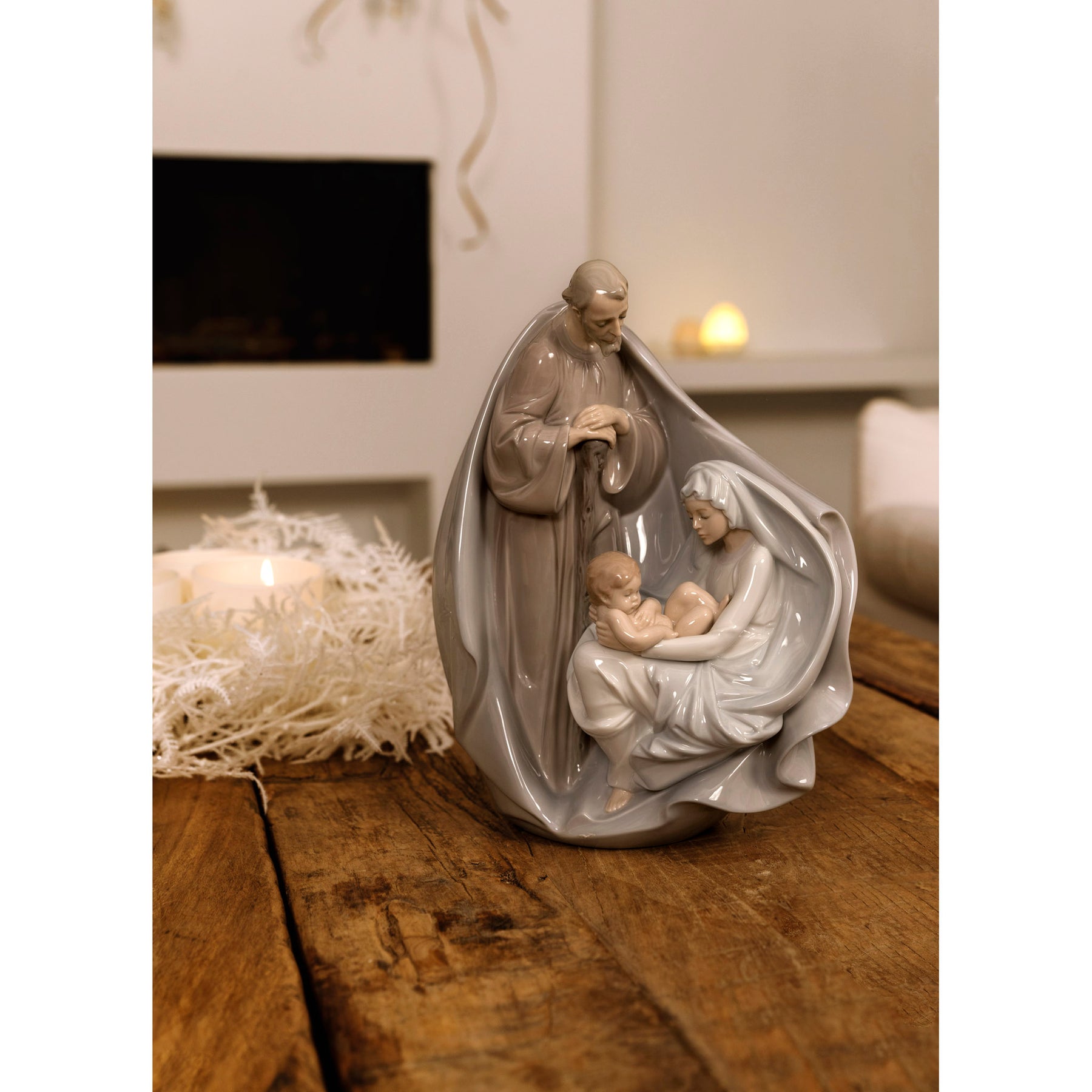 Glossy porcelain figurine of Jesus' birth on a grey canvas background.