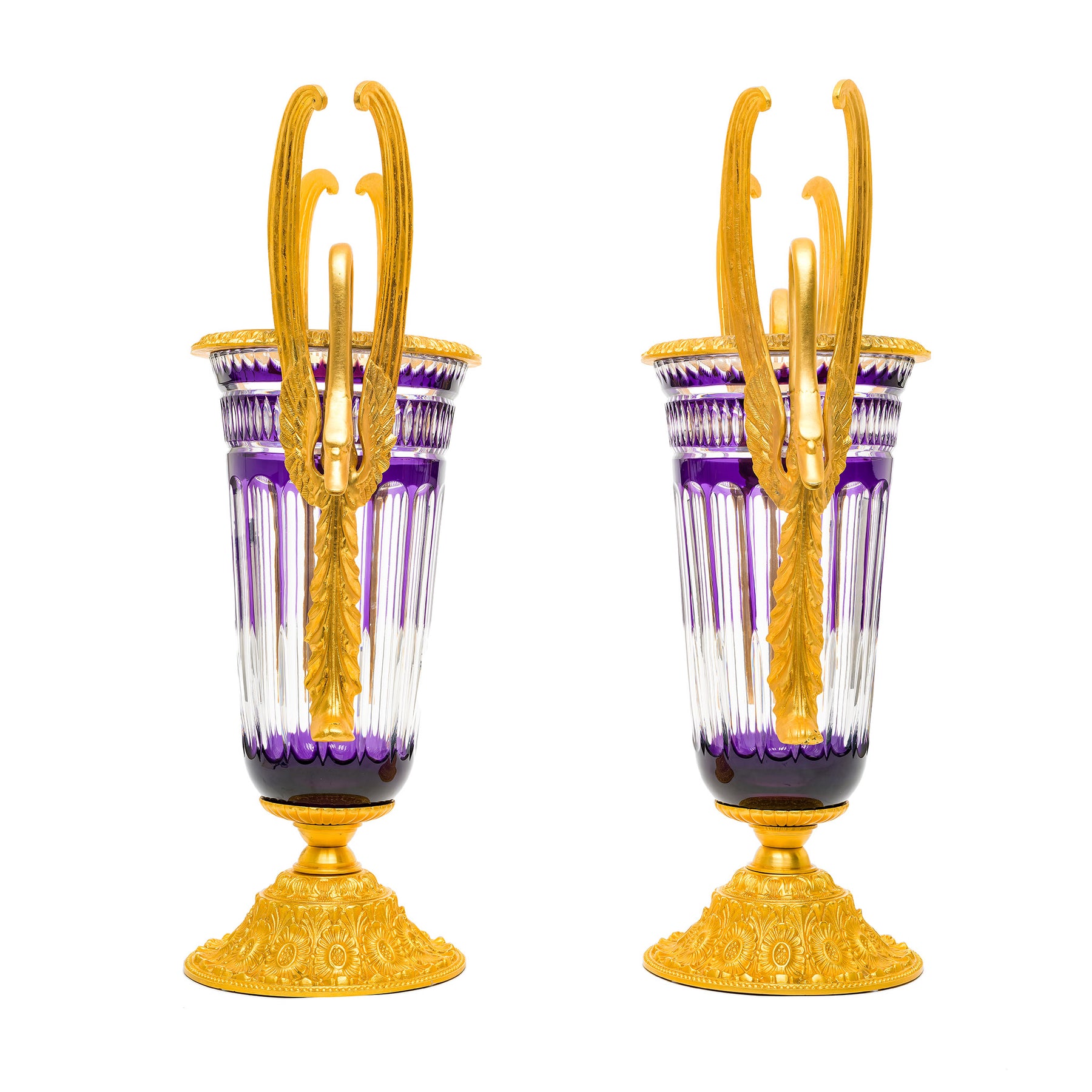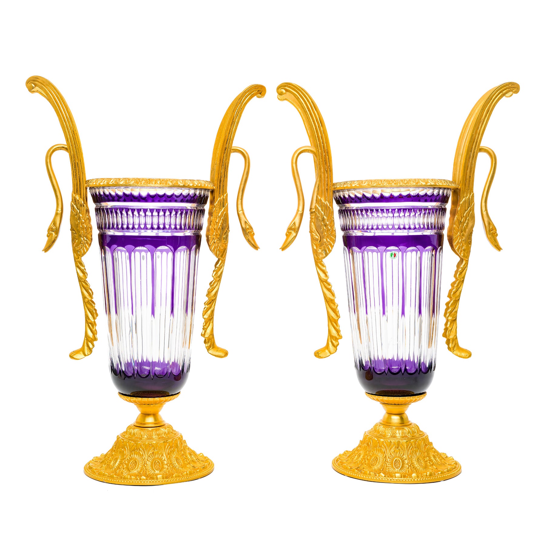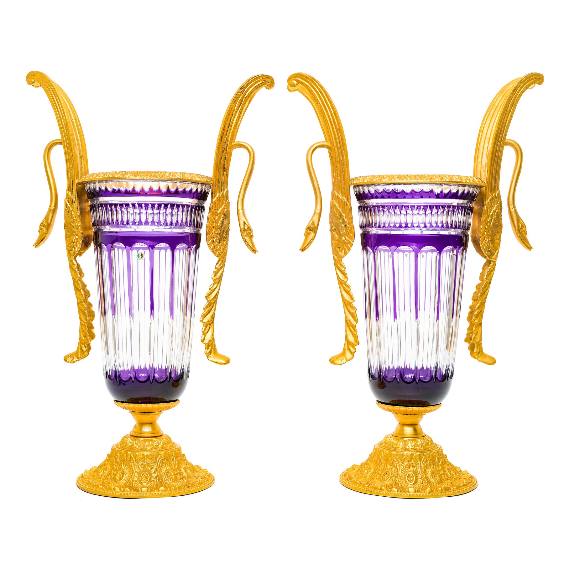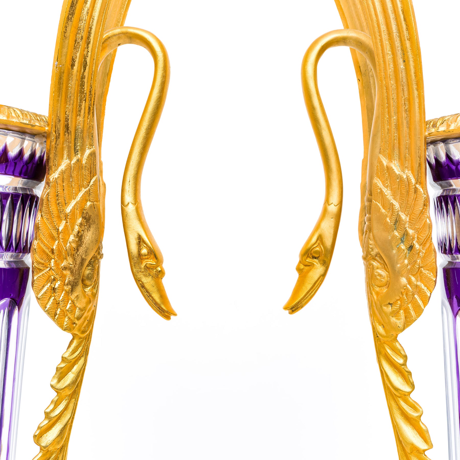 Adorned with intricate dore bronze detailing, these vases embody classic opulence. The gracefully curved swan-shaped handles add an air of aristocratic charm, while the richly decorated gilded bases provide contrast and stability. The warm gold tones complement the cool amethyst crystal, making these vases a true statement of luxury and timeless elegance.