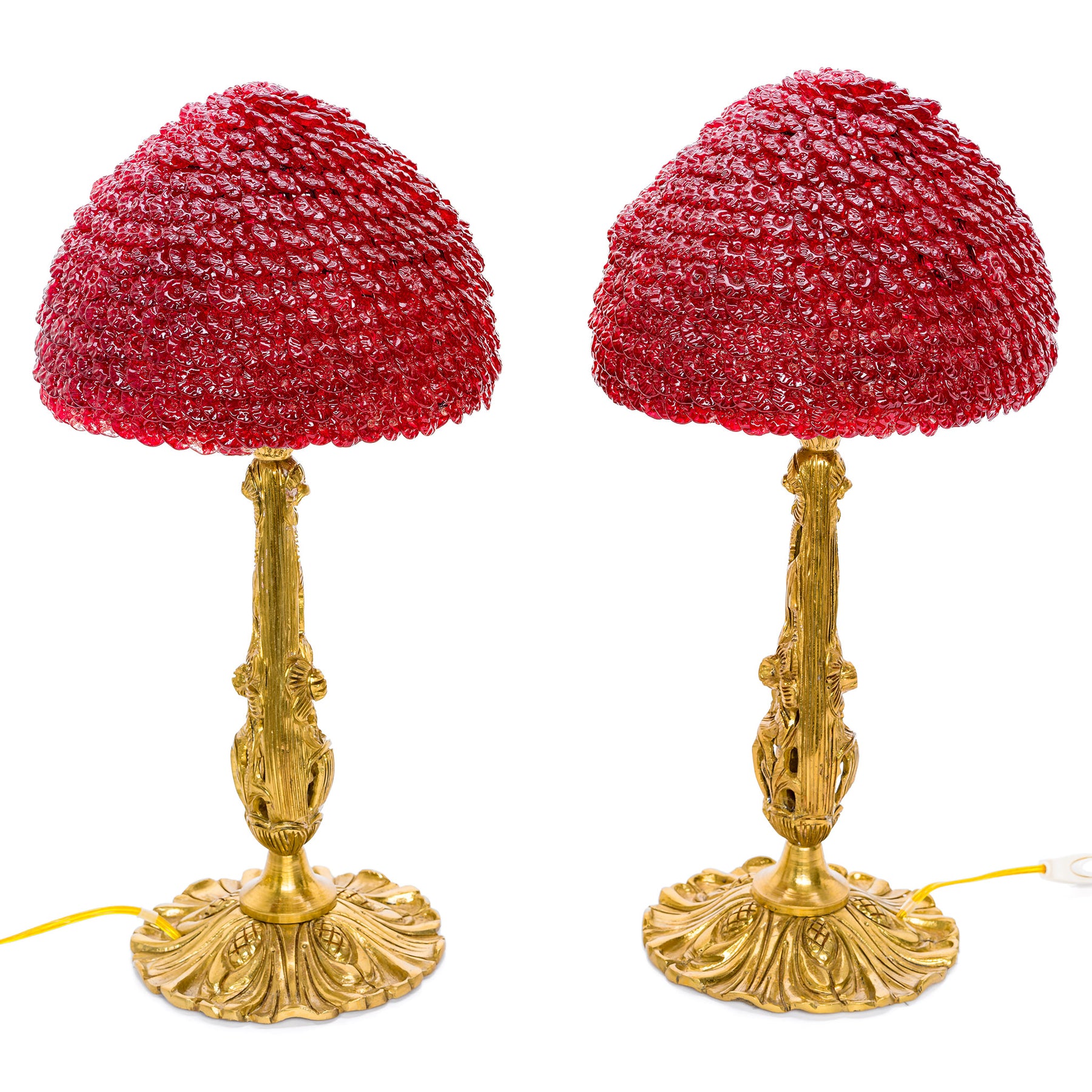 Each lamp features a dore bronze base with intricate foliate motifs, topped with a vibrant red crystal shade that enhances the lighting effect.
