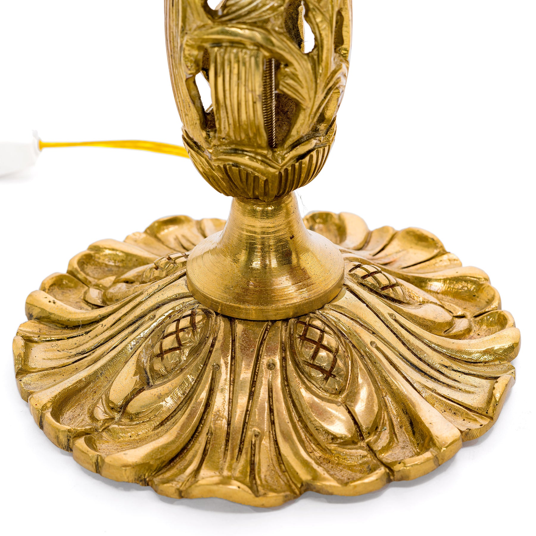 Each lamp is grounded upon an intricately crafted dore bronze base, adorned with elegant foliate motifs. This regal touch amplifies the vintage-inspired aesthetic, lending an air of grandeur to the overall design.