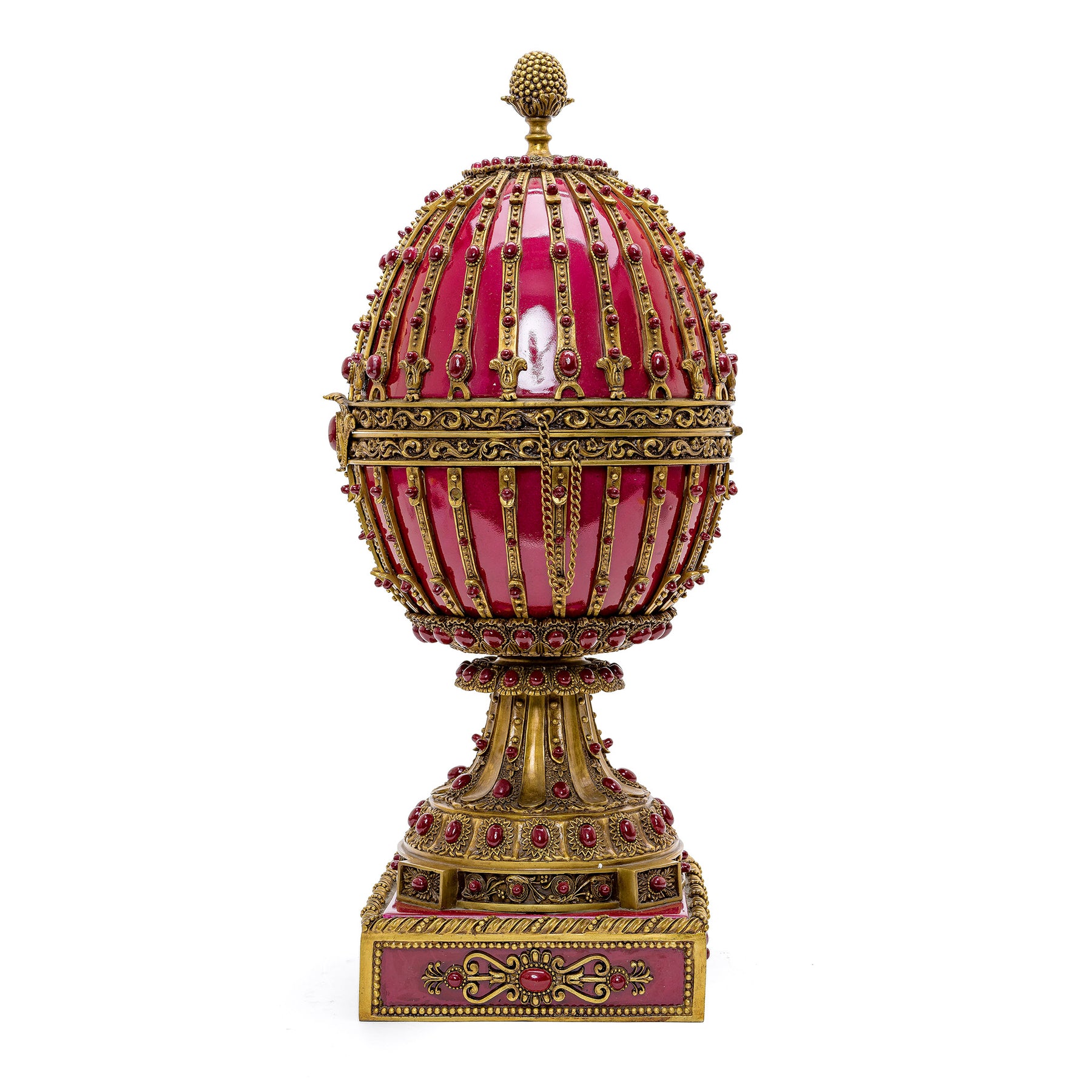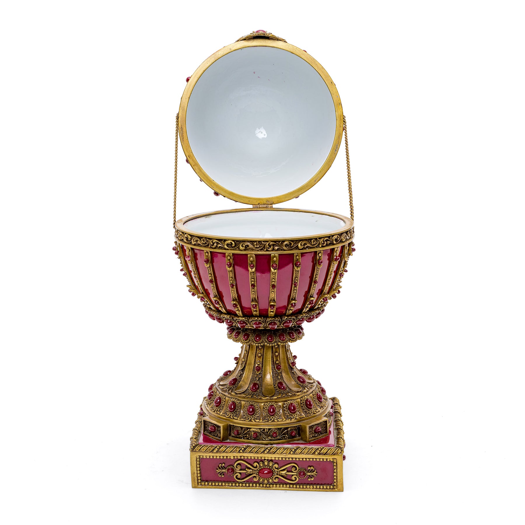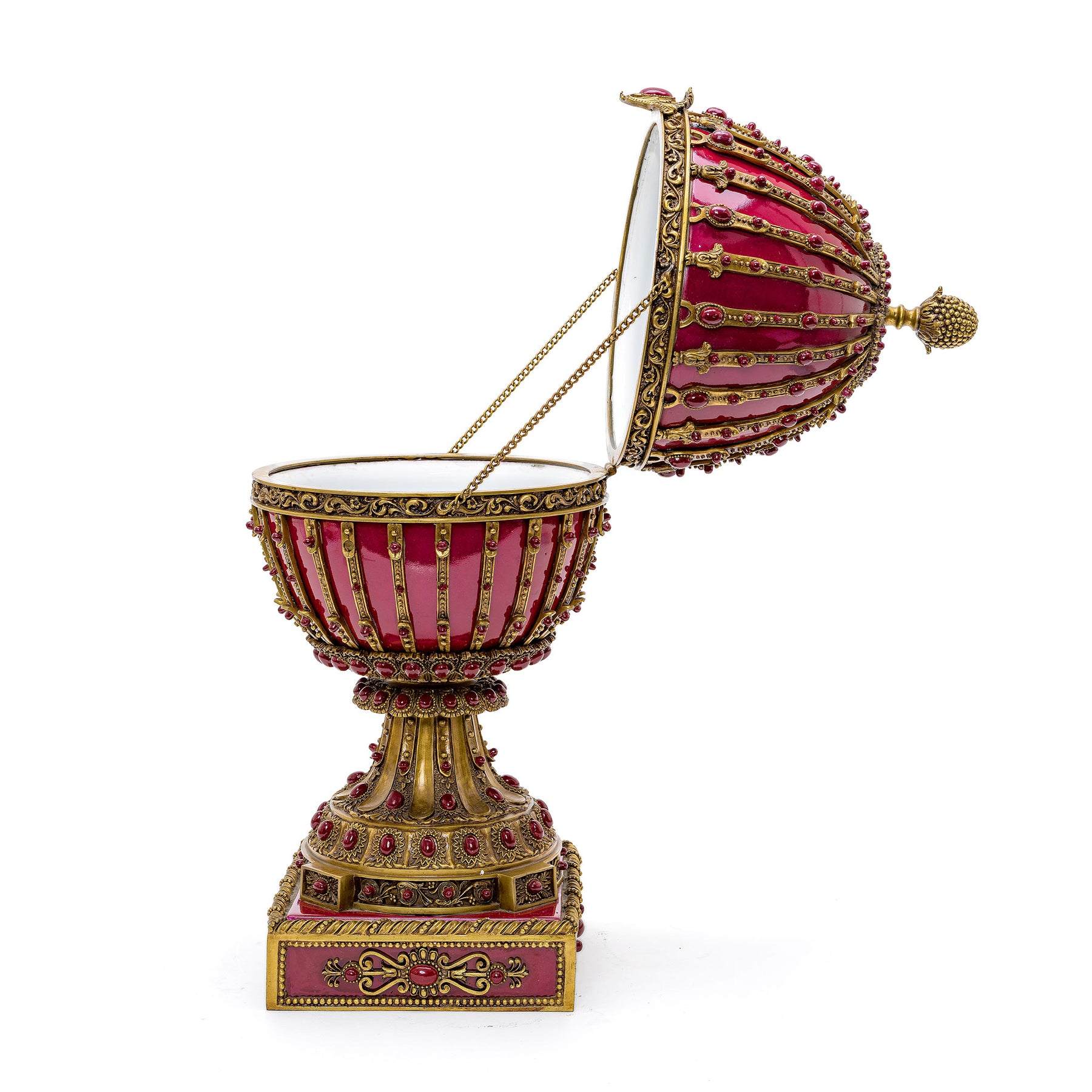 Experience the grandeur of old-world craftsmanship with this Red Porcelain Egg with Doré Bronze Accents. Mounted on a stately pedestal, this piece exudes royal elegance, adorned with shimmering cabochons and gleaming gold details.