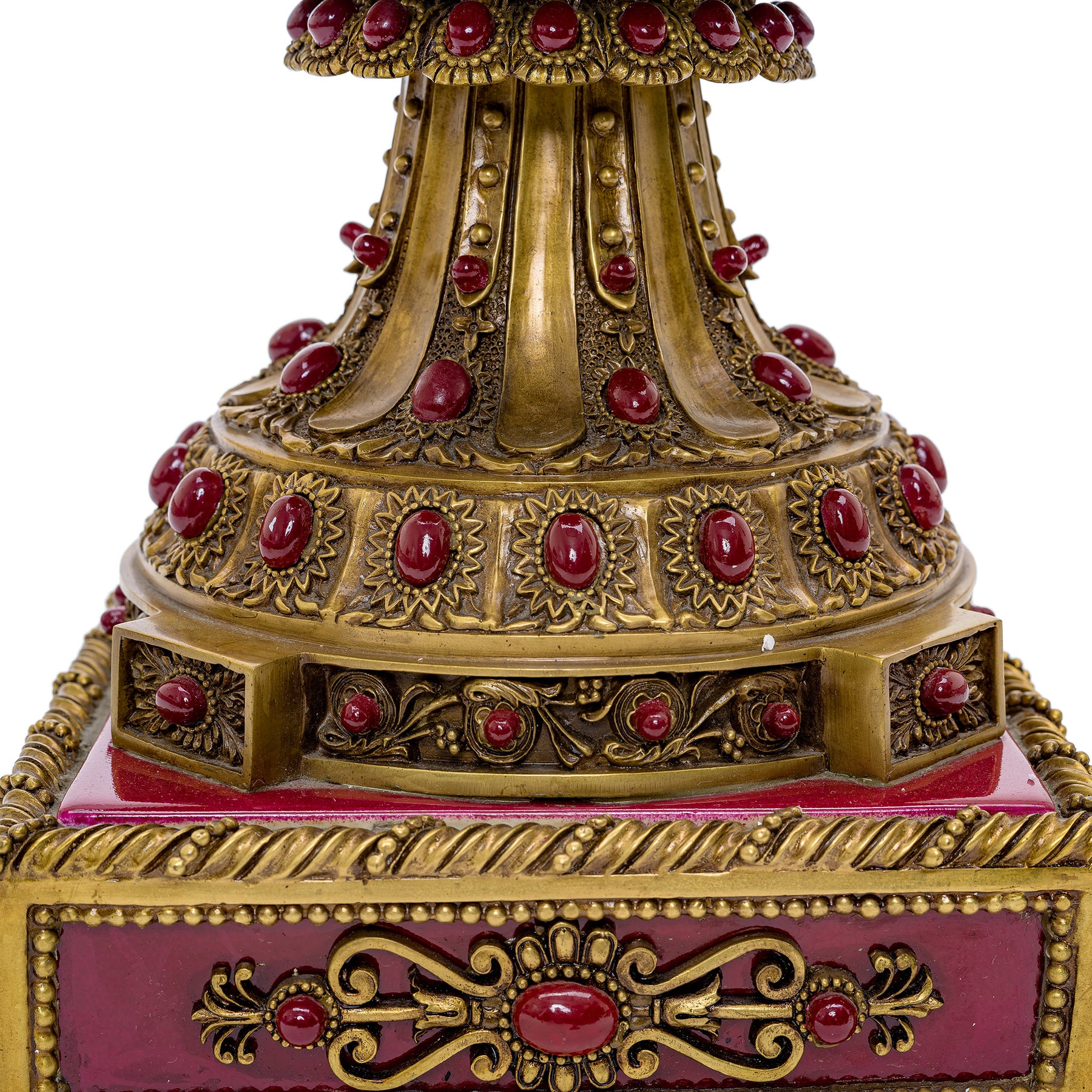 The rich red porcelain contrasts beautifully with the radiant doré bronze, creating a visual masterpiece. The cabochon embellishments catch the light, adding an extra touch of splendor.